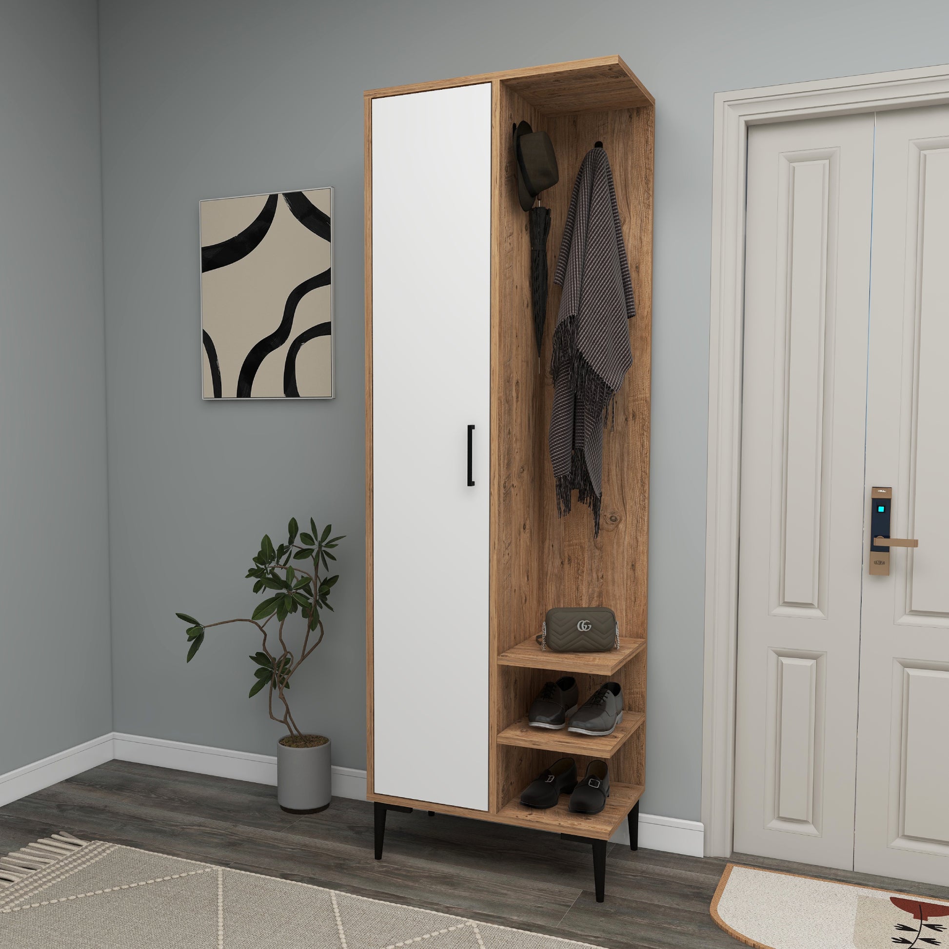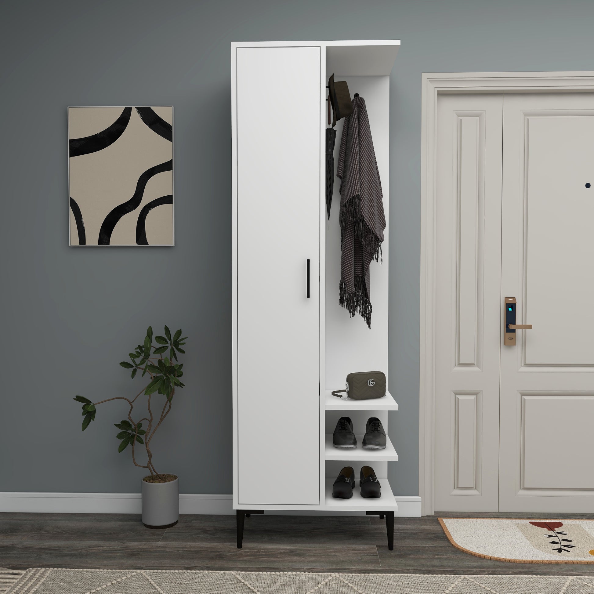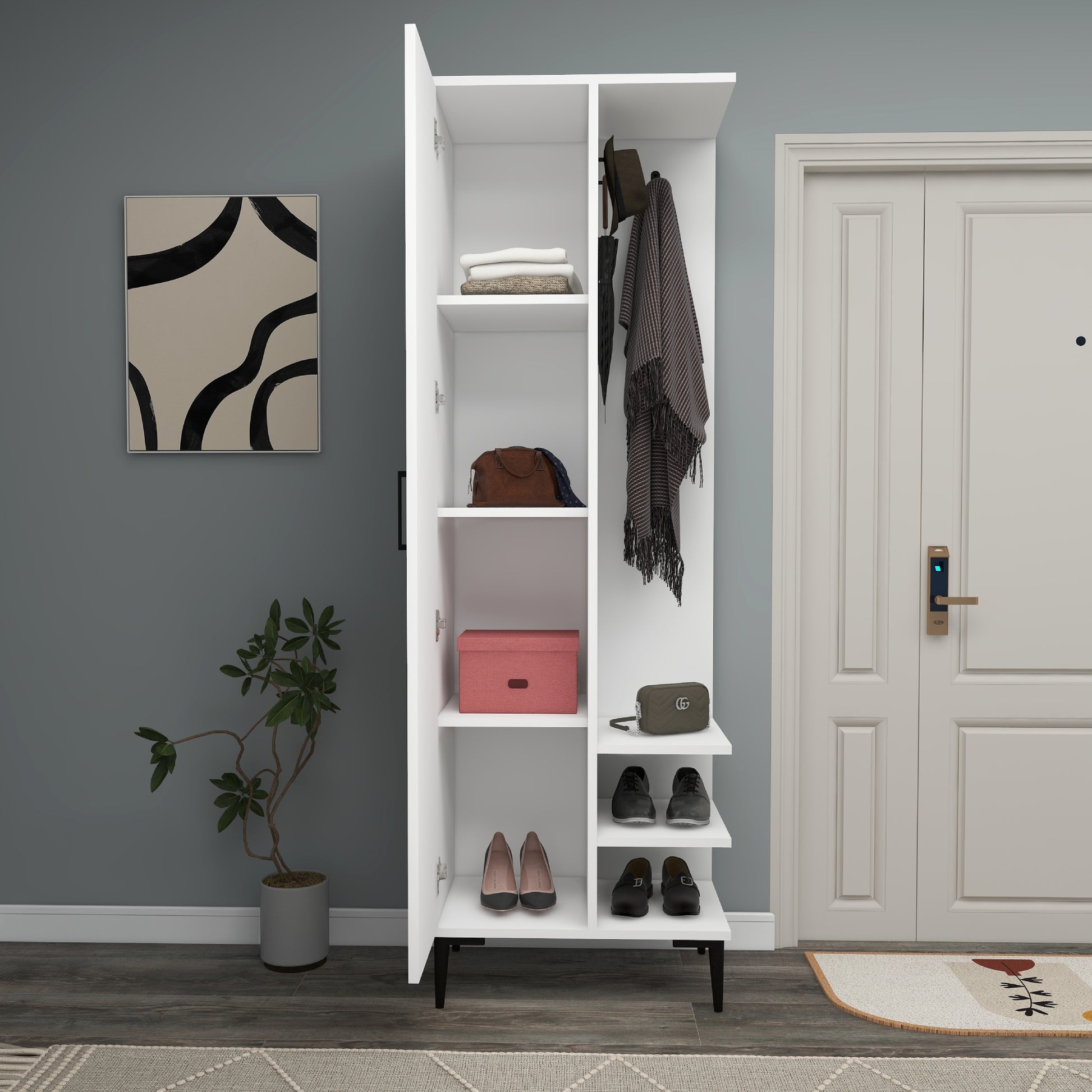 Modern Hallway Coat Rack – the ultimate solution to elevate your entryway organization. With its three-tier open shelves, this coat rack offers a stylish display for your shoes, bags, and other essentials, creating an inviting and clutter-free space. The innovative design includes a cabinet with four interior shelves, allowing you to keep your items neatly stored and concealed. Complete with three sturdy metal hooks- you can easily hang coats, hats, and scarves, making it a practical addition to any hallway. Embrace the modern elegance of our Hallway Coat Rack and upgrade your entryway with seamless style and functionality.