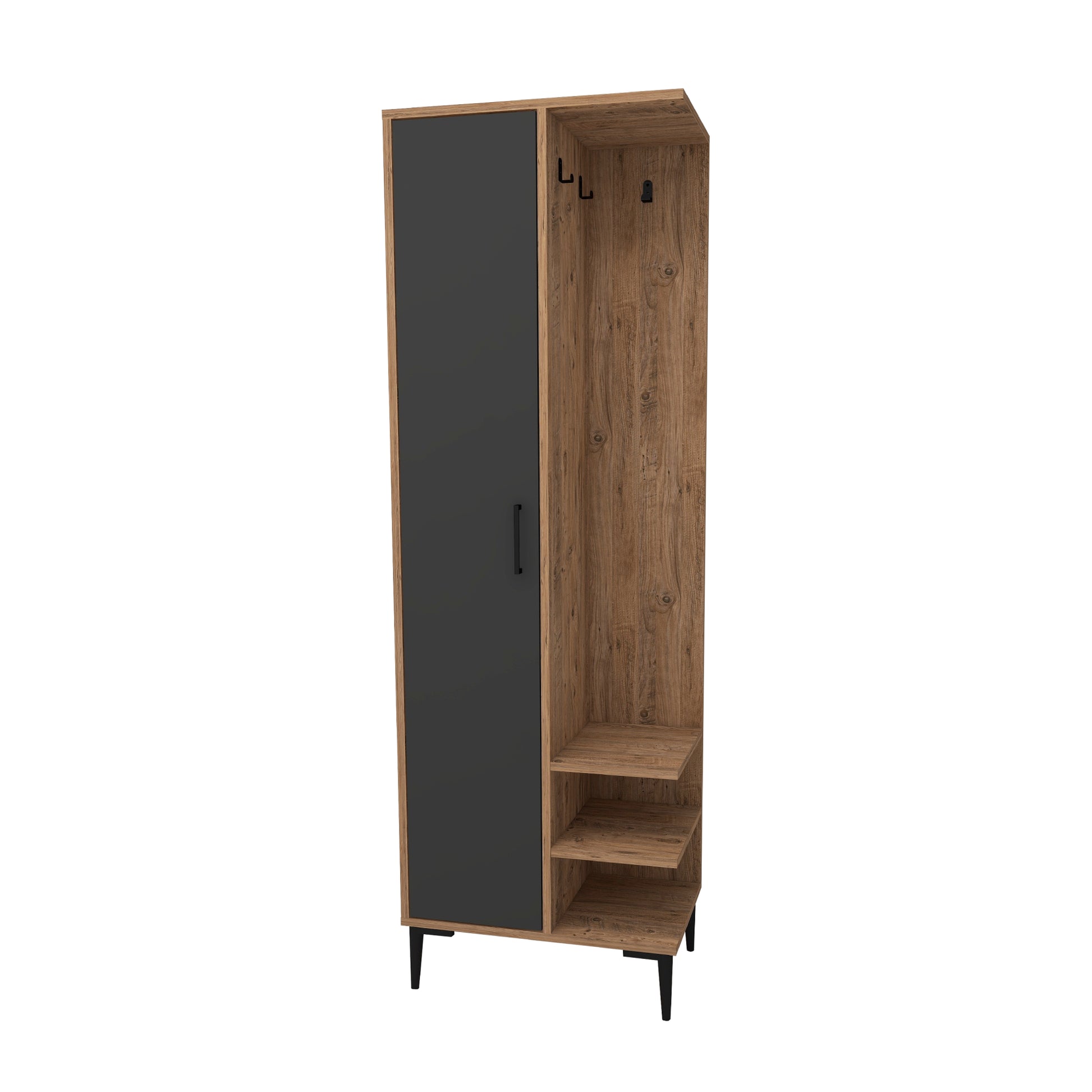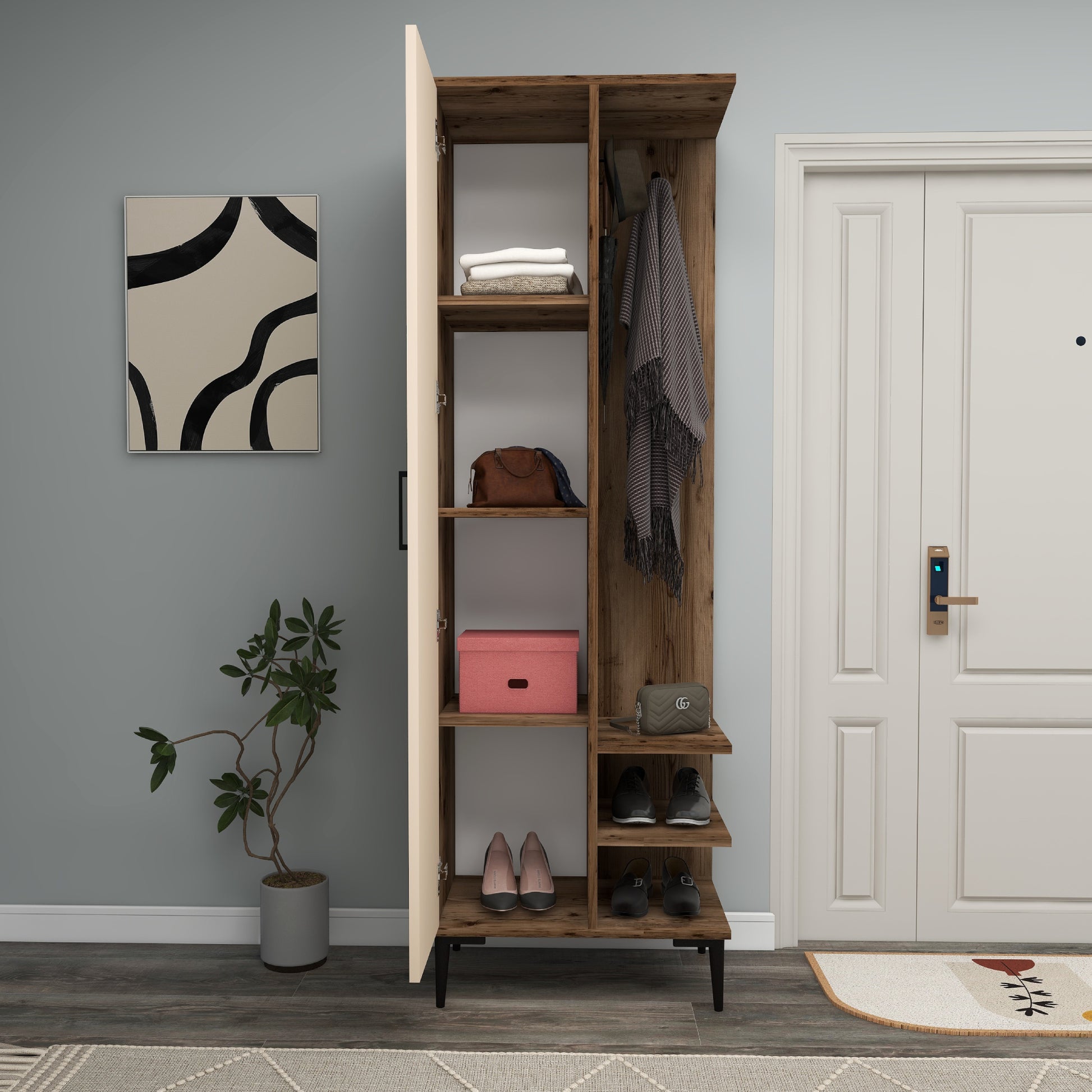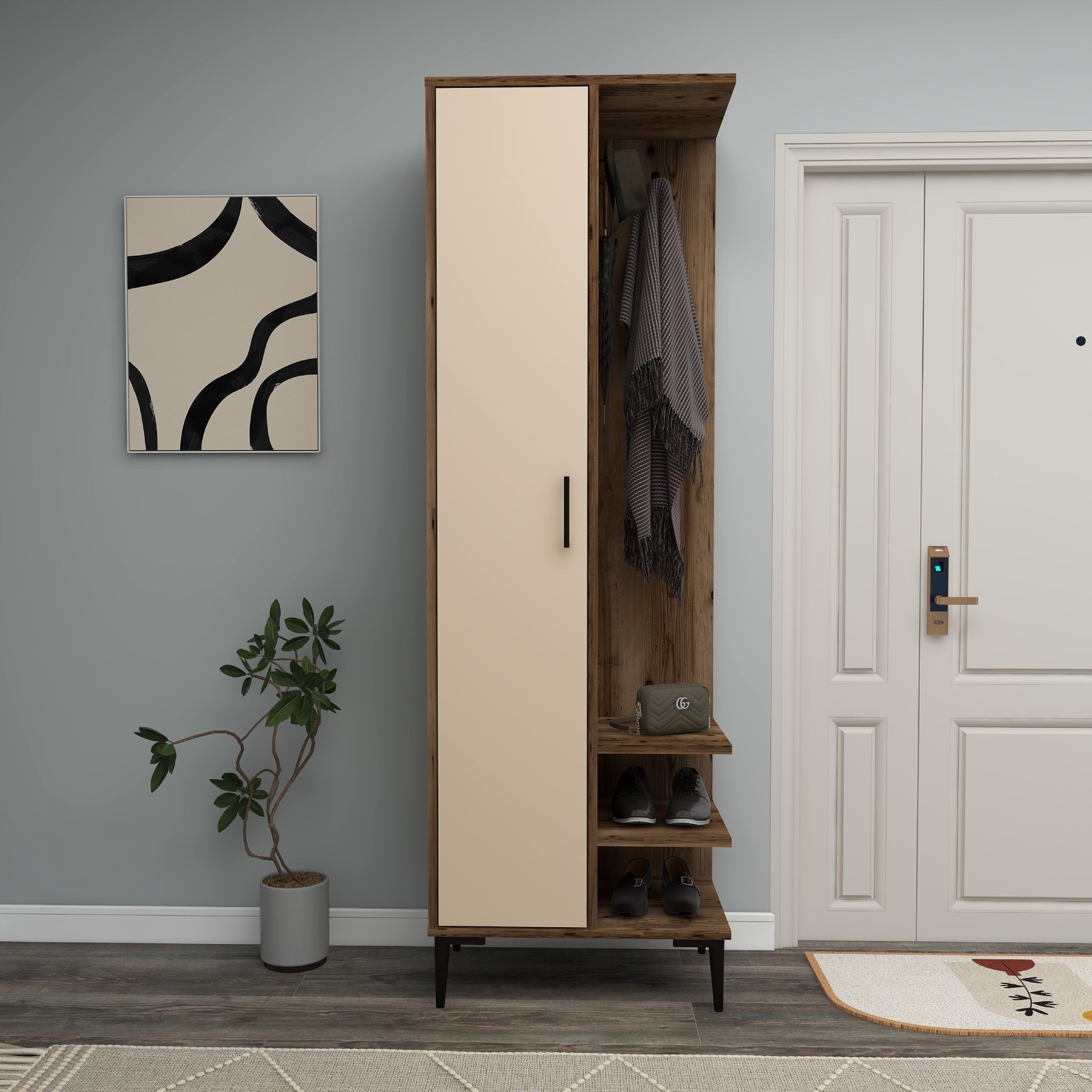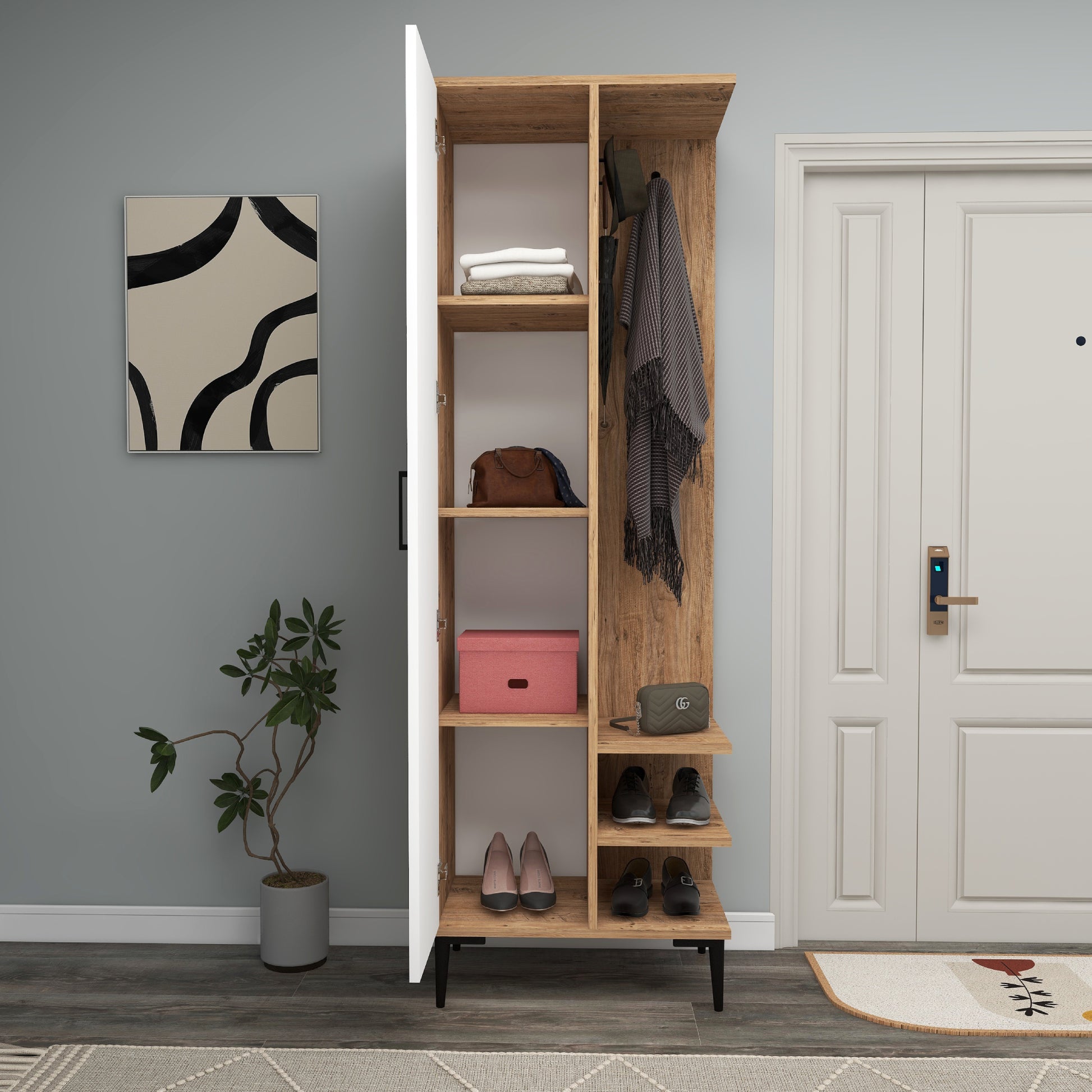 Modern Hallway Coat Rack – the ultimate solution to elevate your entryway organization. With its three-tier open shelves, this coat rack offers a stylish display for your shoes, bags, and other essentials, creating an inviting and clutter-free space. The innovative design includes a cabinet with four interior shelves, allowing you to keep your items neatly stored and concealed. Complete with three sturdy metal hooks- you can easily hang coats, hats, and scarves, making it a practical addition to any hallway. Embrace the modern elegance of our Hallway Coat Rack and upgrade your entryway with seamless style and functionality.