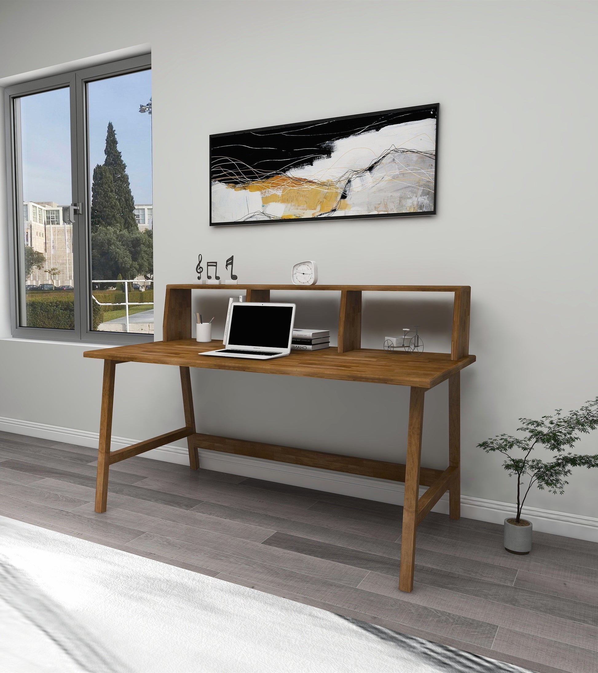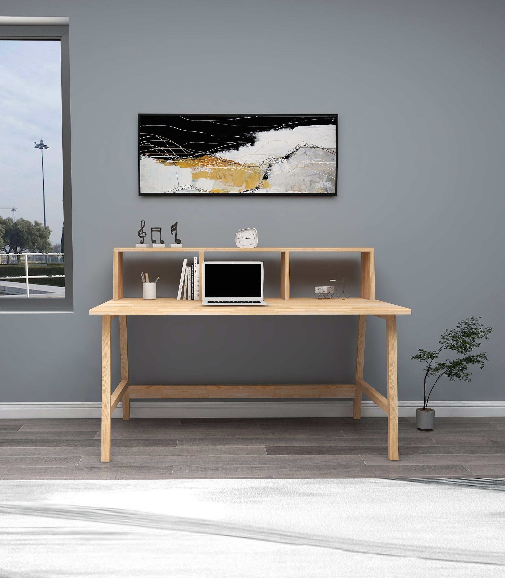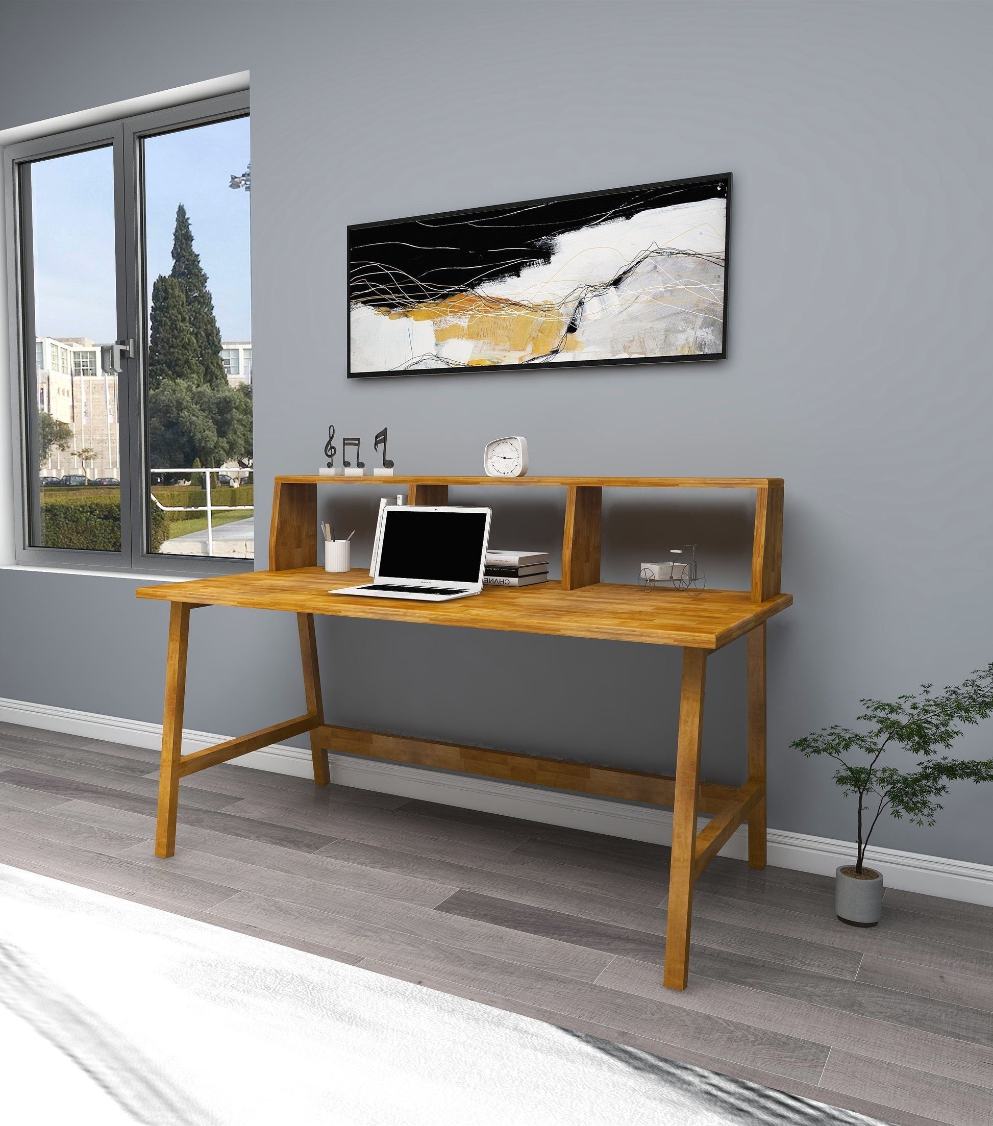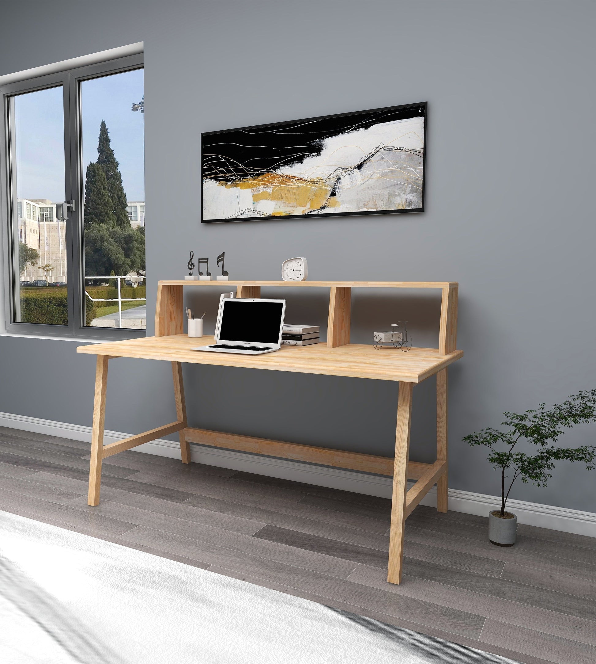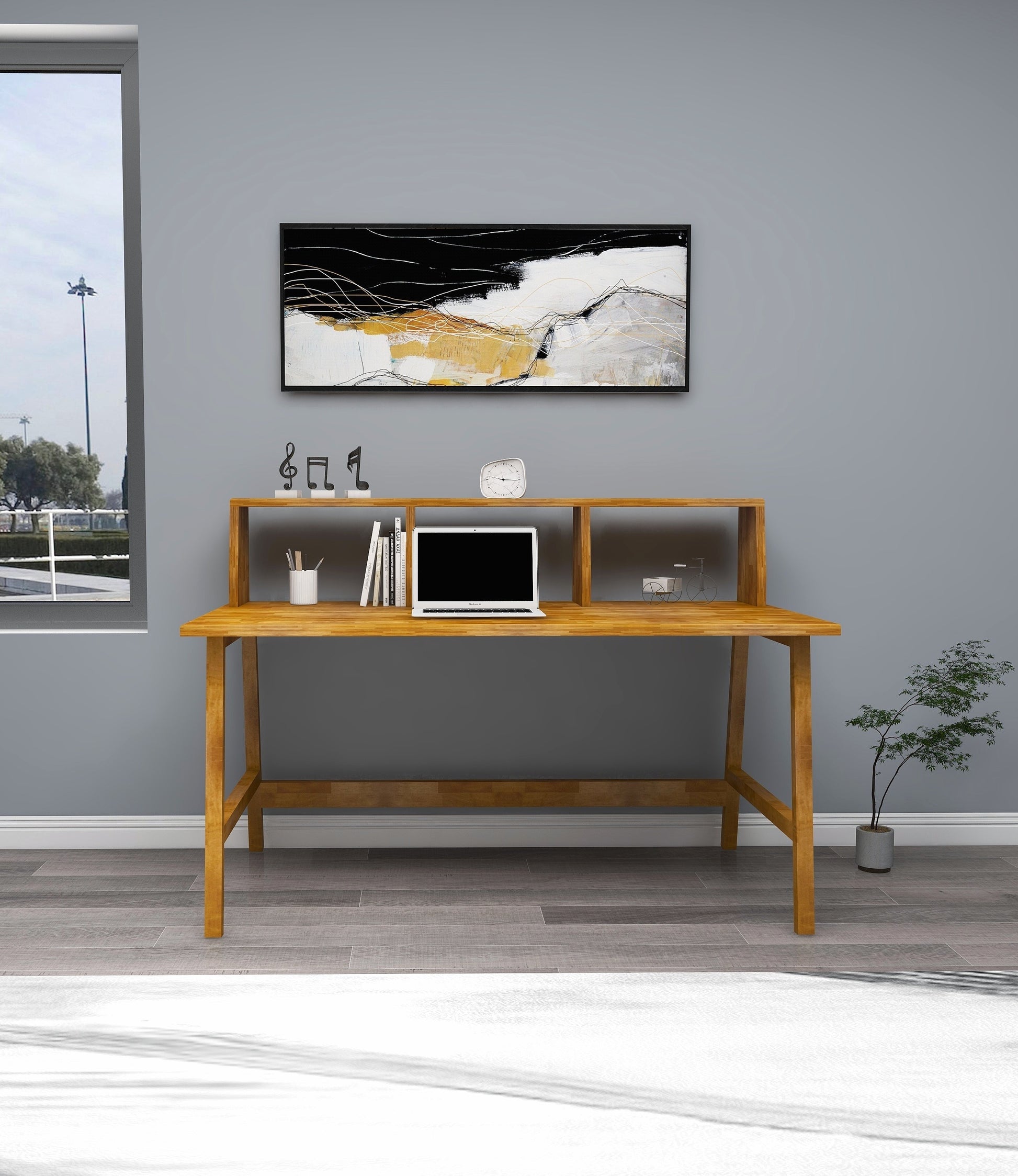 Crafted with solid pine wood and hand finished with water-resistant varnish, this modern computer desk is both beautiful and sturdy. The smooth oval wood edges and front bar with shelves make this desk both functional and stylish. Assembled weight of 61.7 lb. and complete with all the tools needed for assembly, it will be a great addition to any workspace.