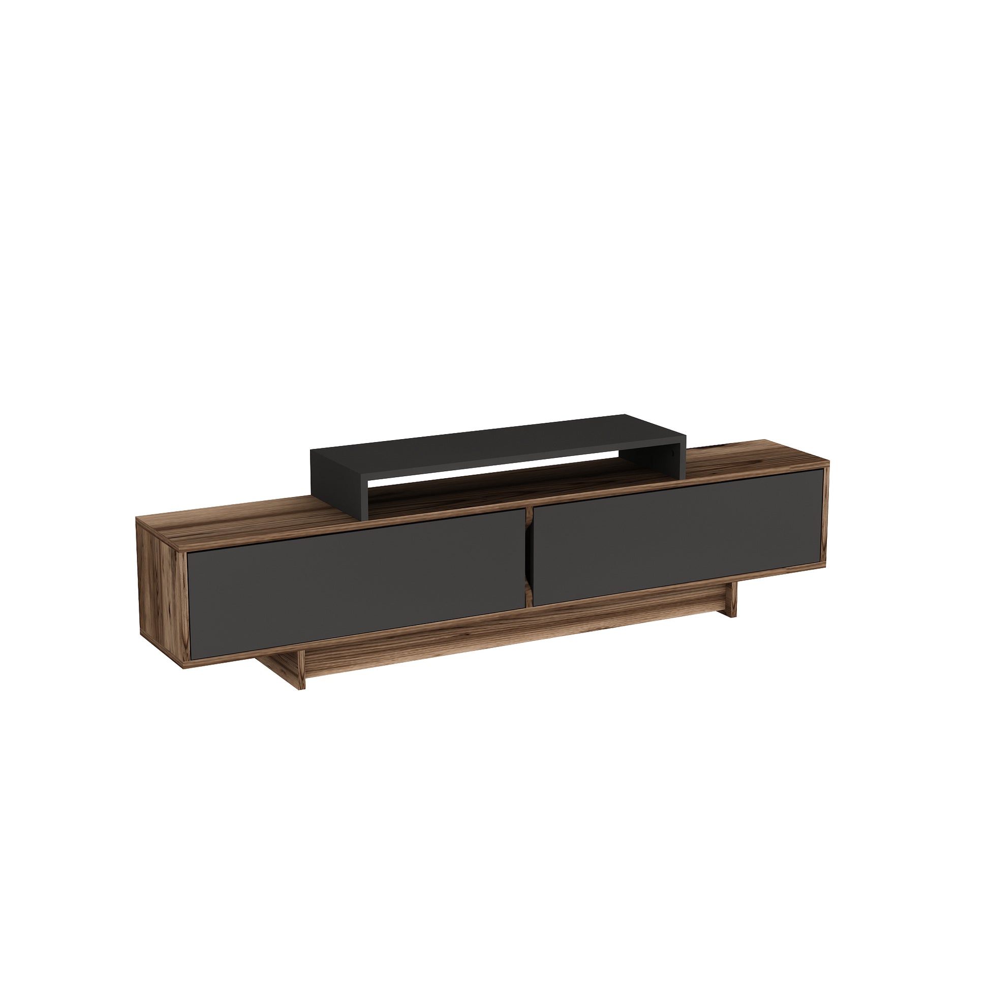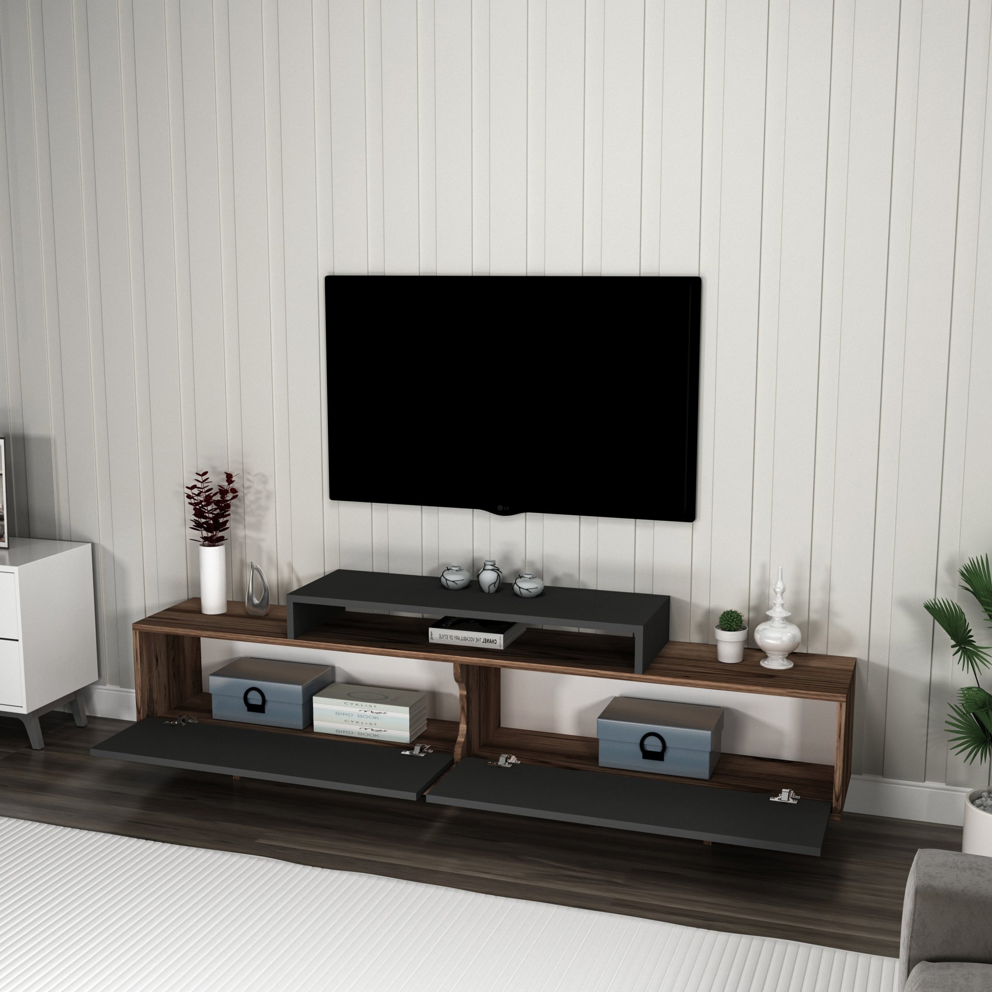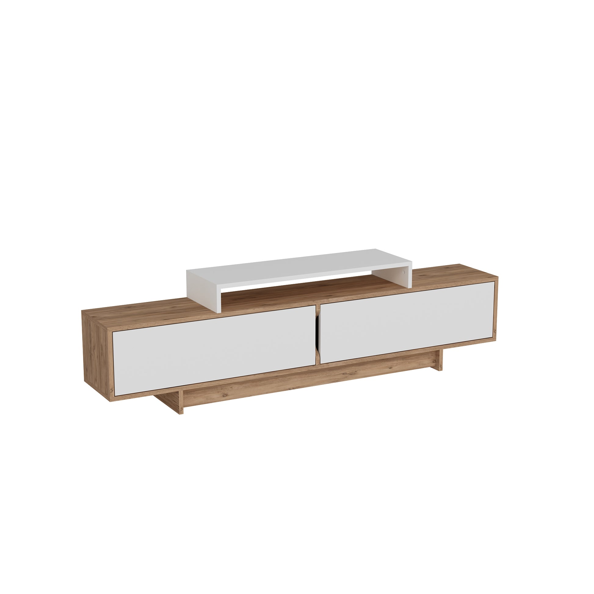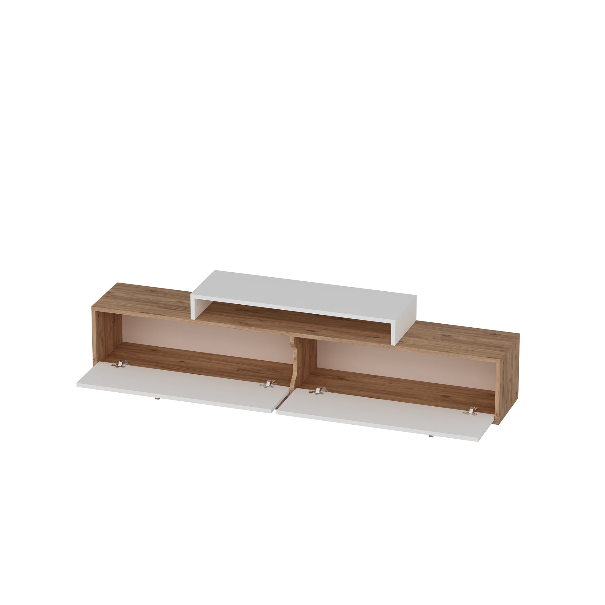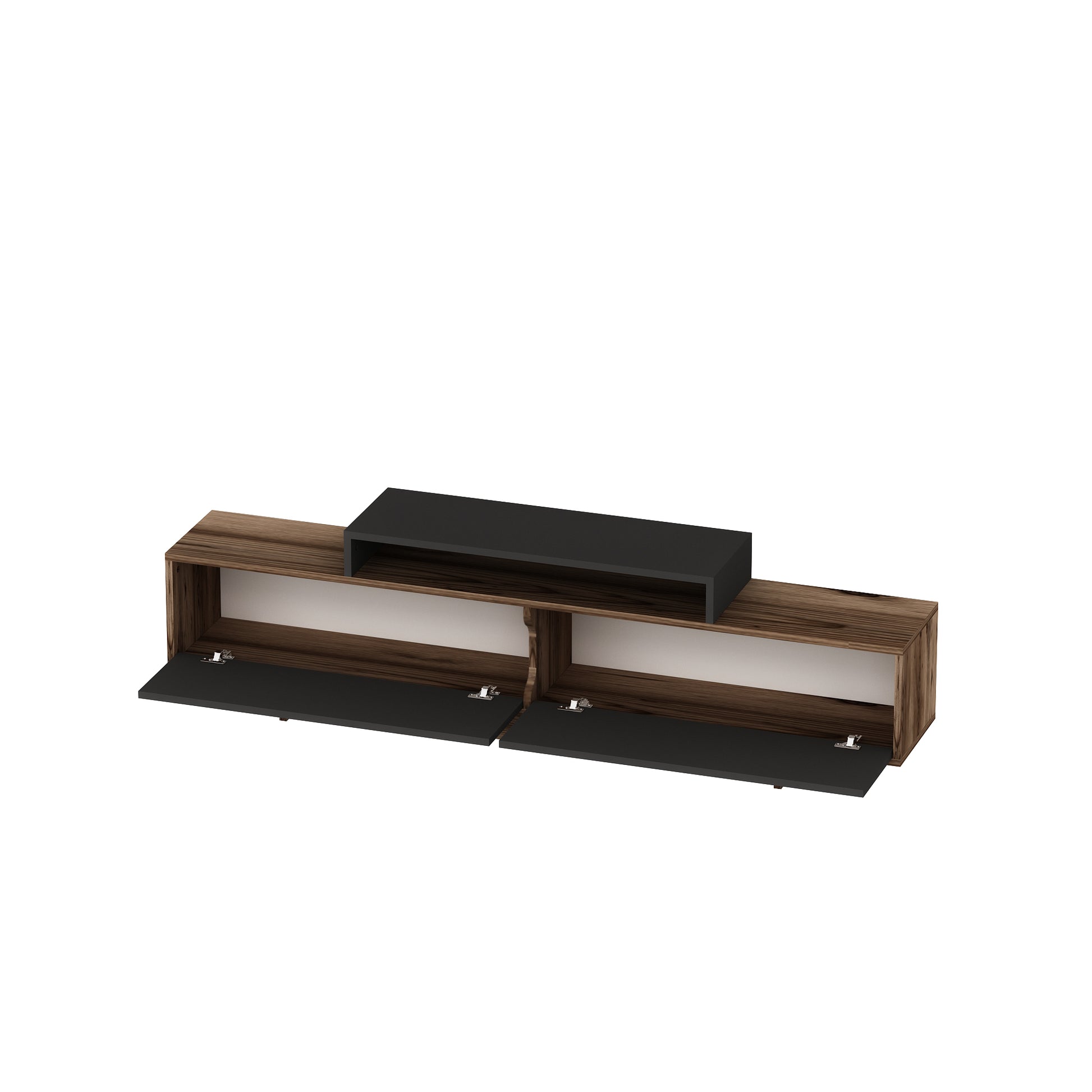 This modern TV stand and entertainment center offers a sleek design with plenty of storage to accommodate TVs up to 78 inches. Built with 18 mm thick particleboard and finished with melamine veneer, it features two wide cabinets with metal hinges, and a fixed open shelf on the top board. Arc-style recessed middle board is designed as a handle to open the drop down doors. The edges are banded with PVC edge band to ensure a water-resistant engineered wood surface.
