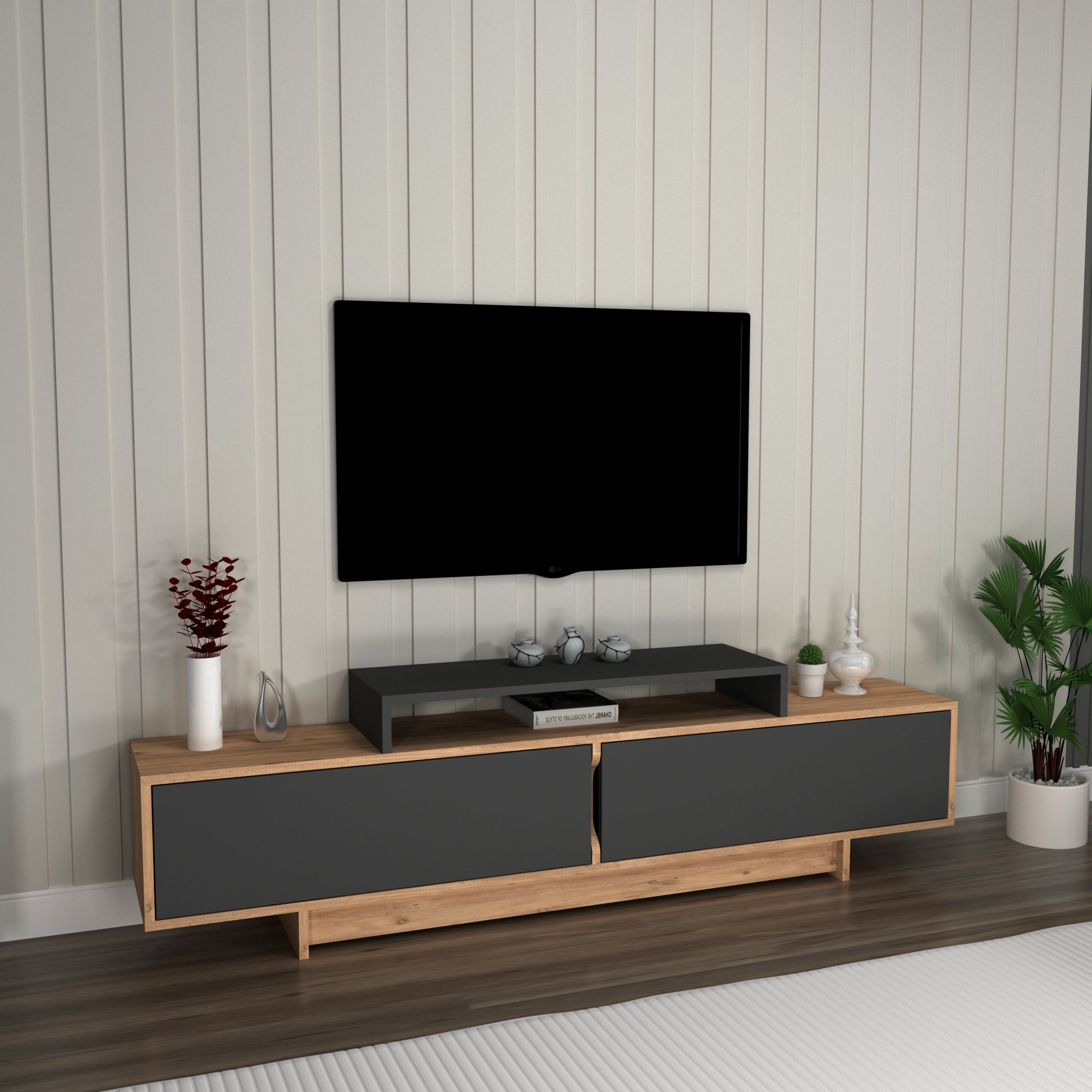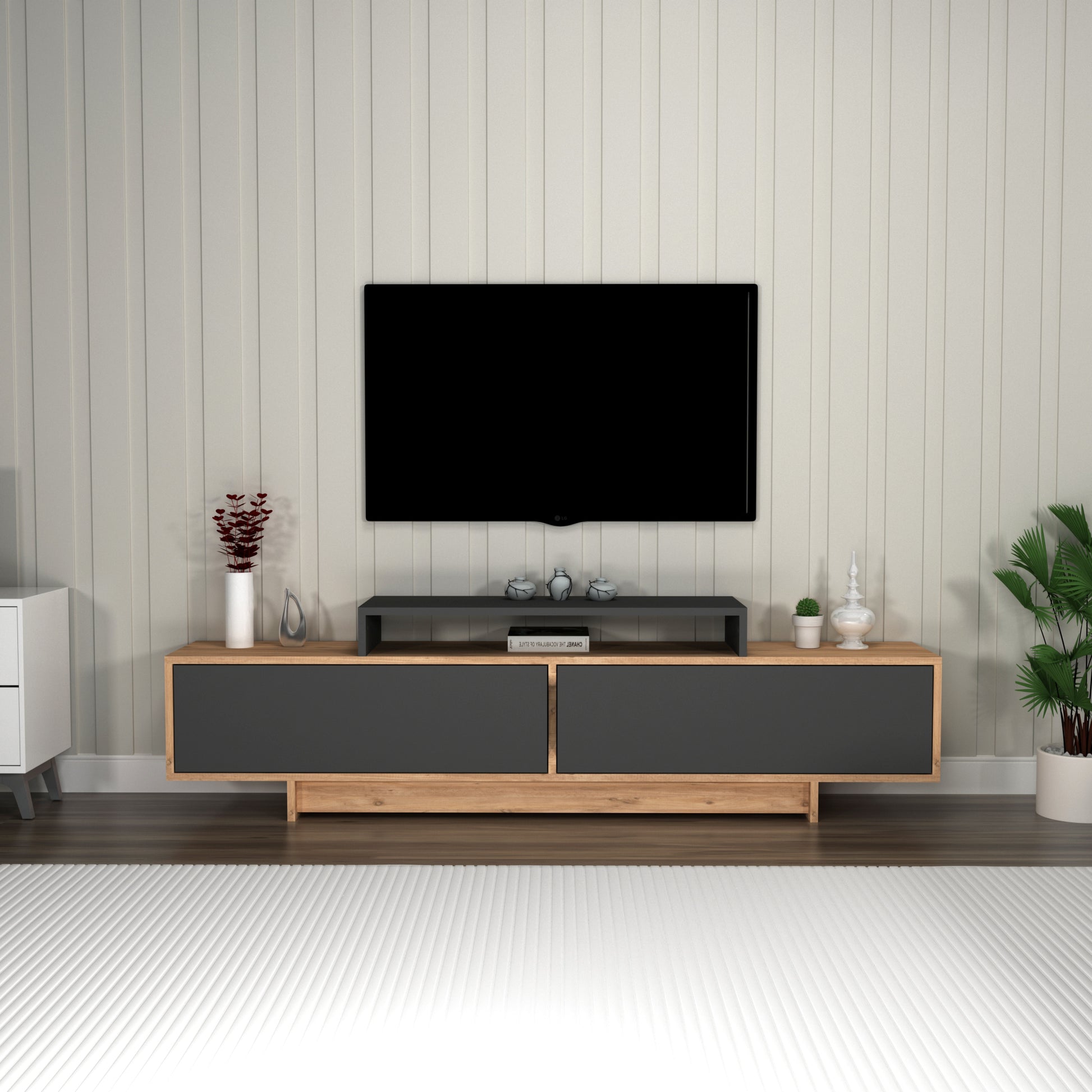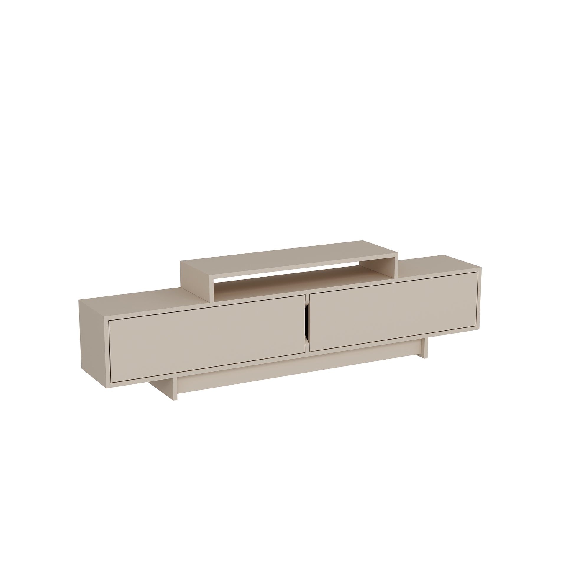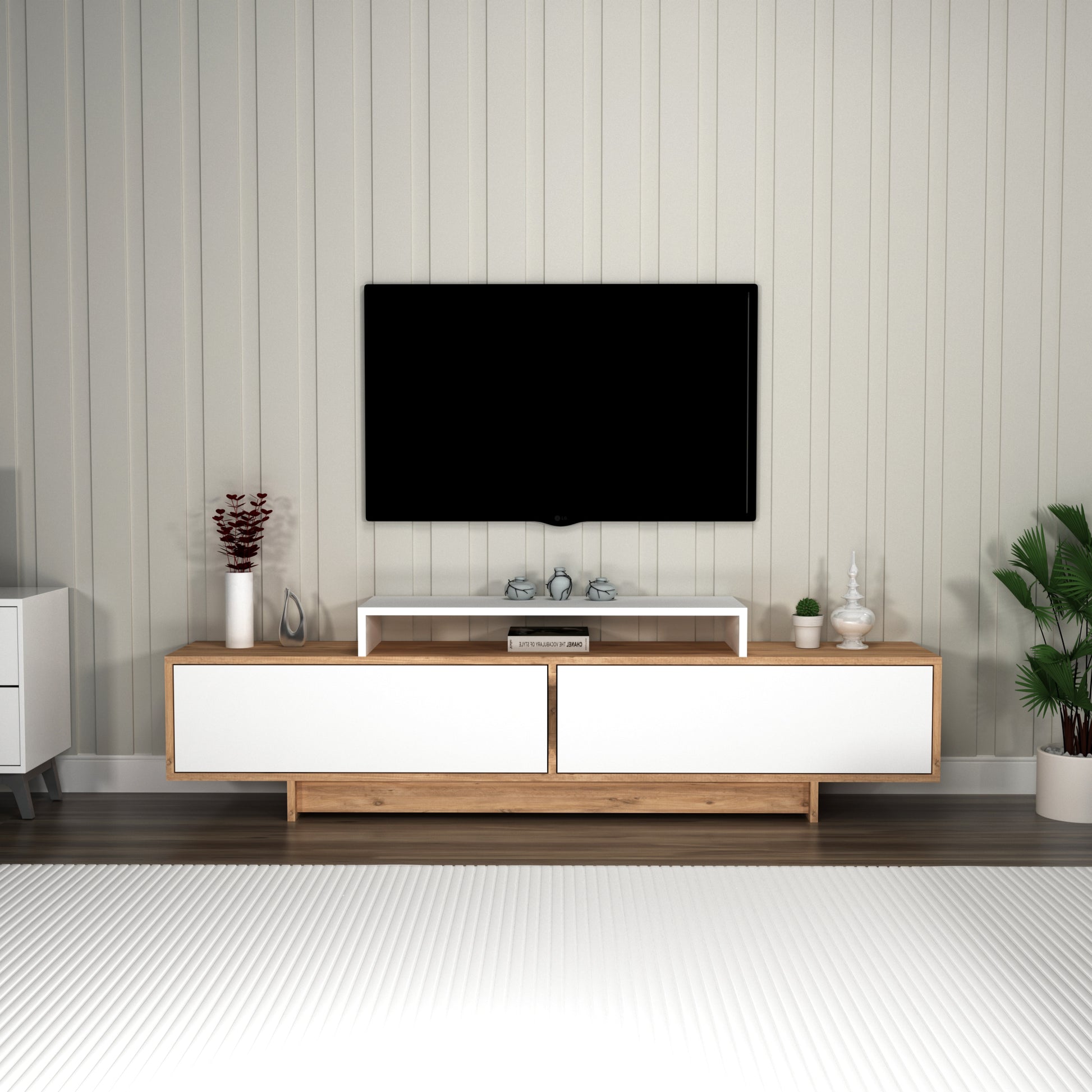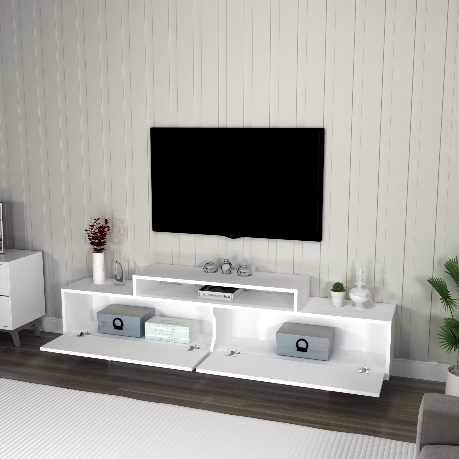 This modern TV stand and entertainment center offers a sleek design with plenty of storage to accommodate TVs up to 78 inches. Built with 18 mm thick particleboard and finished with melamine veneer, it features two wide cabinets with metal hinges, and a fixed open shelf on the top board. Arc-style recessed middle board is designed as a handle to open the drop down doors. The edges are banded with PVC edge band to ensure a water-resistant engineered wood surface.
