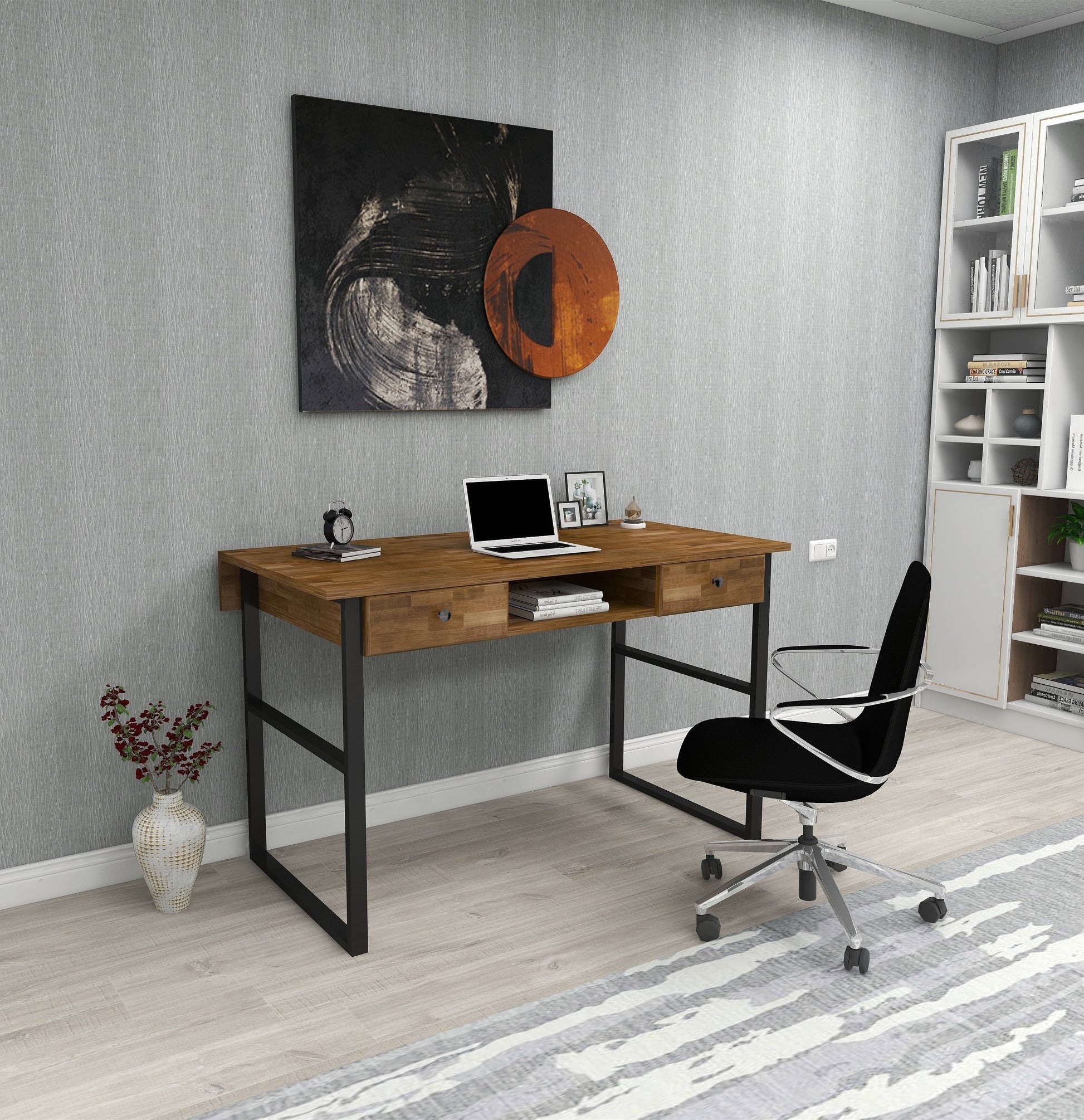 This handmade computer desk with drawers features a sturdy and durable metal frame and legs with solid pine wood construction. Enjoy the convenience of two storage drawers and an open shelf that provide ample storage for your office supplies. Enjoy long-lasting and reliable performance.