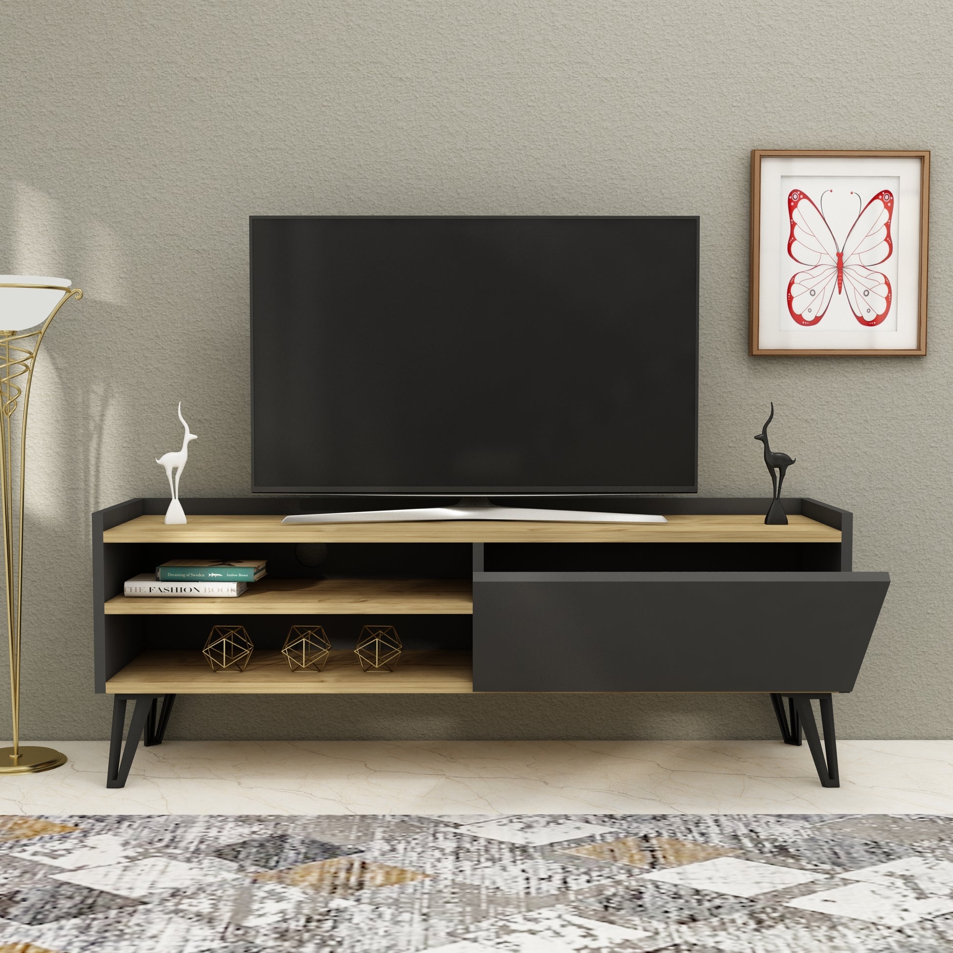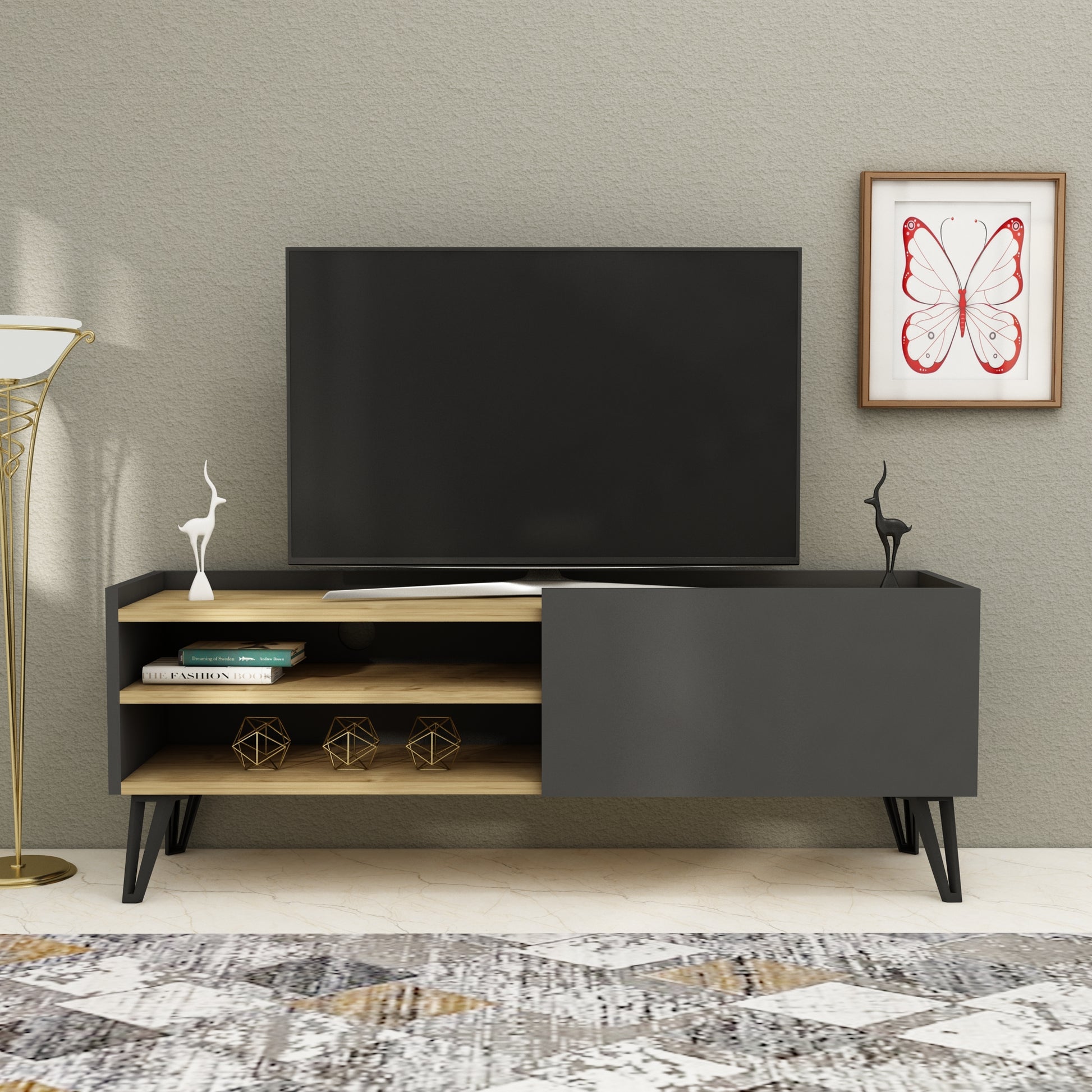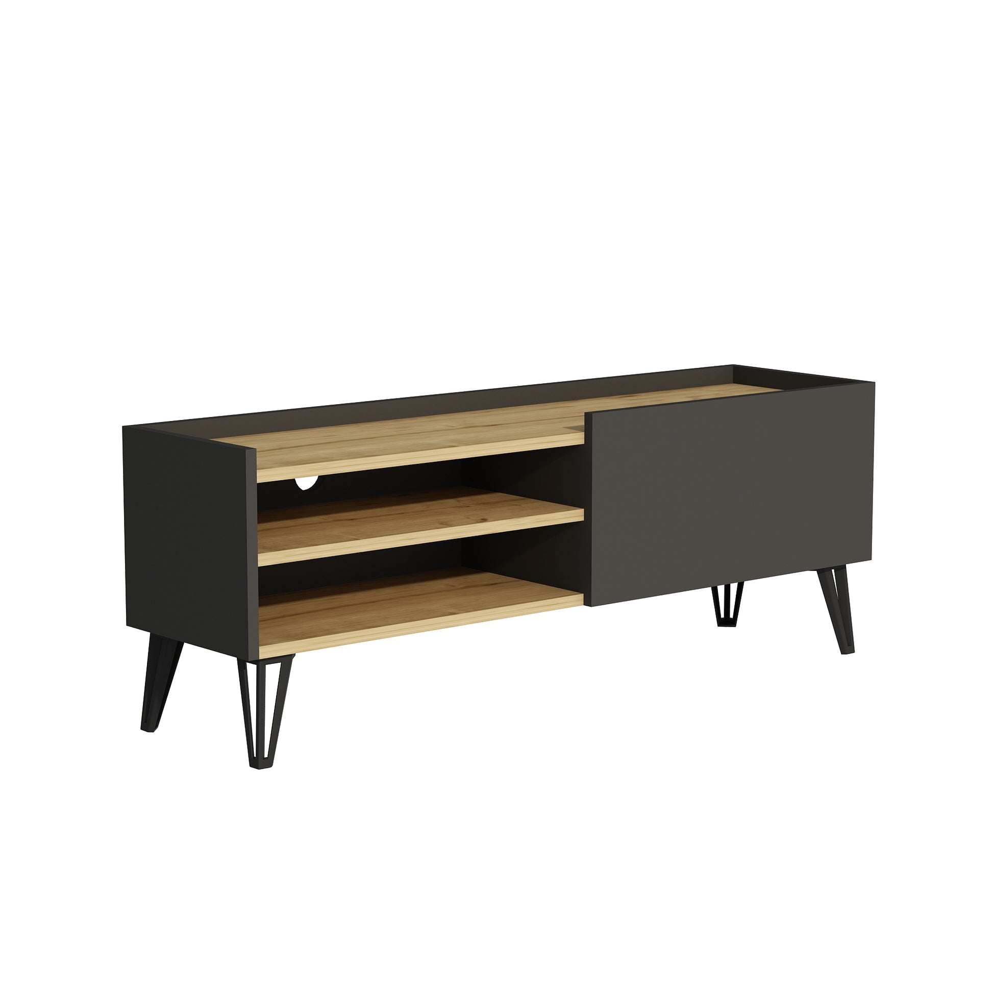 MATERIAL: El soporte para TV está fabricado con tablero de partículas de madera aglomerada de 18 mm de grosor con revestimiento de melamina de alta calidad. La superficie de madera es resistente al agua y los bordes están revestidos con cinta de PVC. Un borde de la puerta ligeramente extendido sirve de tirador. Se utilizan herrajes y accesorios de montaje e instalación de primera calidad. Nuestros productos se fabrican con materias primas de calidad certificada, libres de sustancias cancerígenas y conformes con las normas sanitarias de la Unión Europea.