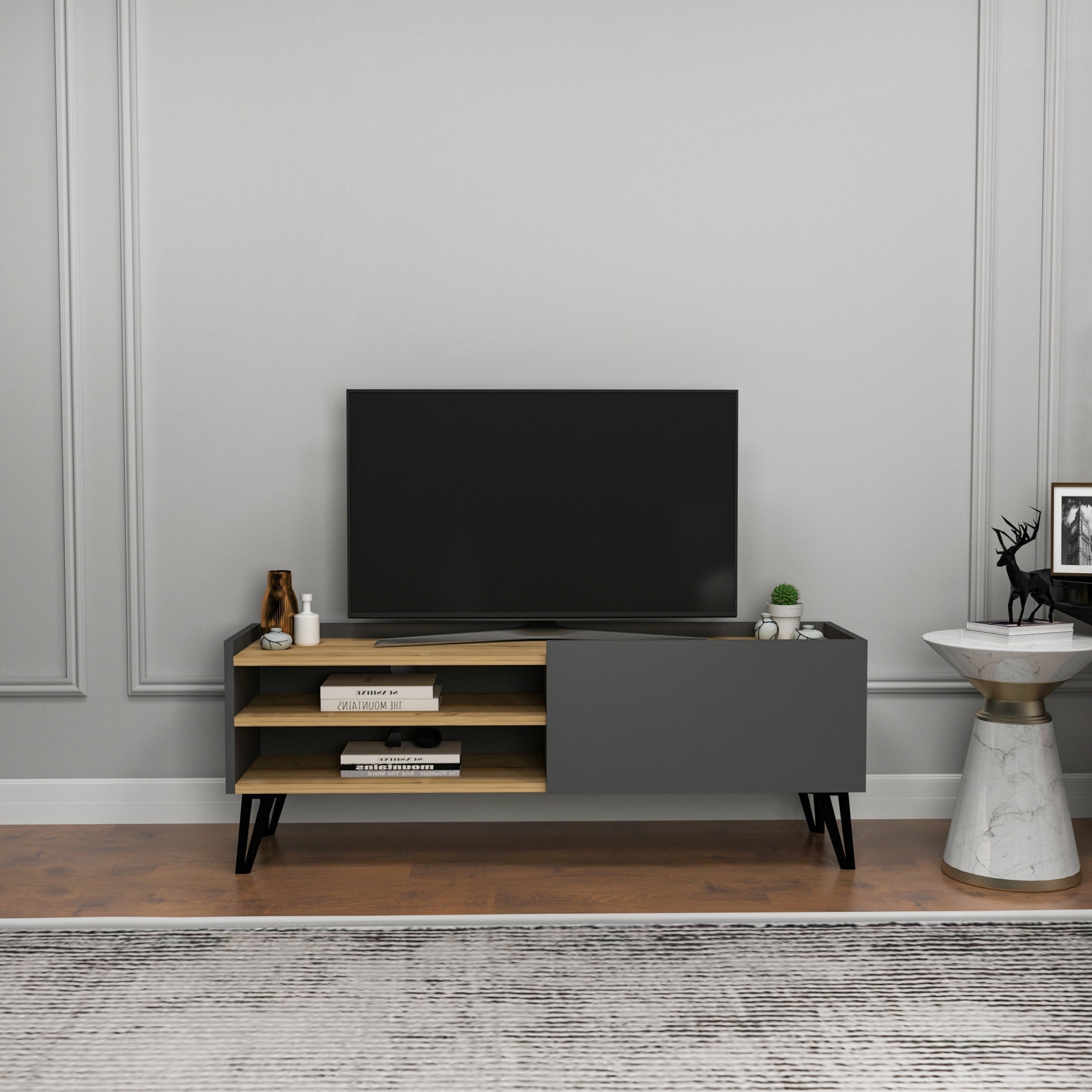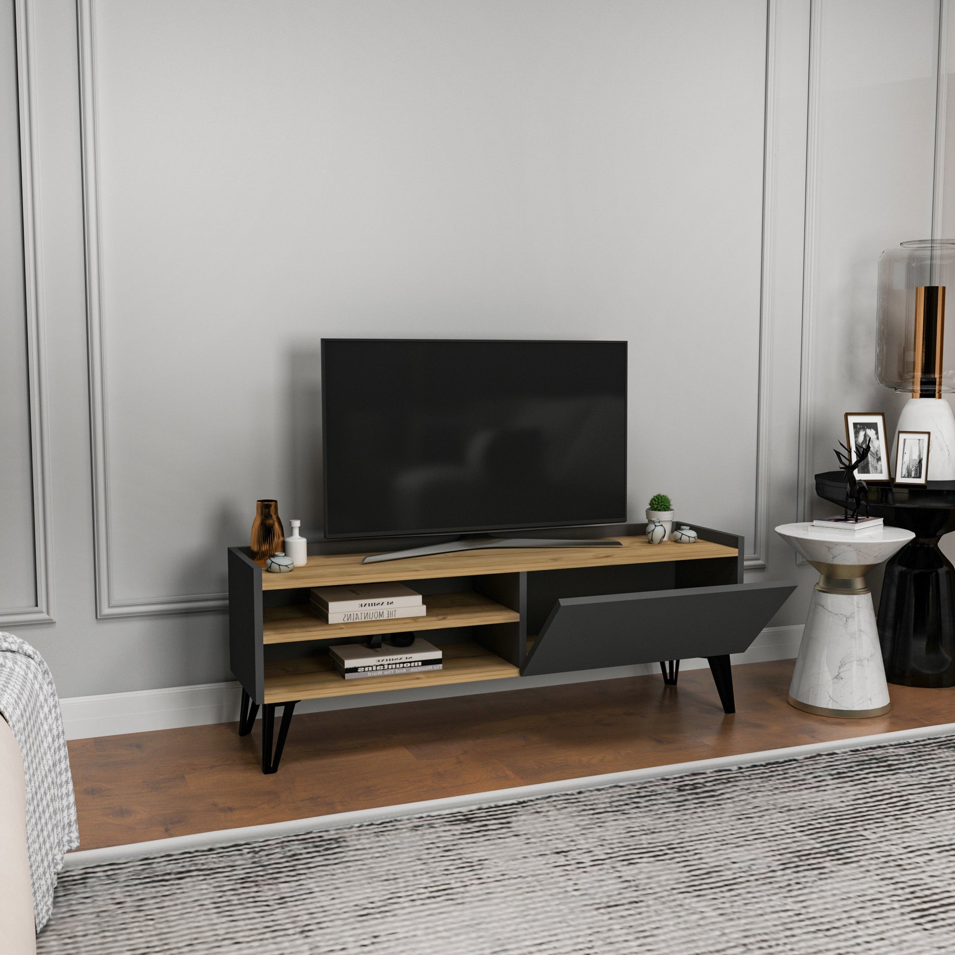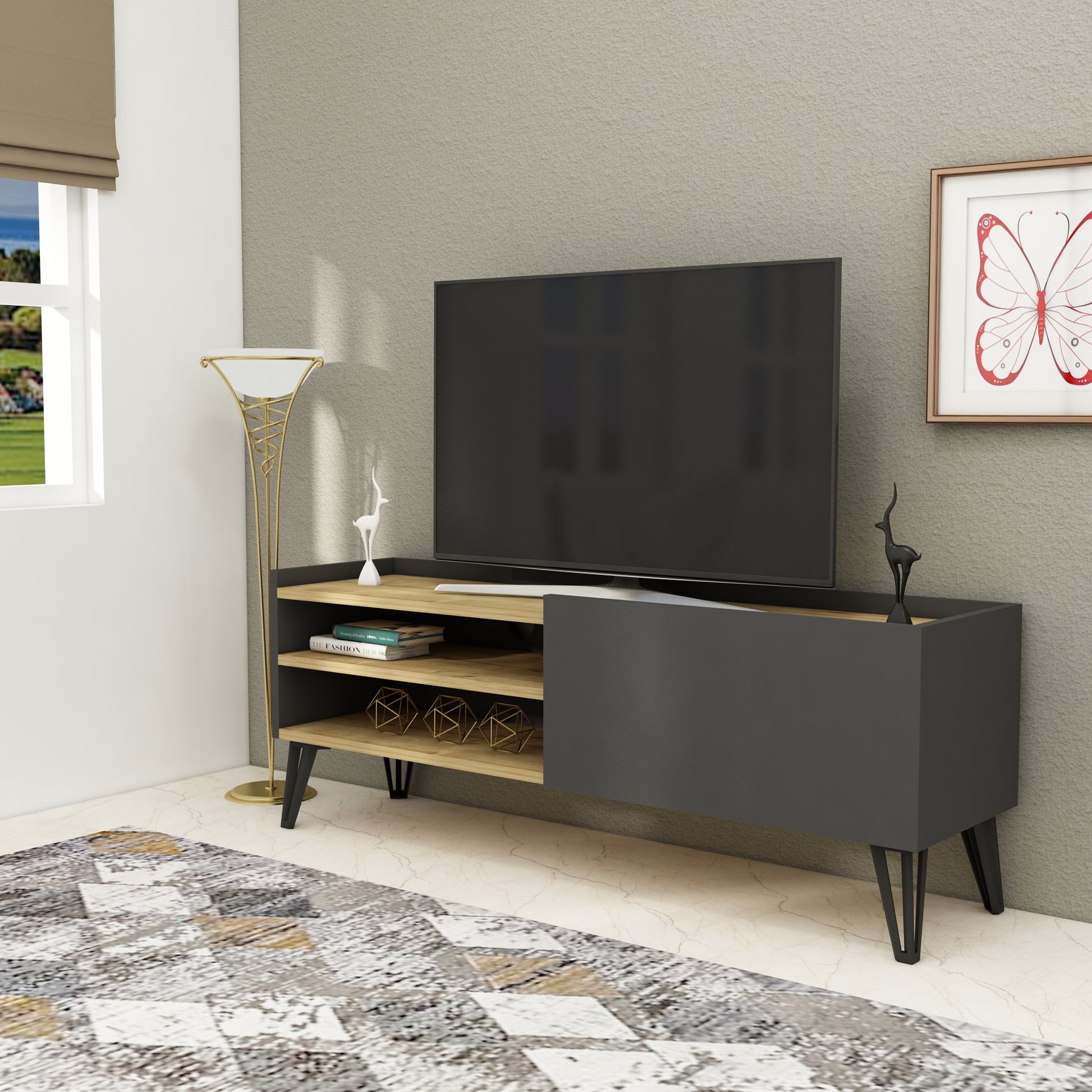MATERIAL: El soporte para TV está fabricado con tablero de partículas de madera aglomerada de 18 mm de grosor con revestimiento de melamina de alta calidad. La superficie de madera es resistente al agua y los bordes están revestidos con cinta de PVC. Un borde de la puerta ligeramente extendido sirve de tirador. Se utilizan herrajes y accesorios de montaje e instalación de primera calidad. Nuestros productos se fabrican con materias primas de calidad certificada, libres de sustancias cancerígenas y conformes con las normas sanitarias de la Unión Europea.