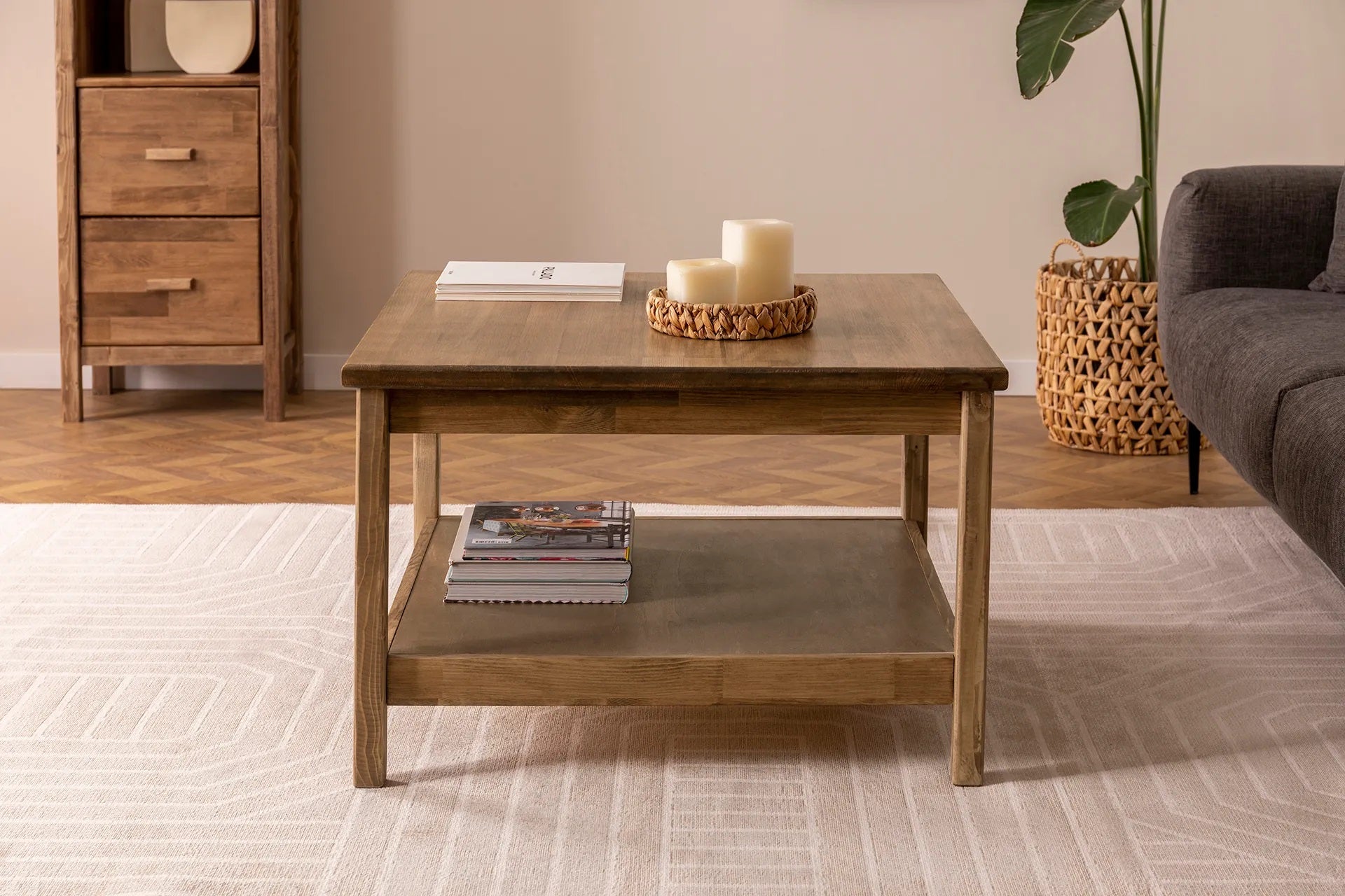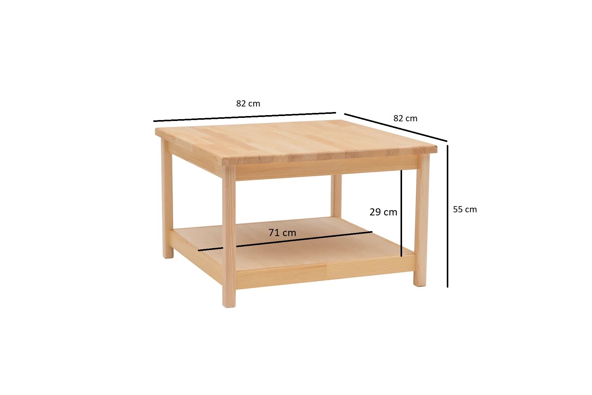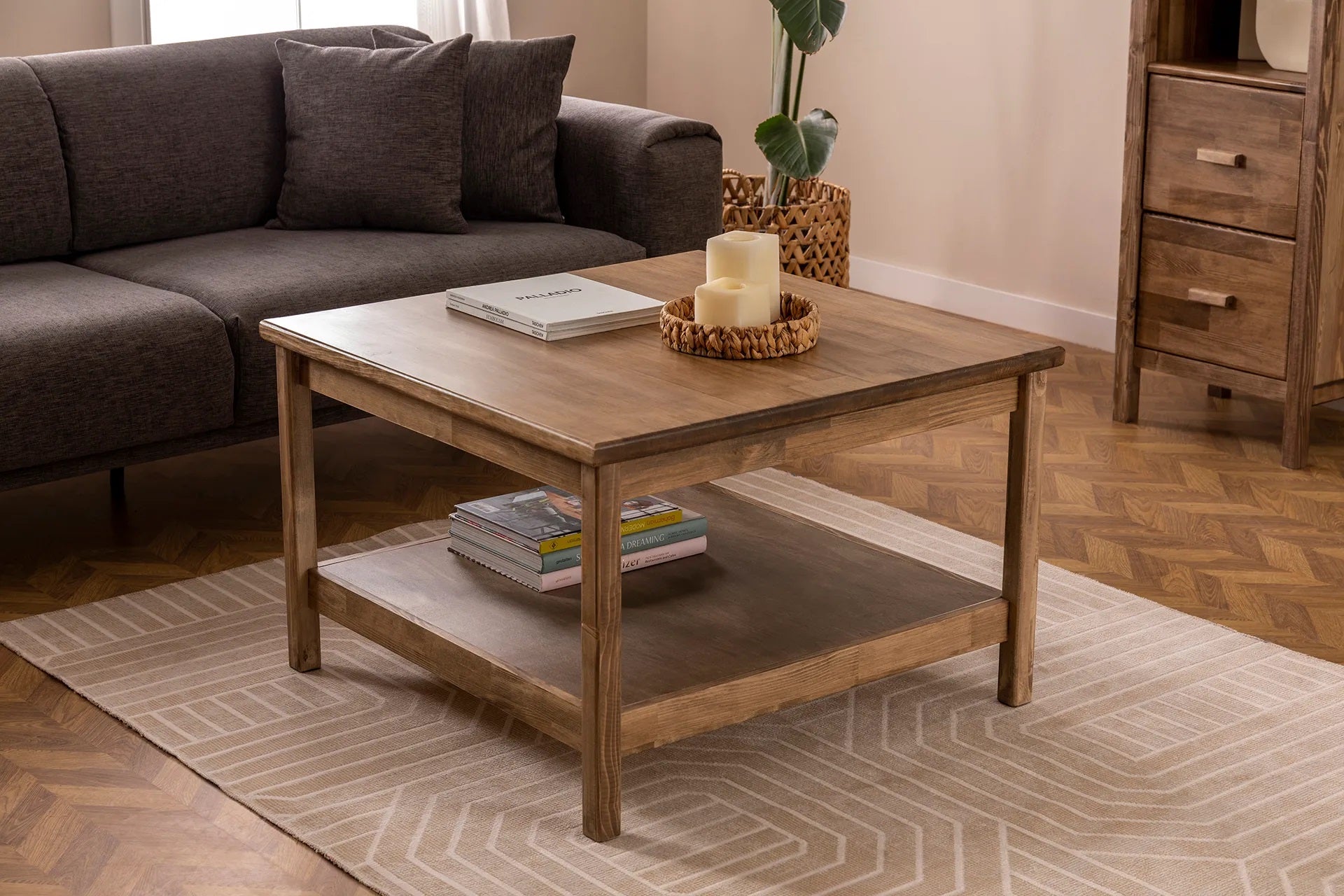 Renueva tu sala u oficina con la elegante y funcional mesa de centro Dawn. Hecha de madera maciza de pino, esta mesa artesanal presenta un moderno diseño cuadrado y un estante de almacenamiento integrado, perfecto para guardar tus libros o revistas favoritos. Disfruta de la belleza y la comodidad de esta versátil pieza en tu espacio.