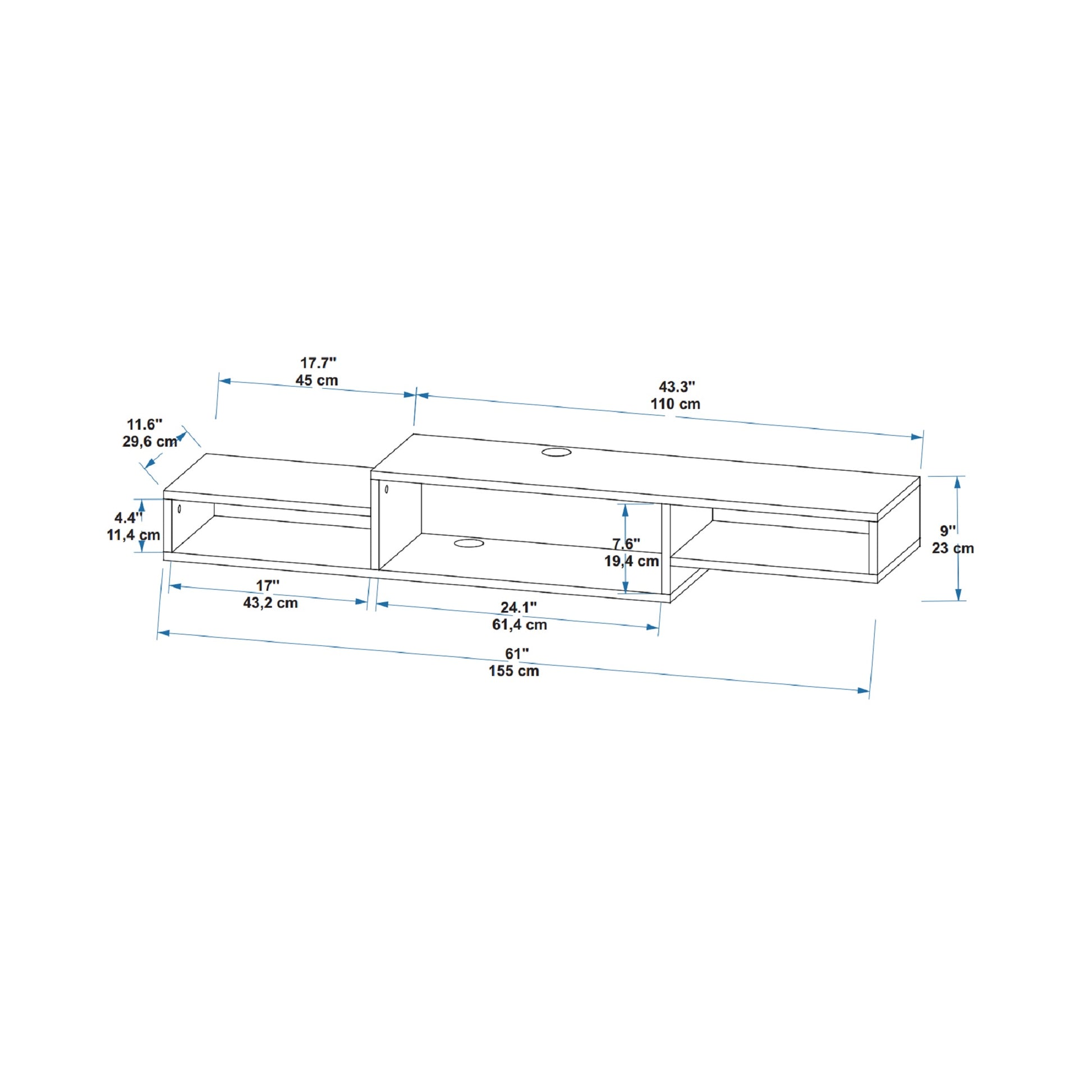 Diseñado por expertos para una apariencia elegante y moderna, el soporte flotante para TV Loretta ofrece la solución perfecta para organizar tu centro de entretenimiento. Con tres estantes abiertos y orificios para la gestión de cables, admite televisores de pantalla plana de hasta 60 pulgadas. Fabricado con tableros de partículas resistentes al agua y cantos de PVC, este soporte es un complemento duradero y elegante para cualquier espacio. Incluye herrajes para montaje en pared.