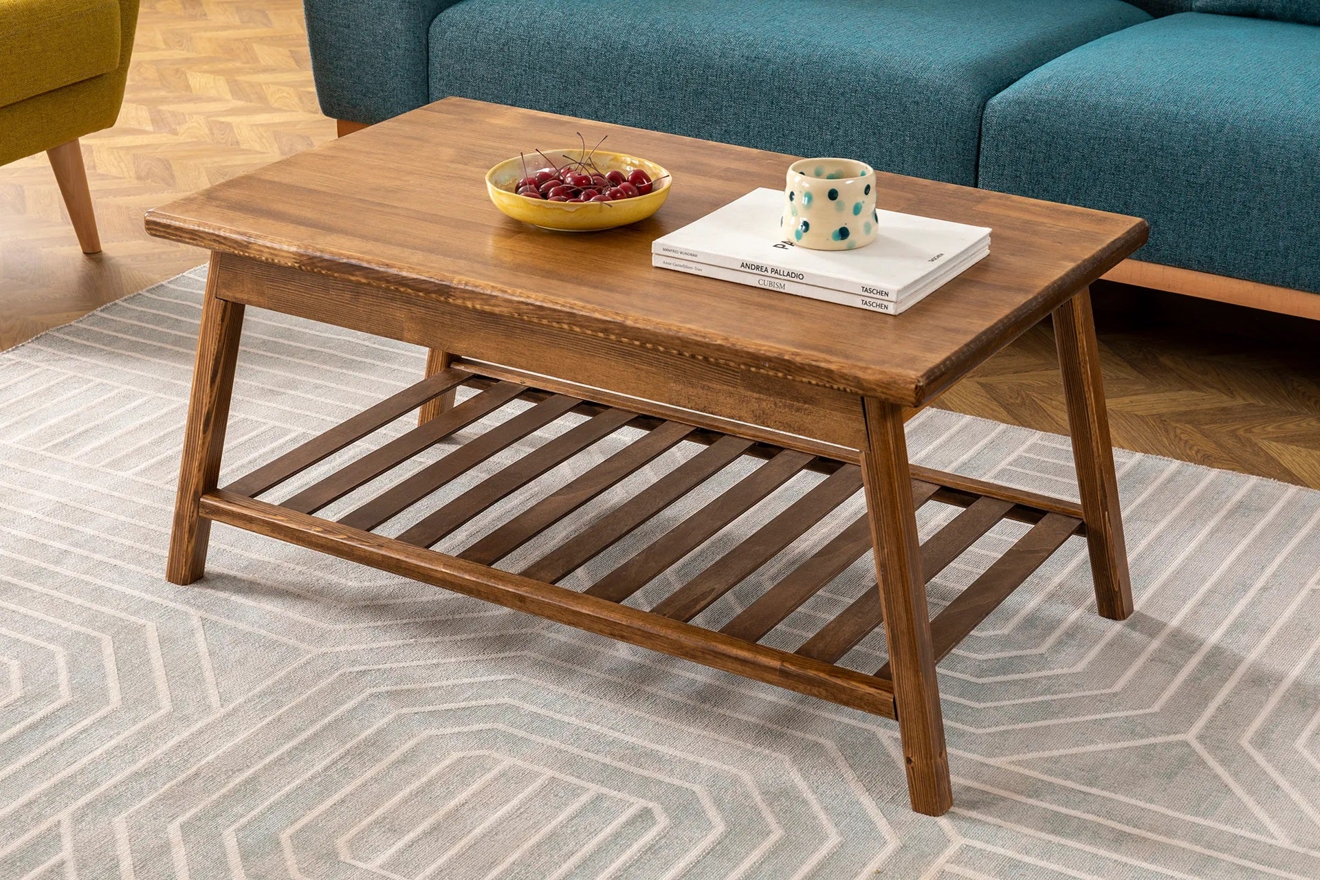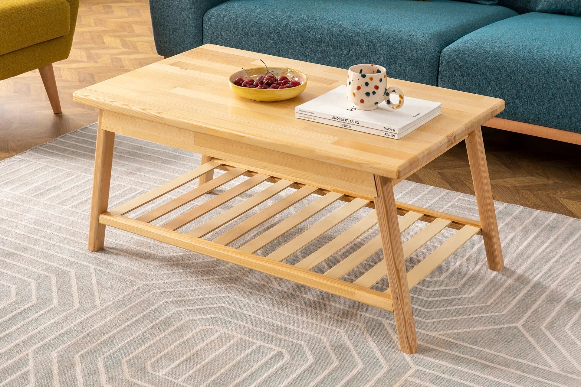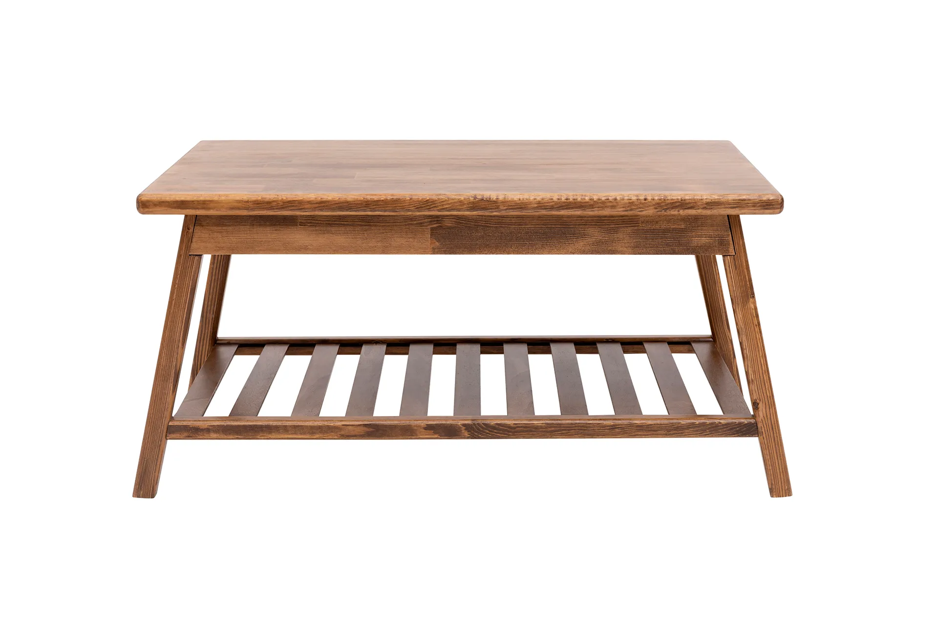 Mesa de centro de madera maciza de pino hecha a mano con estante de almacenamiento Ayla