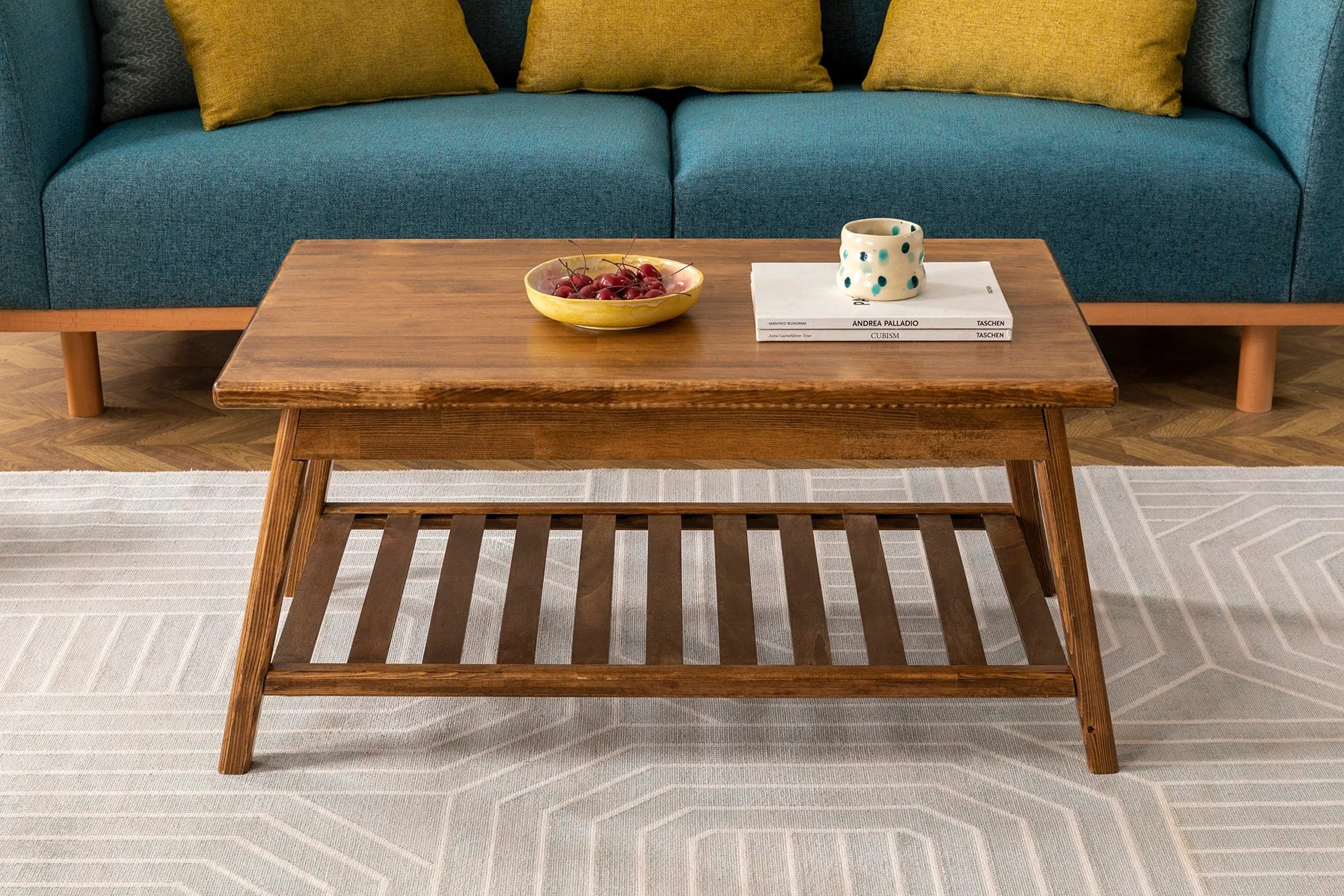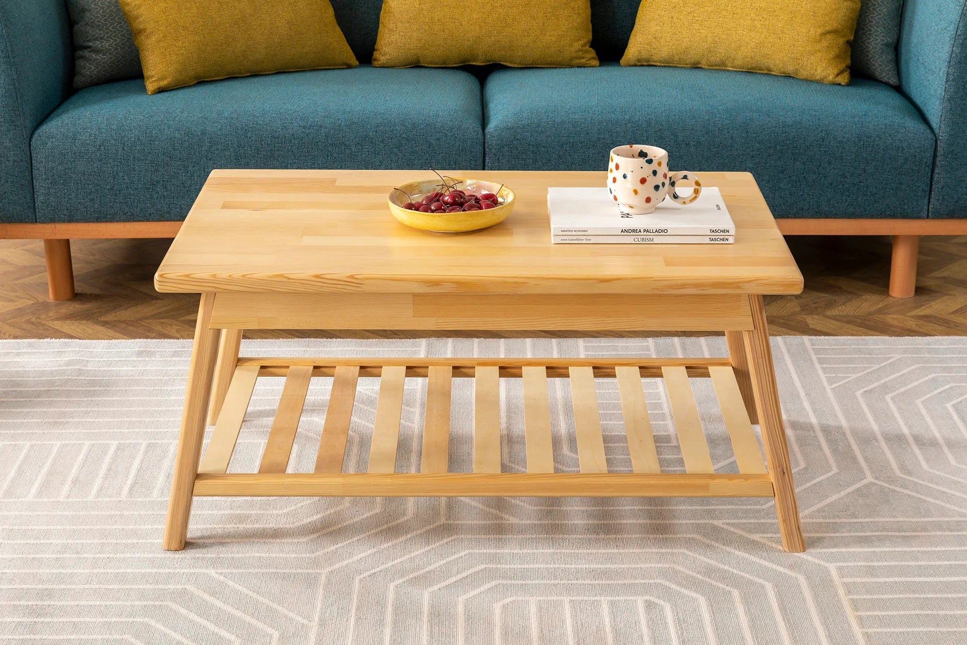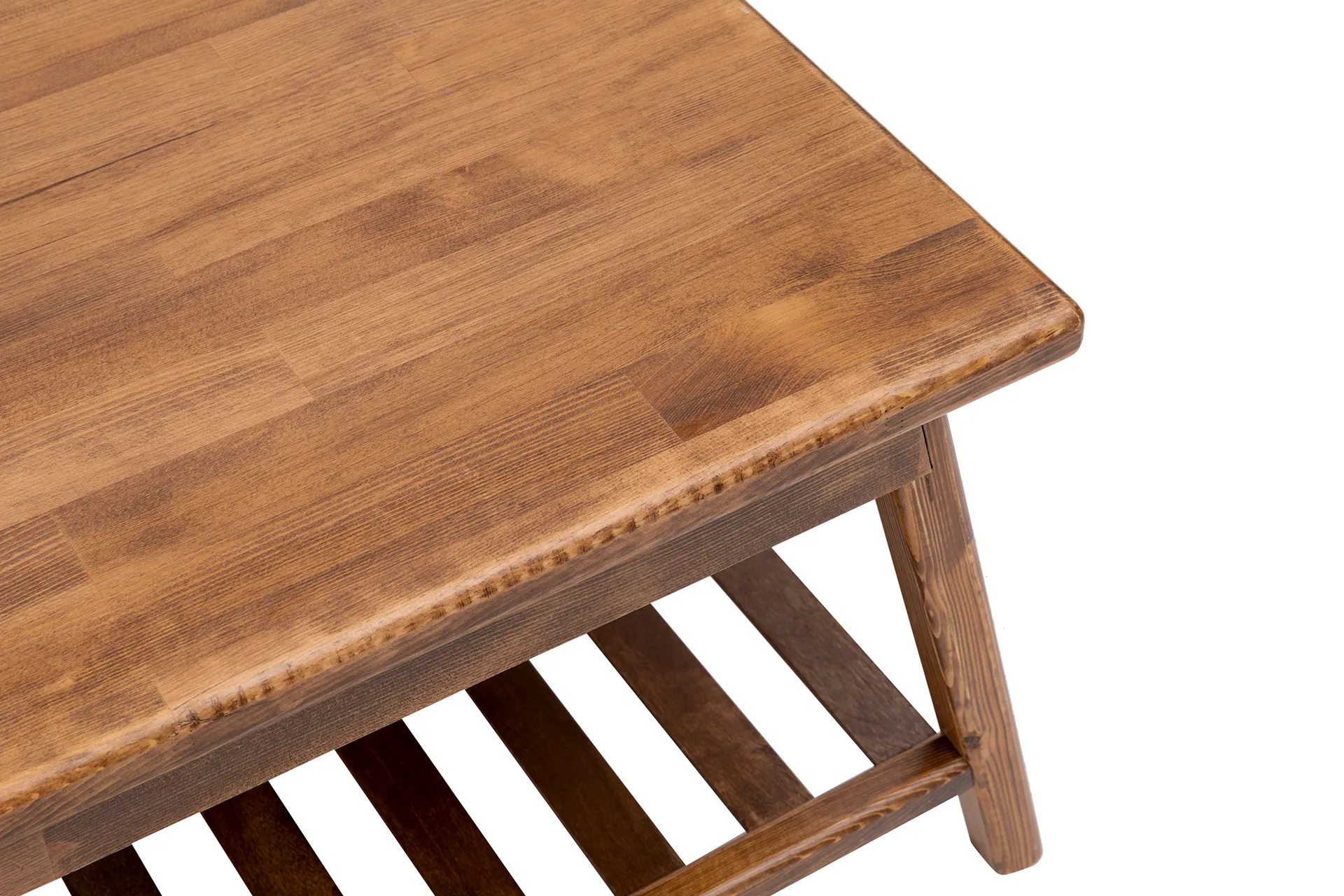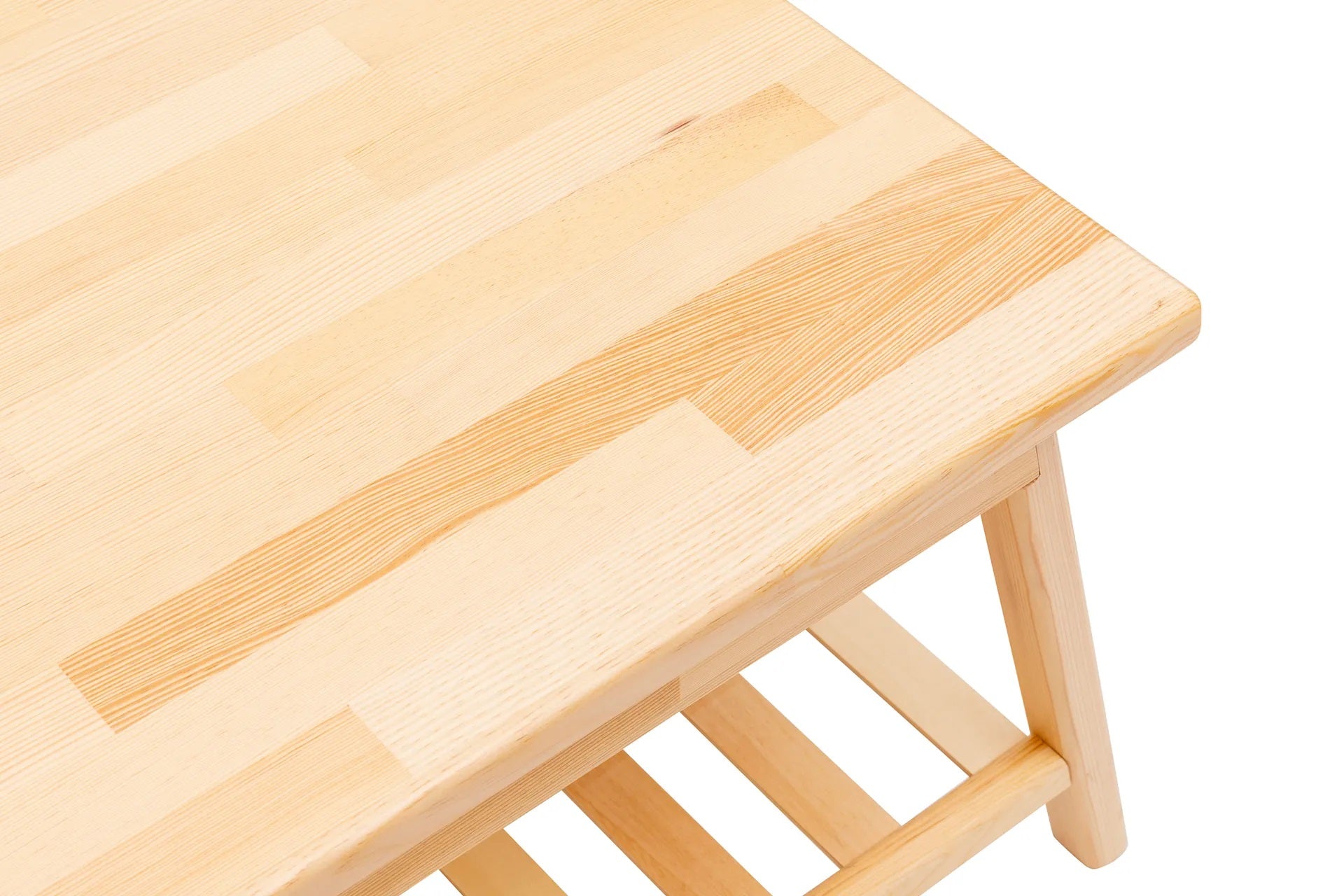 Mesa de centro de madera maciza de pino hecha a mano con estante de almacenamiento Ayla