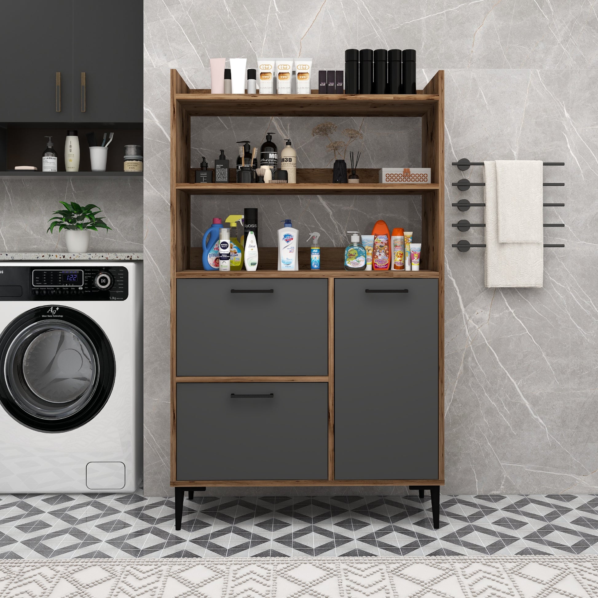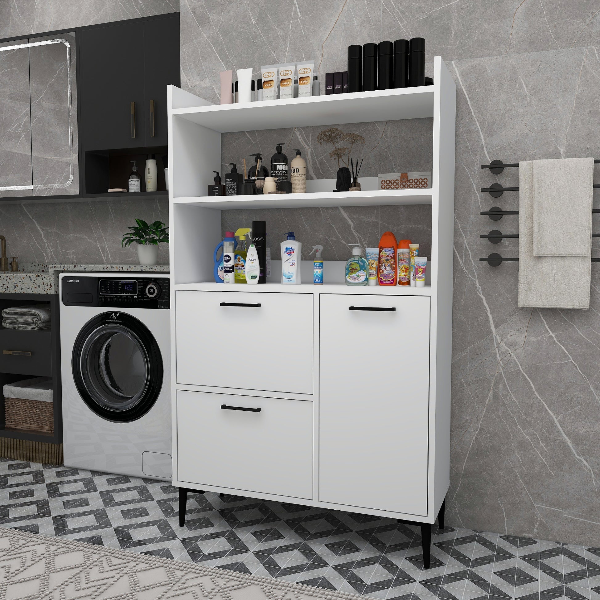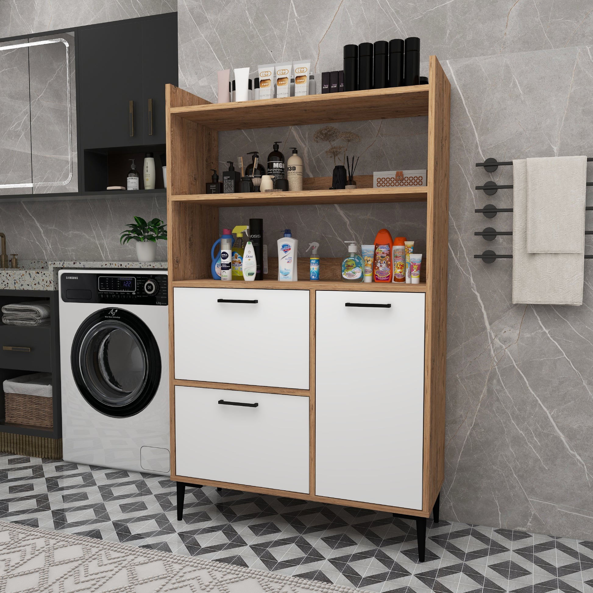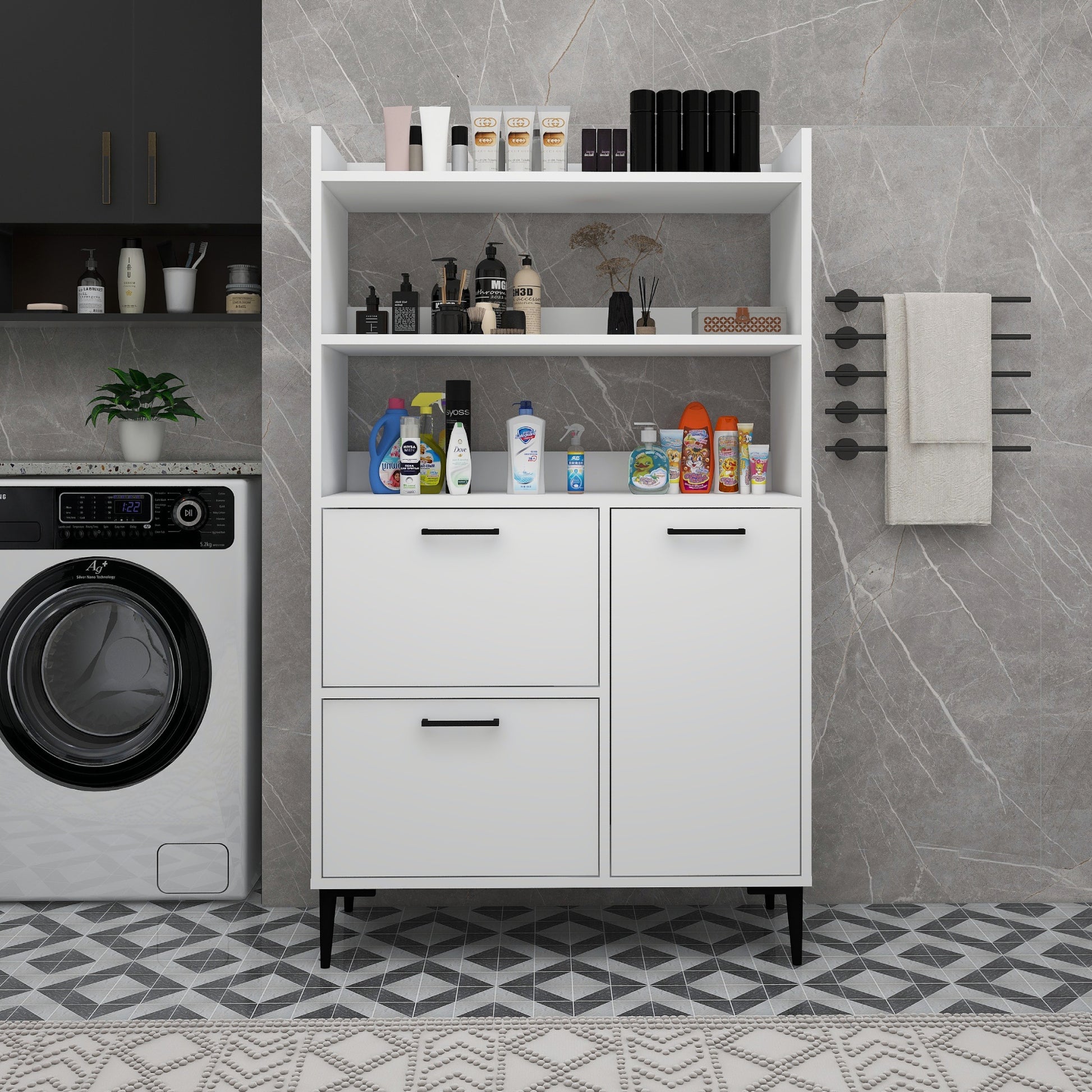 Ce meuble offre un vaste espace de rangement grâce à ses trois caissons dotés de quatre étagères intérieures chacun et de trois étagères ouvertes. Ses portes robustes sont dissimulées par des charnières métalliques et encadrées de quatre pieds en plastique de qualité pour une sécurité et une stabilité optimales. Créez une oasis de salle de bains contemporaine avec cette solution de rangement.