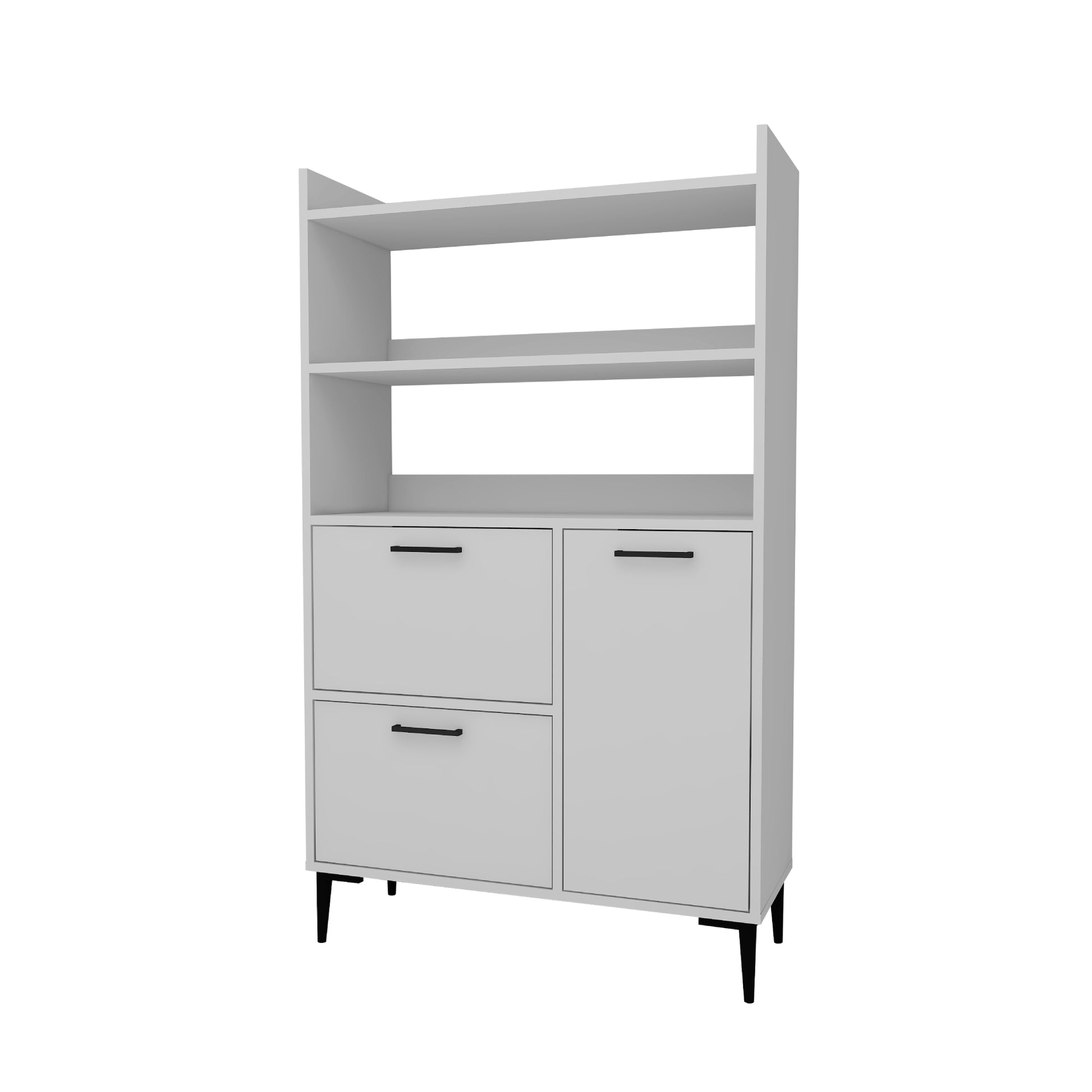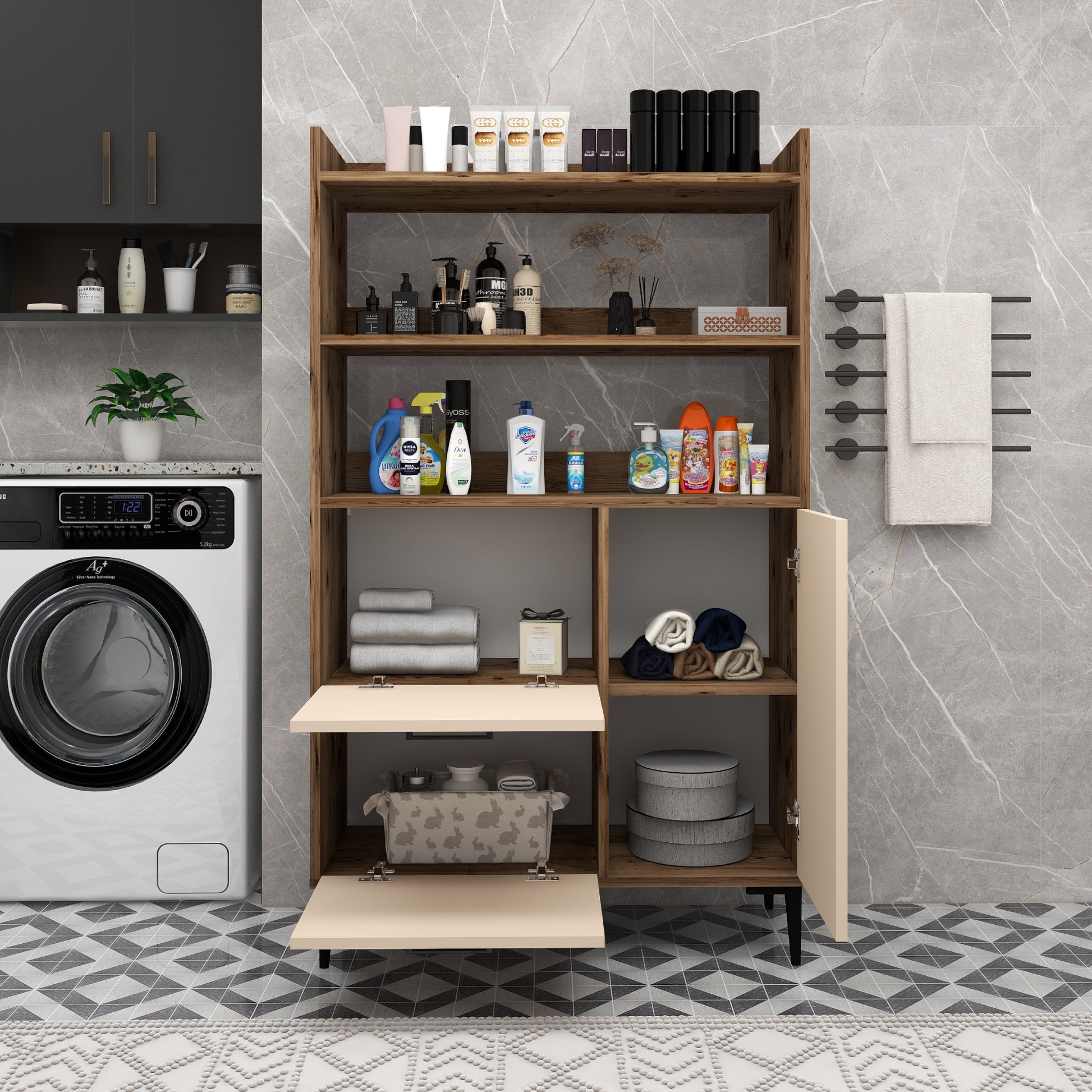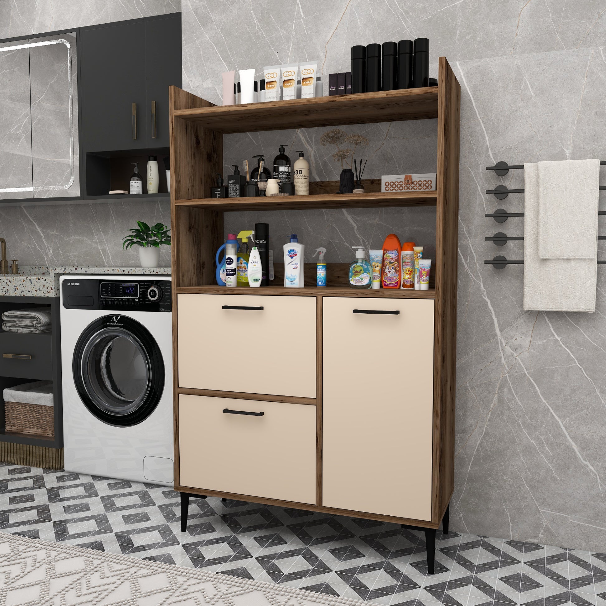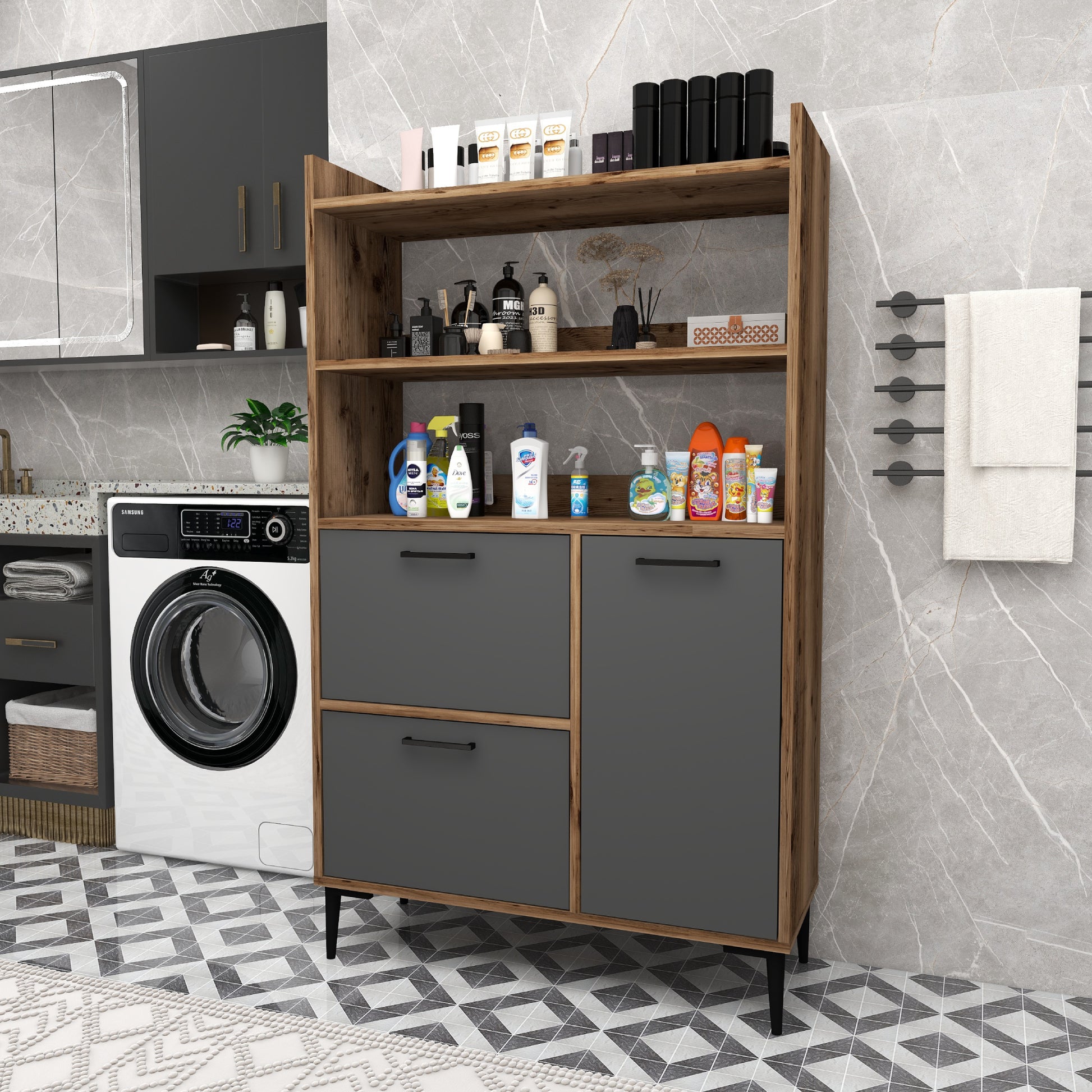 Ce meuble offre un vaste espace de rangement grâce à ses trois caissons dotés de quatre étagères intérieures chacun et de trois étagères ouvertes. Ses portes robustes sont dissimulées par des charnières métalliques et encadrées de quatre pieds en plastique de qualité pour une sécurité et une stabilité optimales. Créez une oasis de salle de bains contemporaine avec cette solution de rangement.