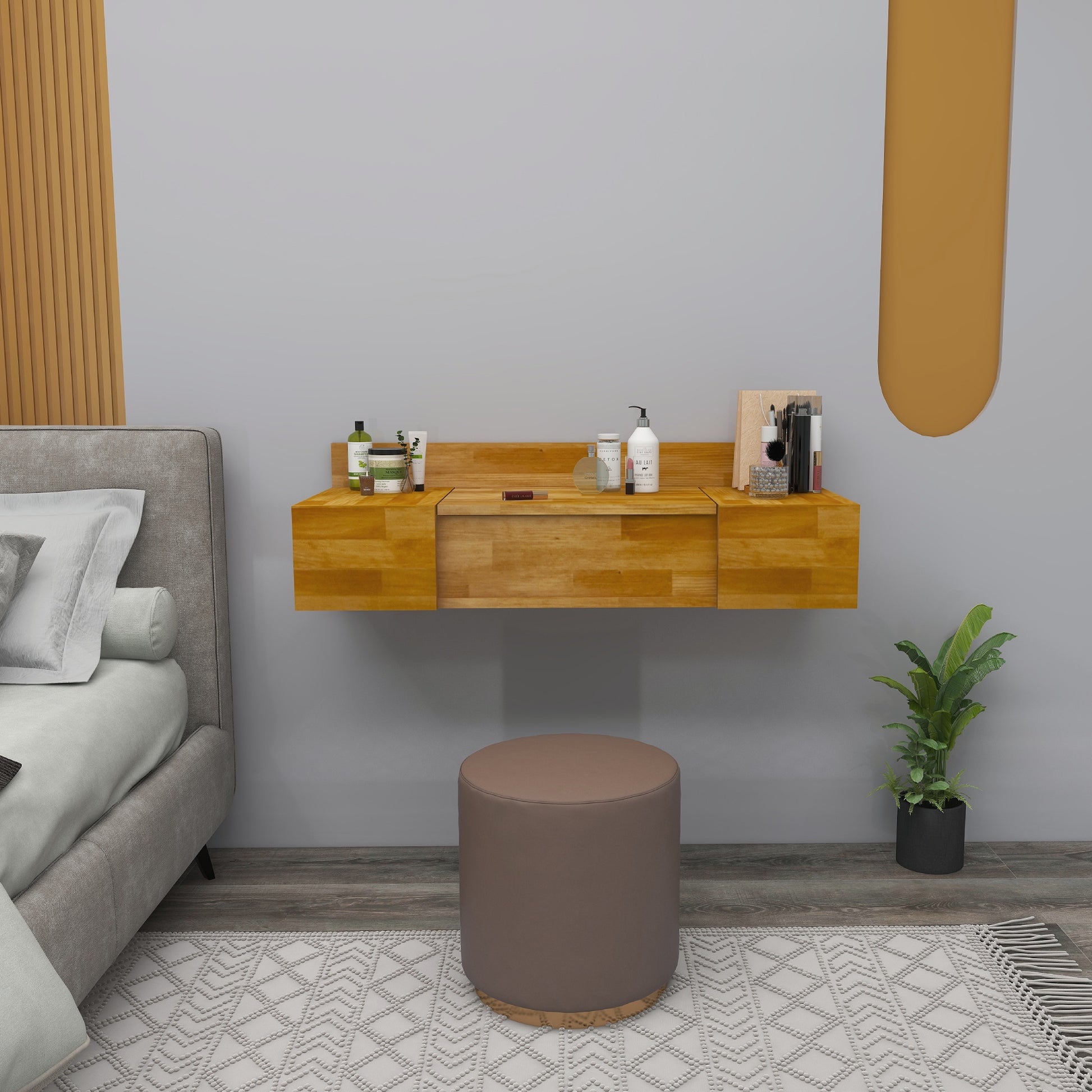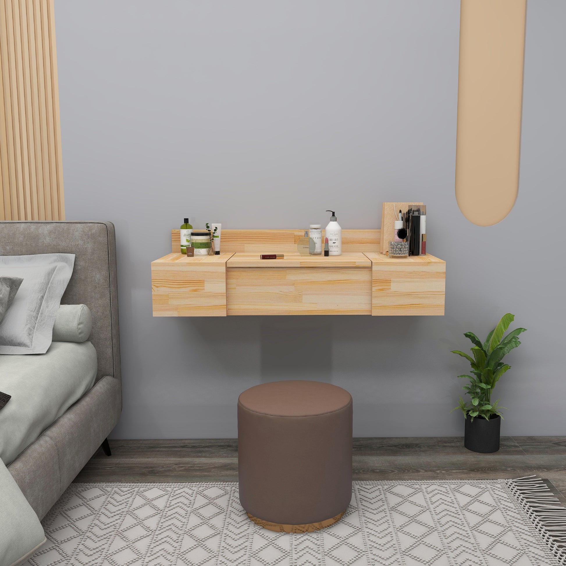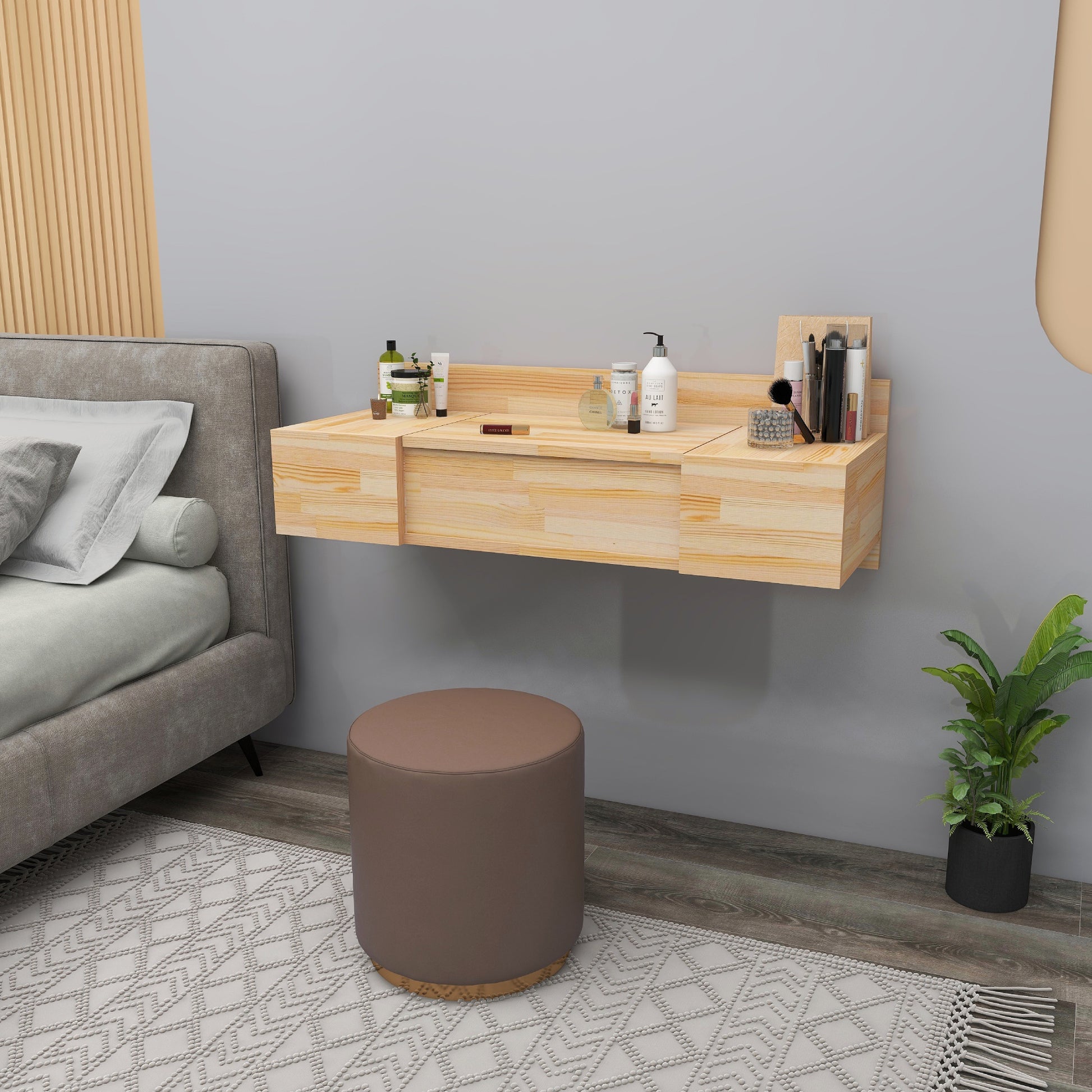 Cette coiffeuse artisanale allie modernité et sophistication grâce à sa structure en pin de 18 mm d'épaisseur, sa finition vernie et sa fixation murale. Elle comprend un miroir flottant intégré, une étagère supérieure et deux placards de rangement fermés, tous dotés de portes aux bords ovales lisses et de charnières métalliques dissimulées. De plus, la finition vernie du bois la rend résistante à l'eau. Assemblage facile avec une perceuse et un tournevis, et matériel de fixation murale inclus.