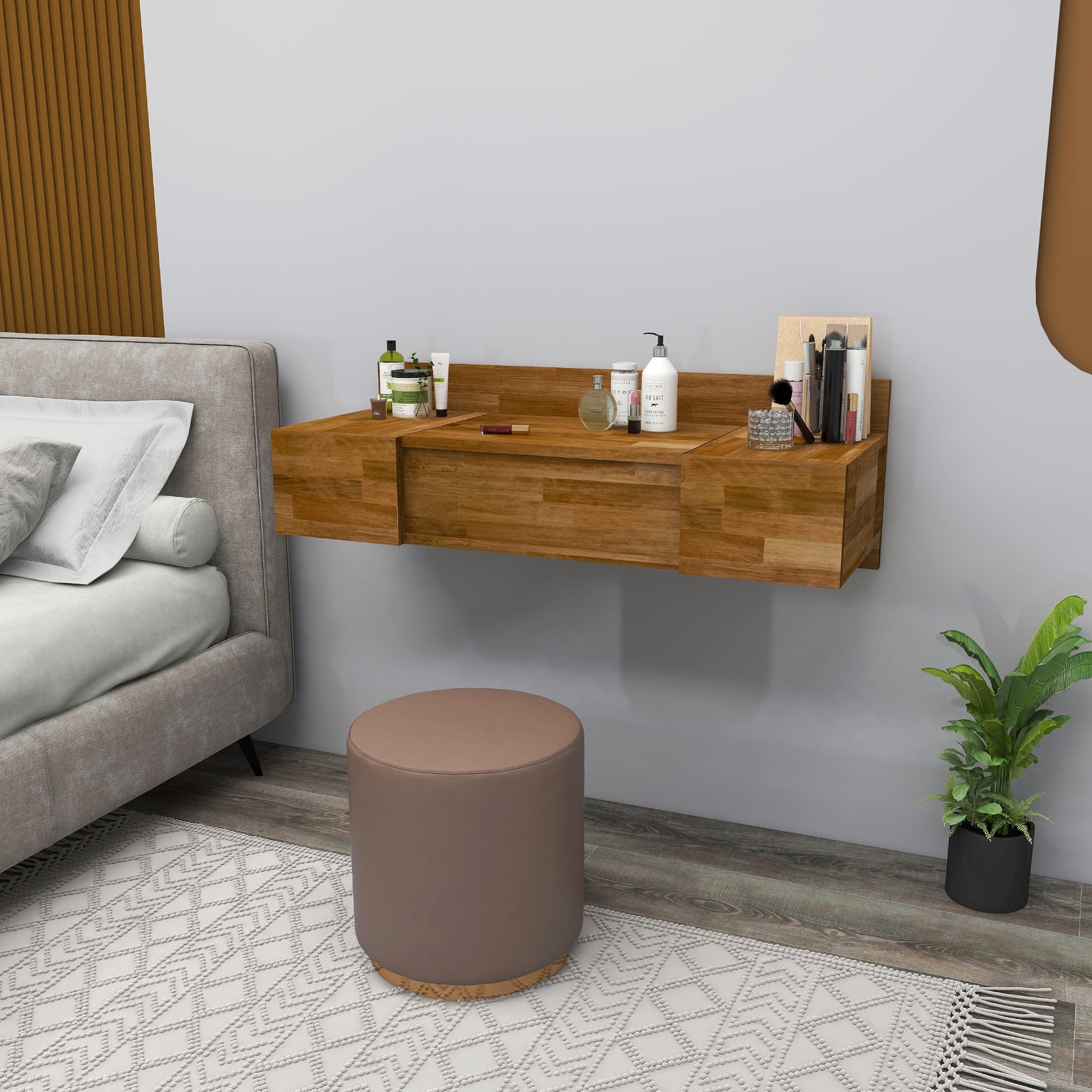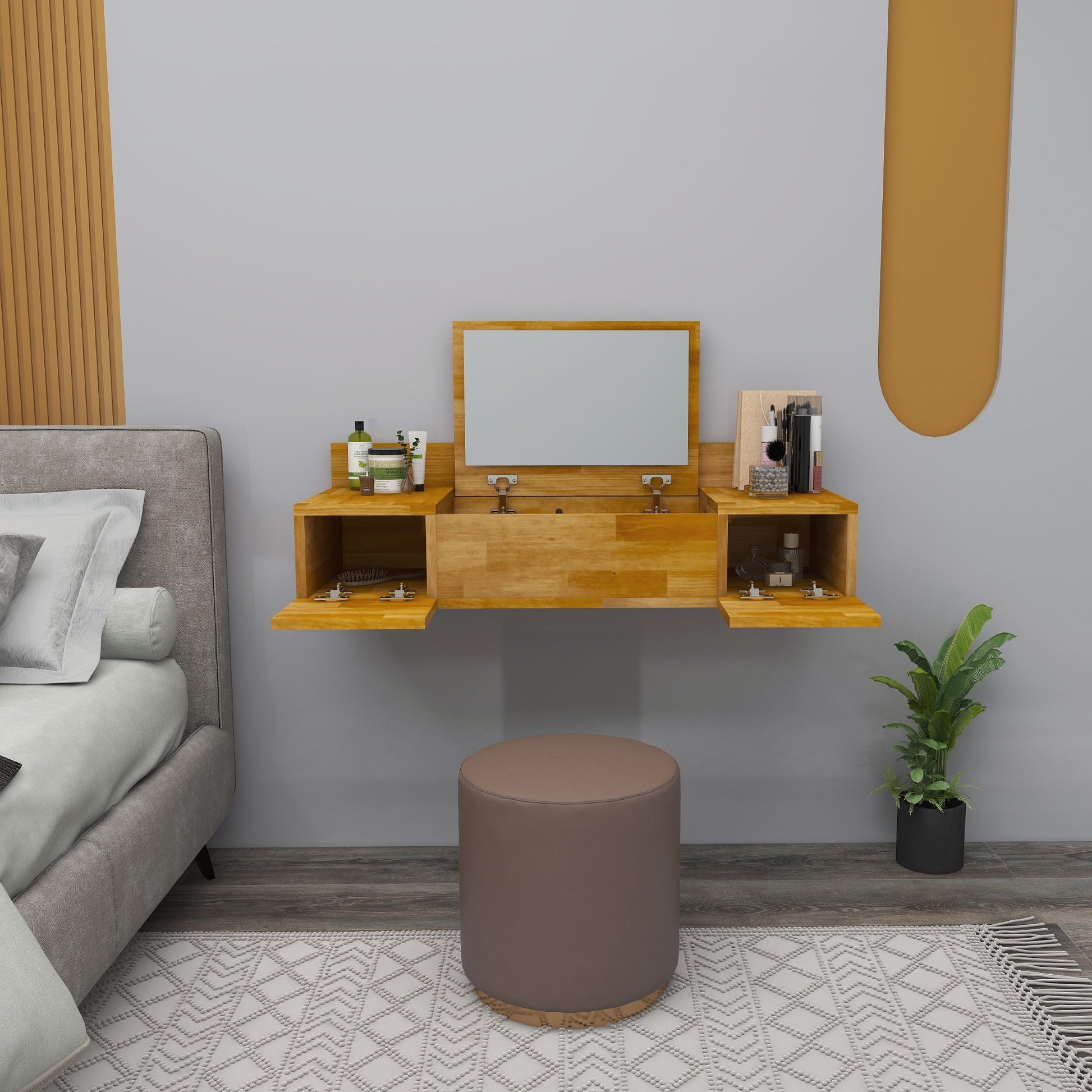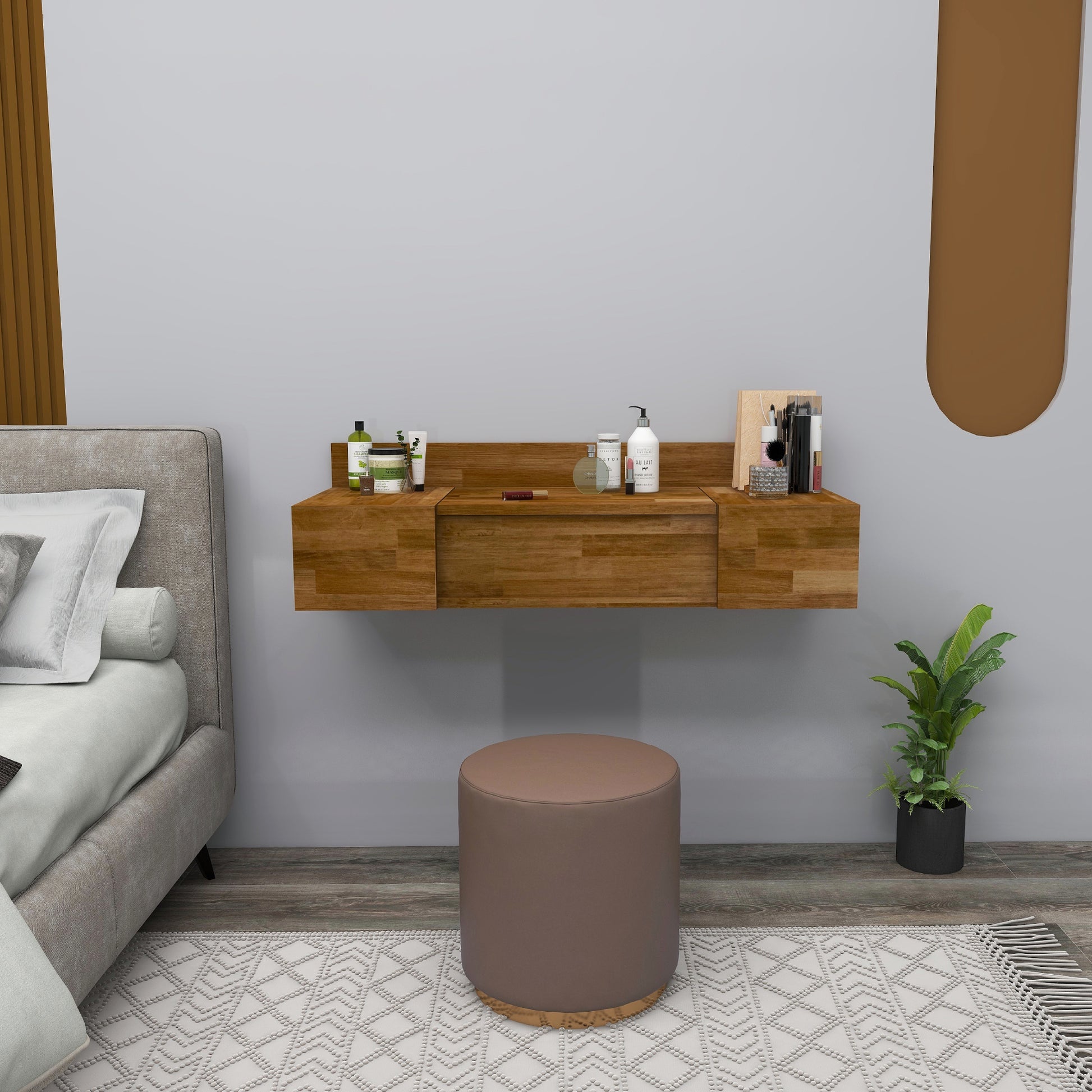 Cette coiffeuse artisanale allie modernité et sophistication grâce à sa structure en pin de 18 mm d'épaisseur, sa finition vernie et sa fixation murale. Elle comprend un miroir flottant intégré, une étagère supérieure et deux placards de rangement fermés, tous dotés de portes aux bords ovales lisses et de charnières métalliques dissimulées. De plus, la finition vernie du bois la rend résistante à l'eau. Assemblage facile avec une perceuse et un tournevis, et matériel de fixation murale inclus.