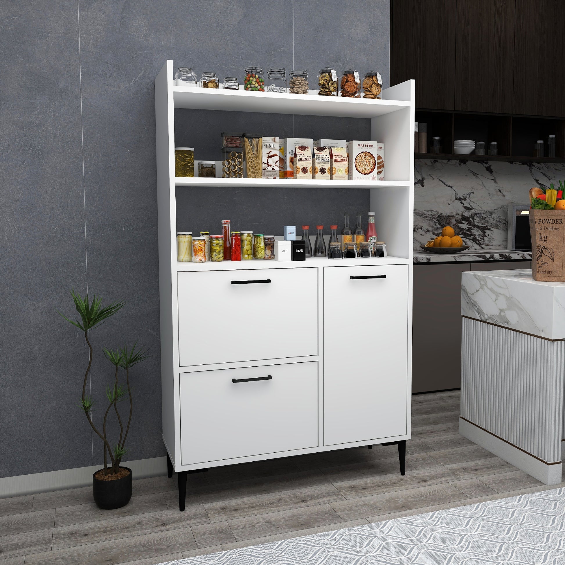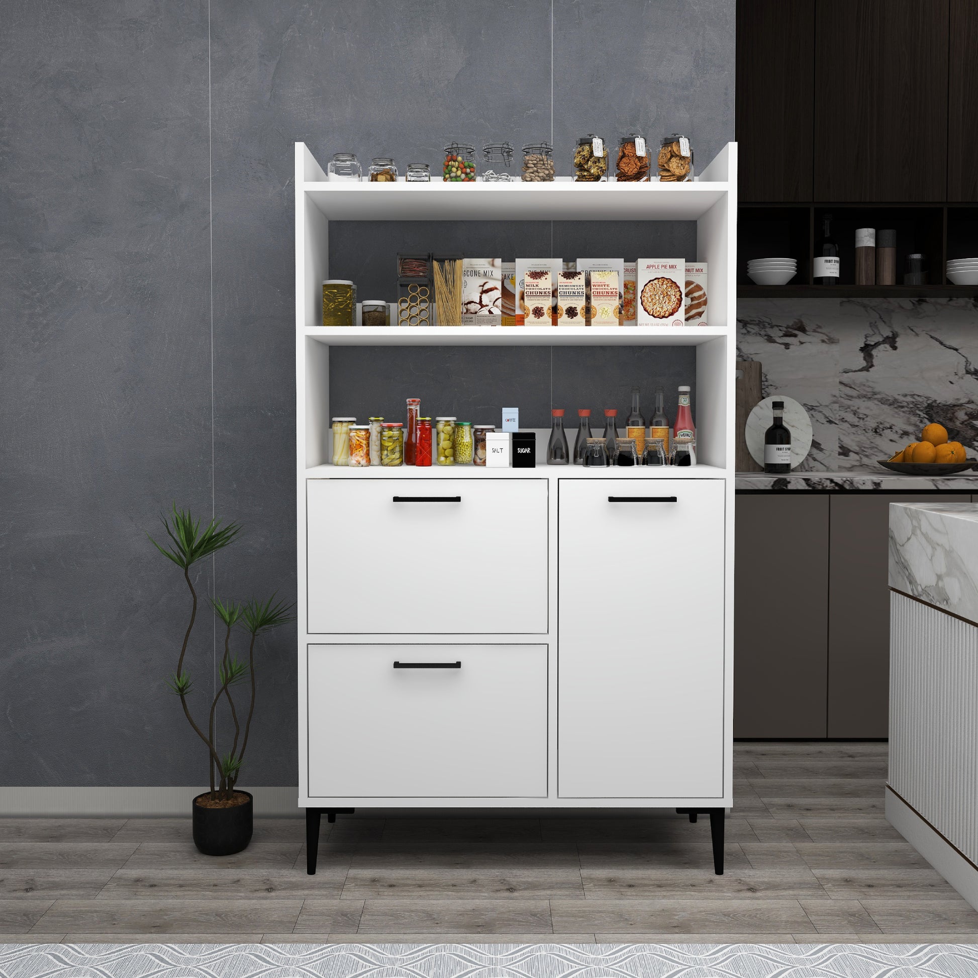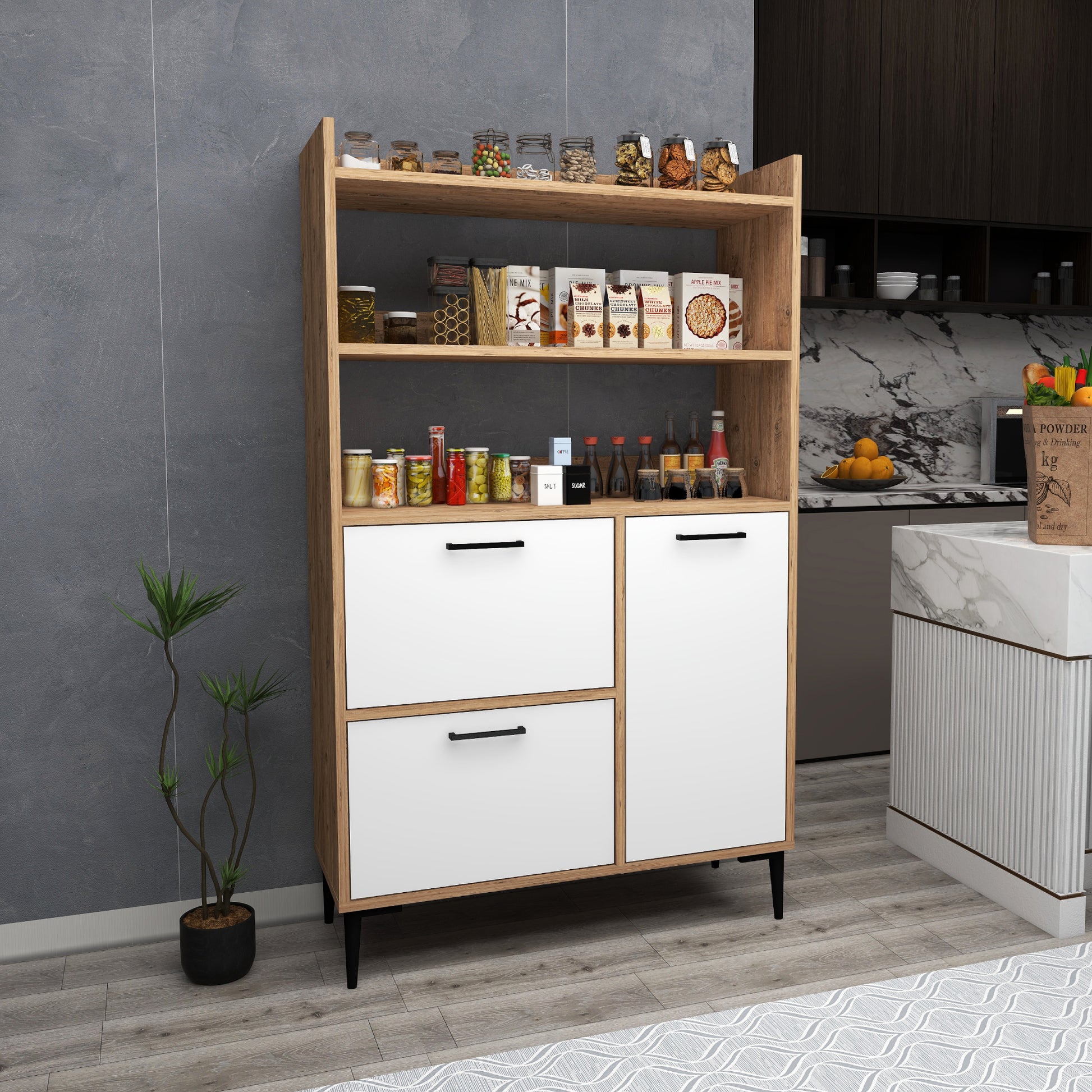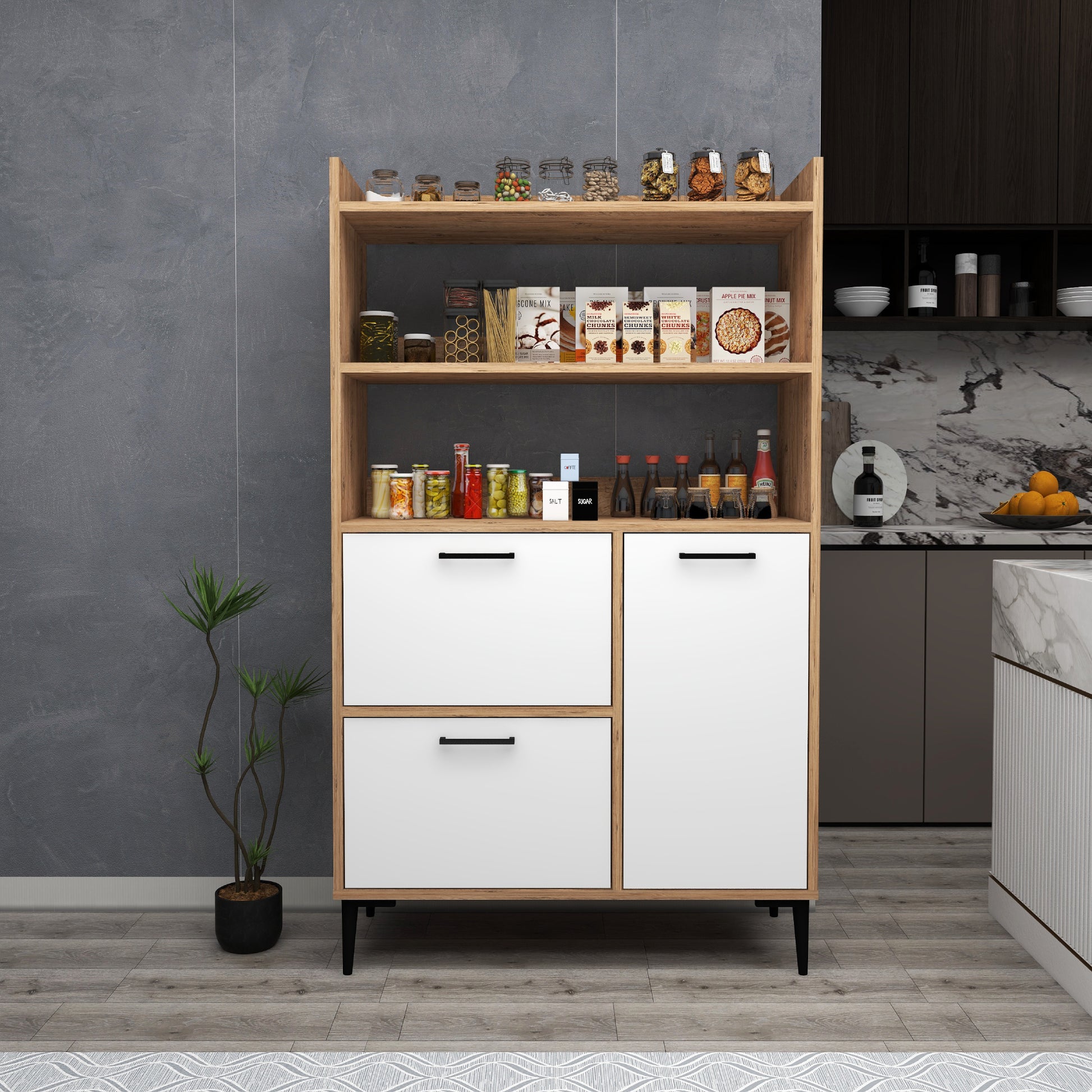 Ce meuble offre un vaste espace de rangement grâce à ses trois caissons dotés de quatre étagères intérieures chacun et de trois étagères ouvertes. Les portes robustes sont dissimulées par des charnières métalliques et encadrées de quatre pieds en plastique de qualité pour une sécurité et une stabilité maximales. Créez une oasis de cuisine contemporaine avec cette solution de rangement.