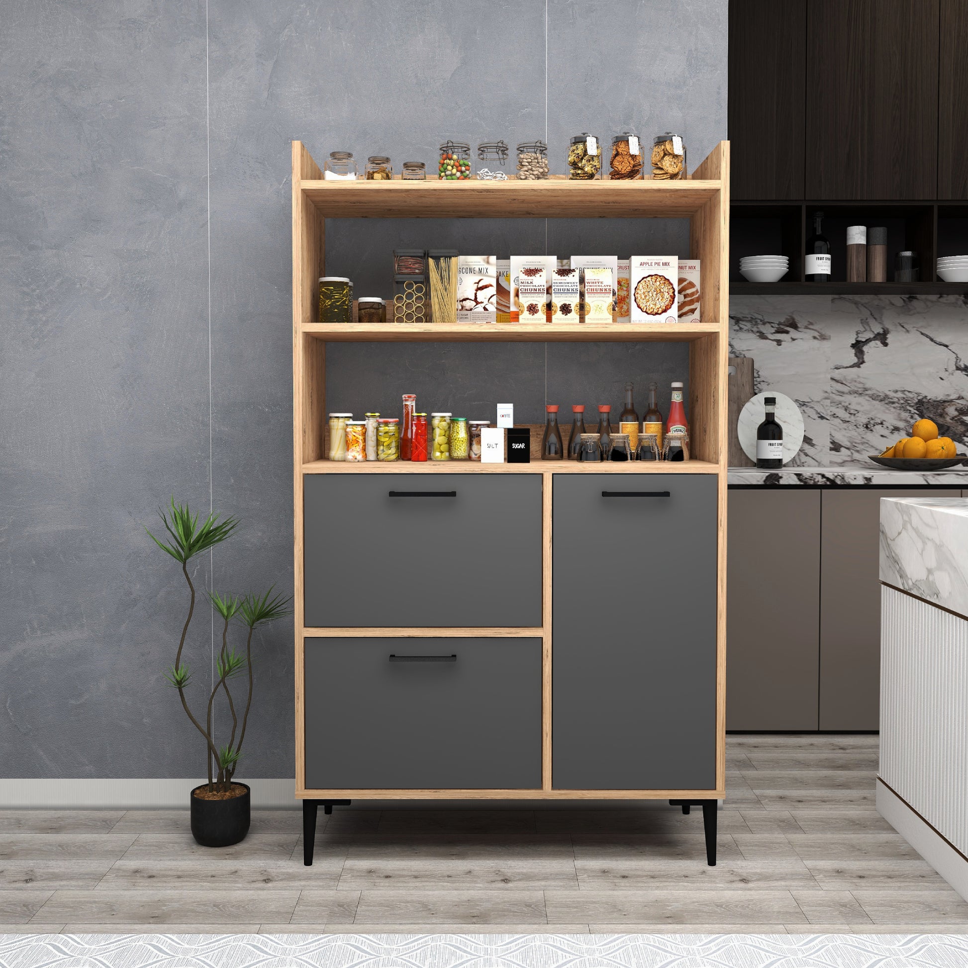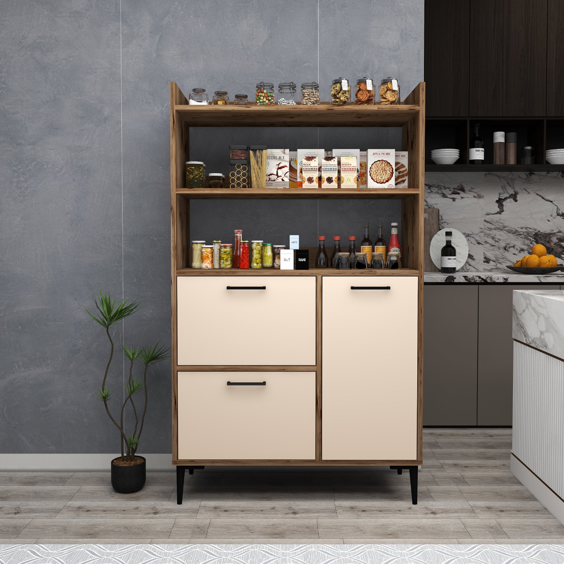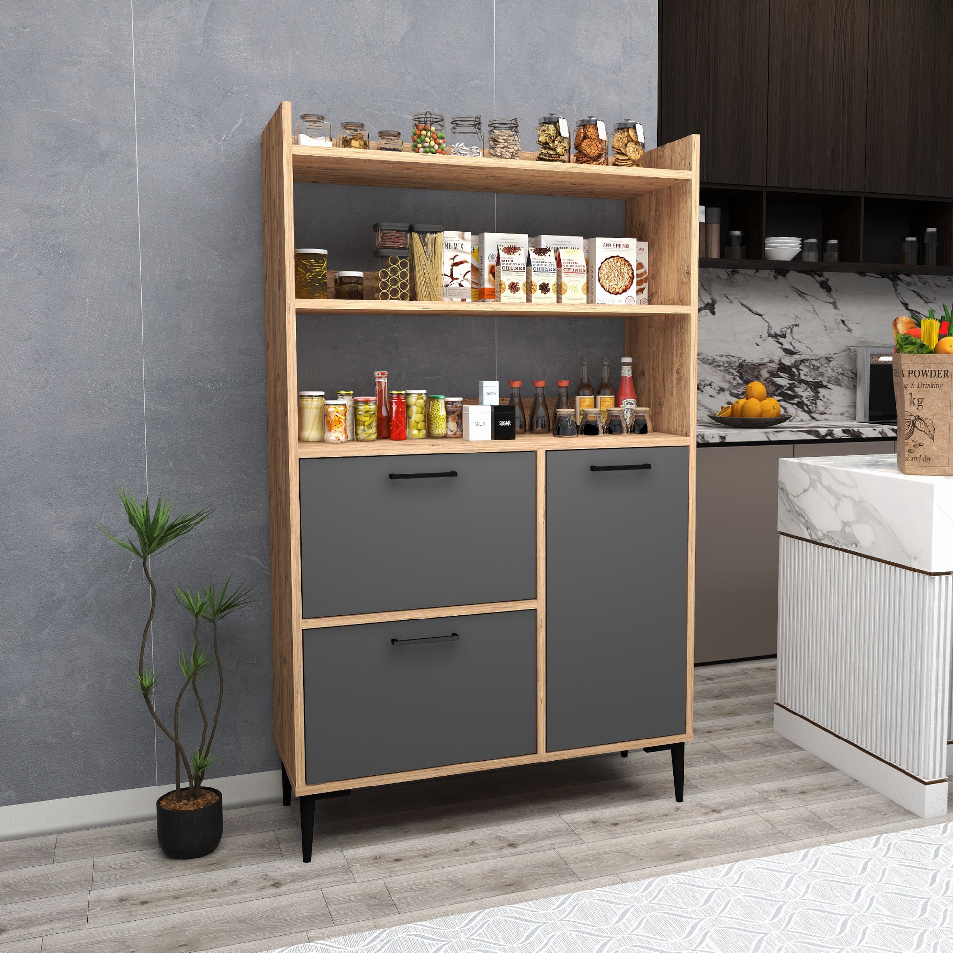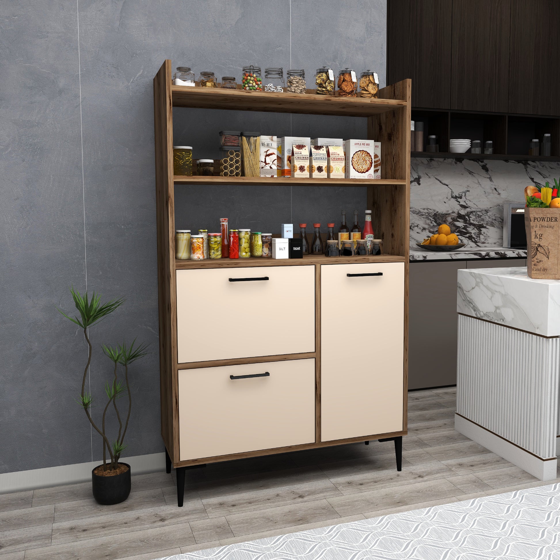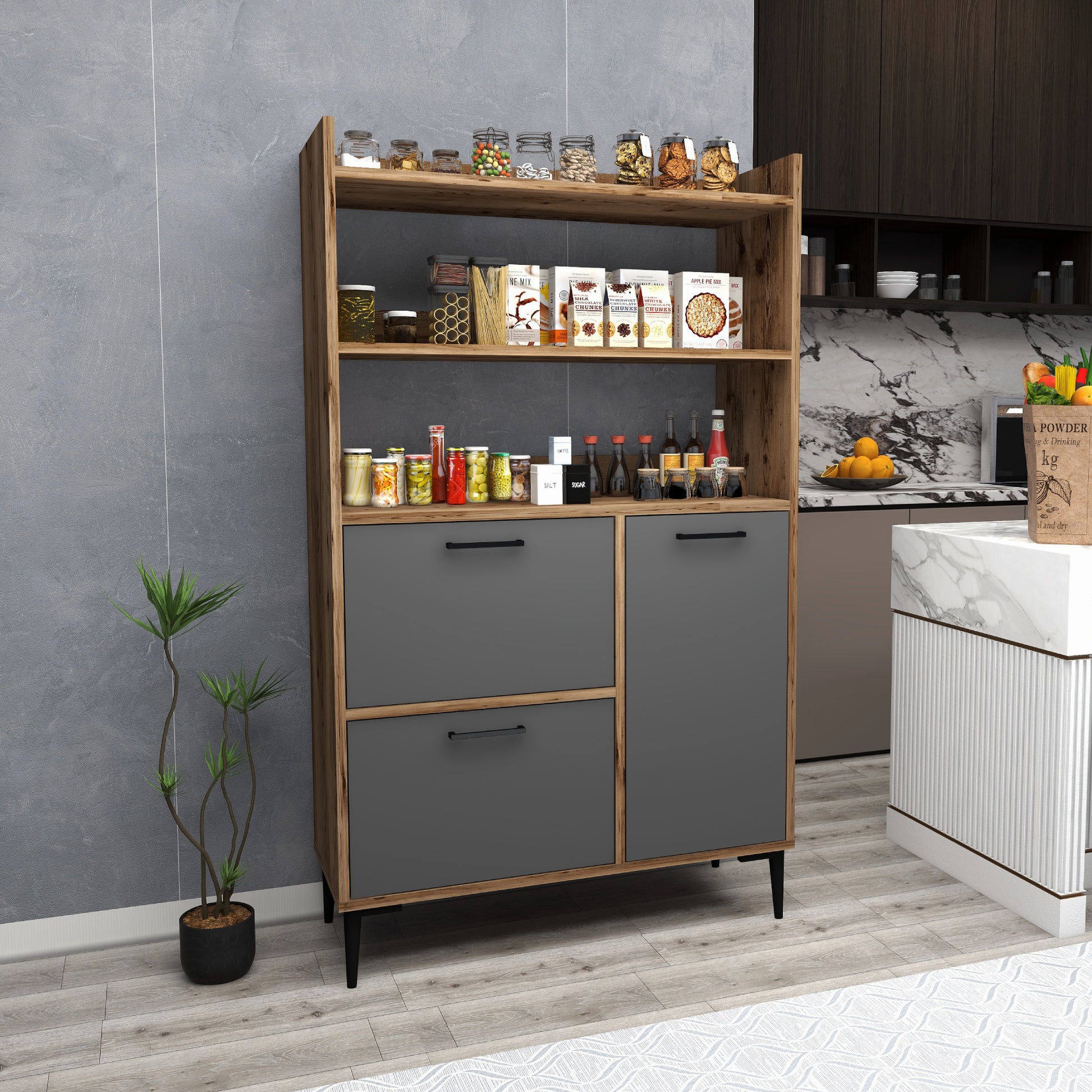 Ce meuble offre un vaste espace de rangement grâce à ses trois caissons dotés de quatre étagères intérieures chacun et de trois étagères ouvertes. Les portes robustes sont dissimulées par des charnières métalliques et encadrées de quatre pieds en plastique de qualité pour une sécurité et une stabilité maximales. Créez une oasis de cuisine contemporaine avec cette solution de rangement.