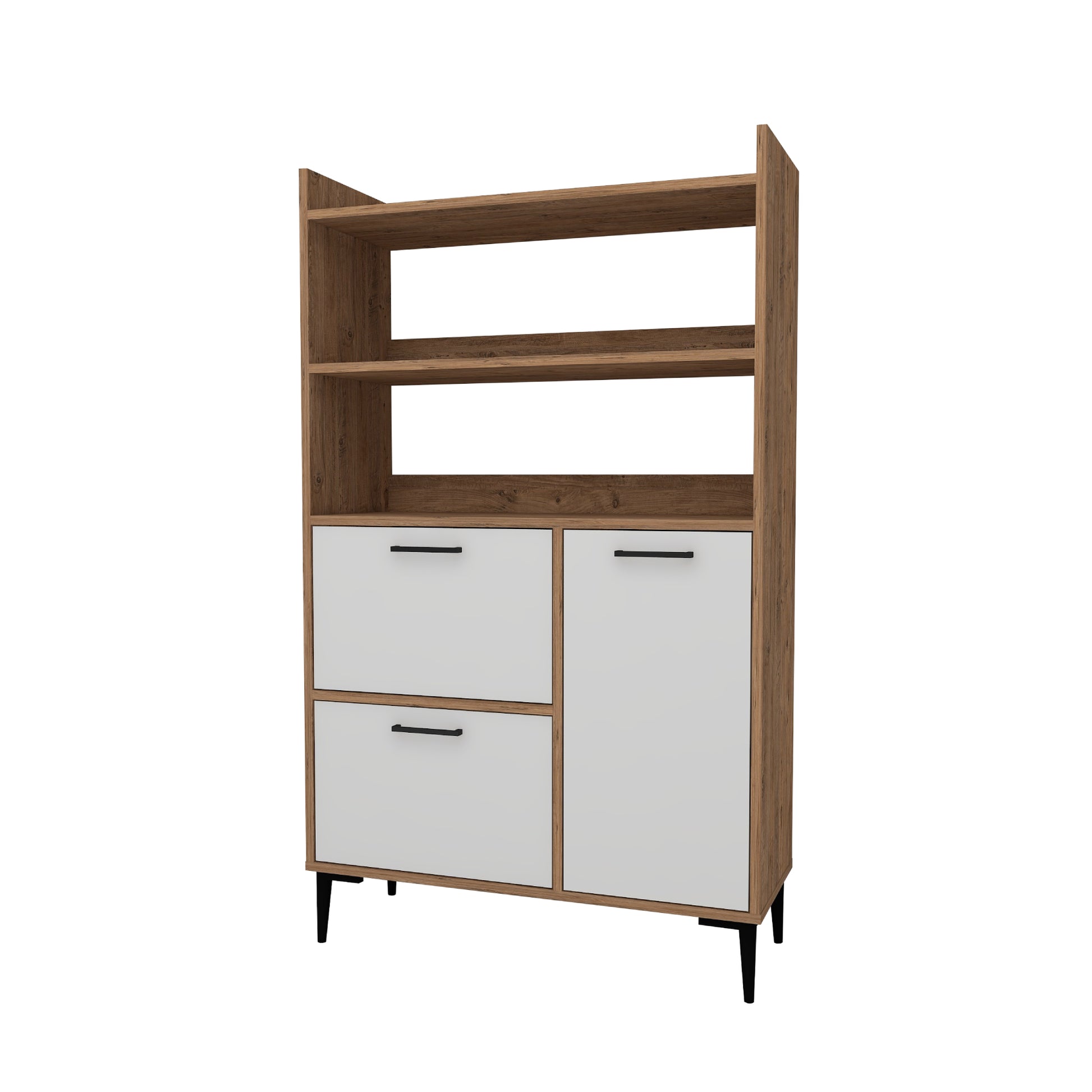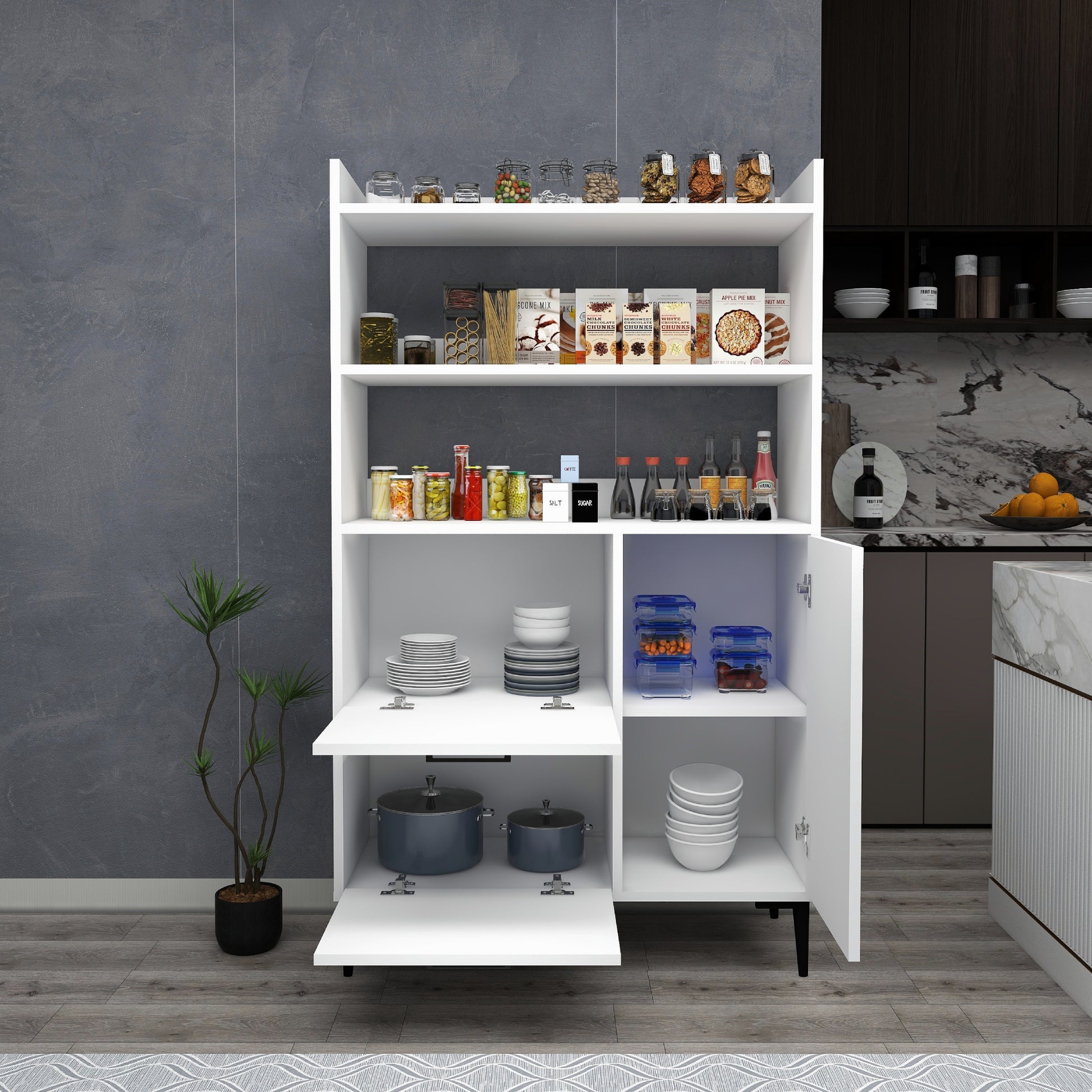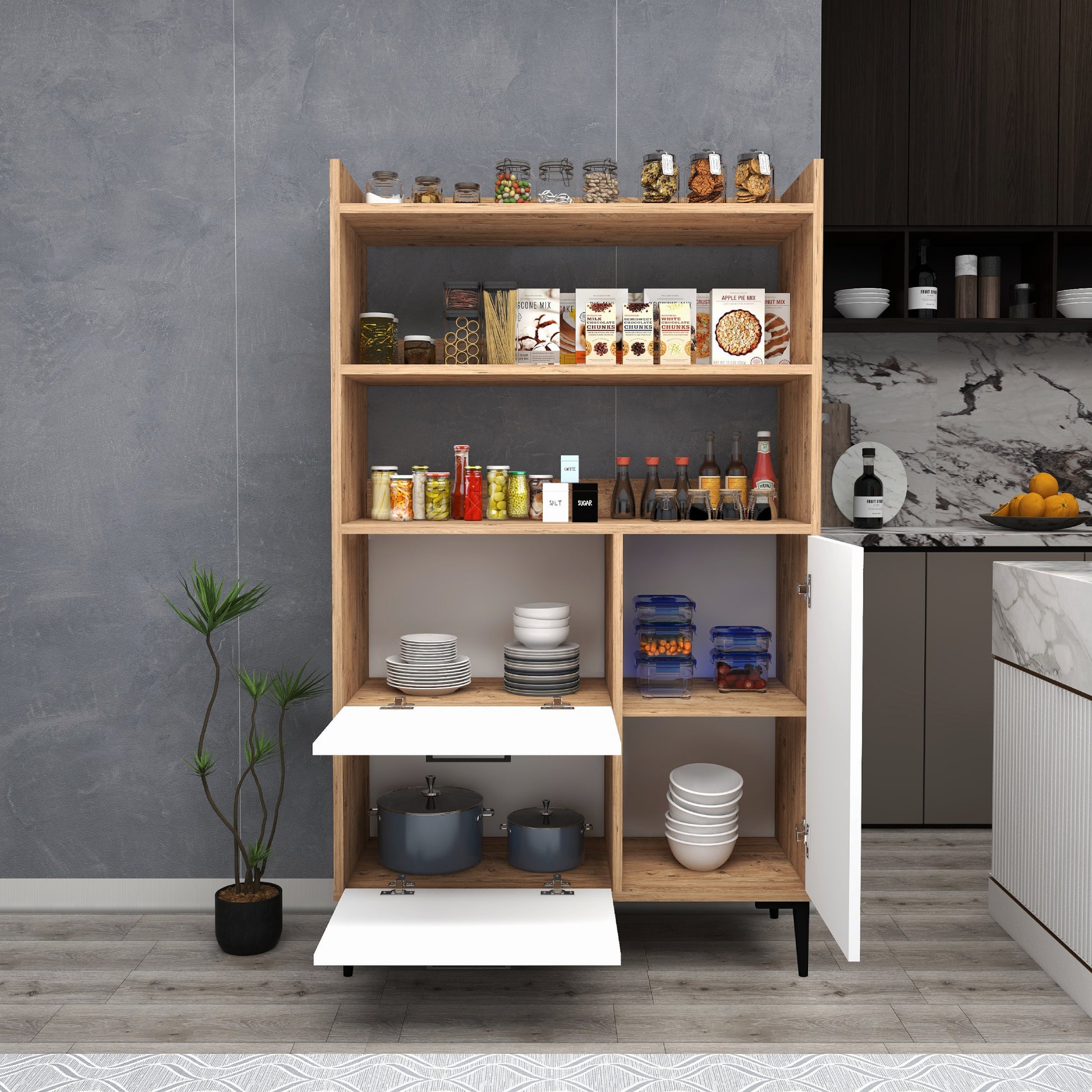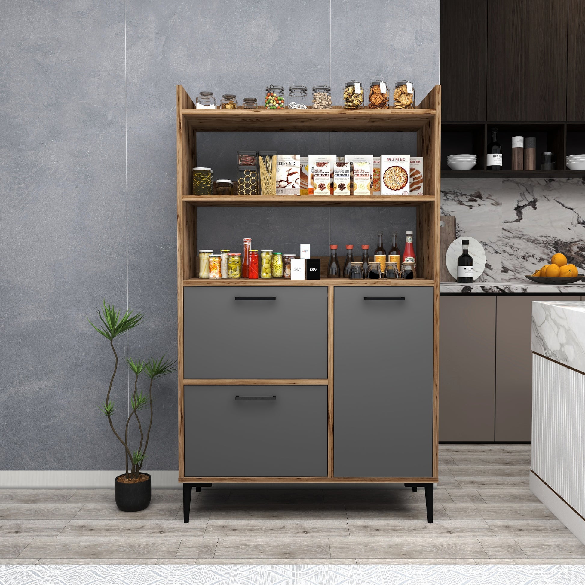 Ce meuble offre un vaste espace de rangement grâce à ses trois caissons dotés de quatre étagères intérieures chacun et de trois étagères ouvertes. Les portes robustes sont dissimulées par des charnières métalliques et encadrées de quatre pieds en plastique de qualité pour une sécurité et une stabilité maximales. Créez une oasis de cuisine contemporaine avec cette solution de rangement.