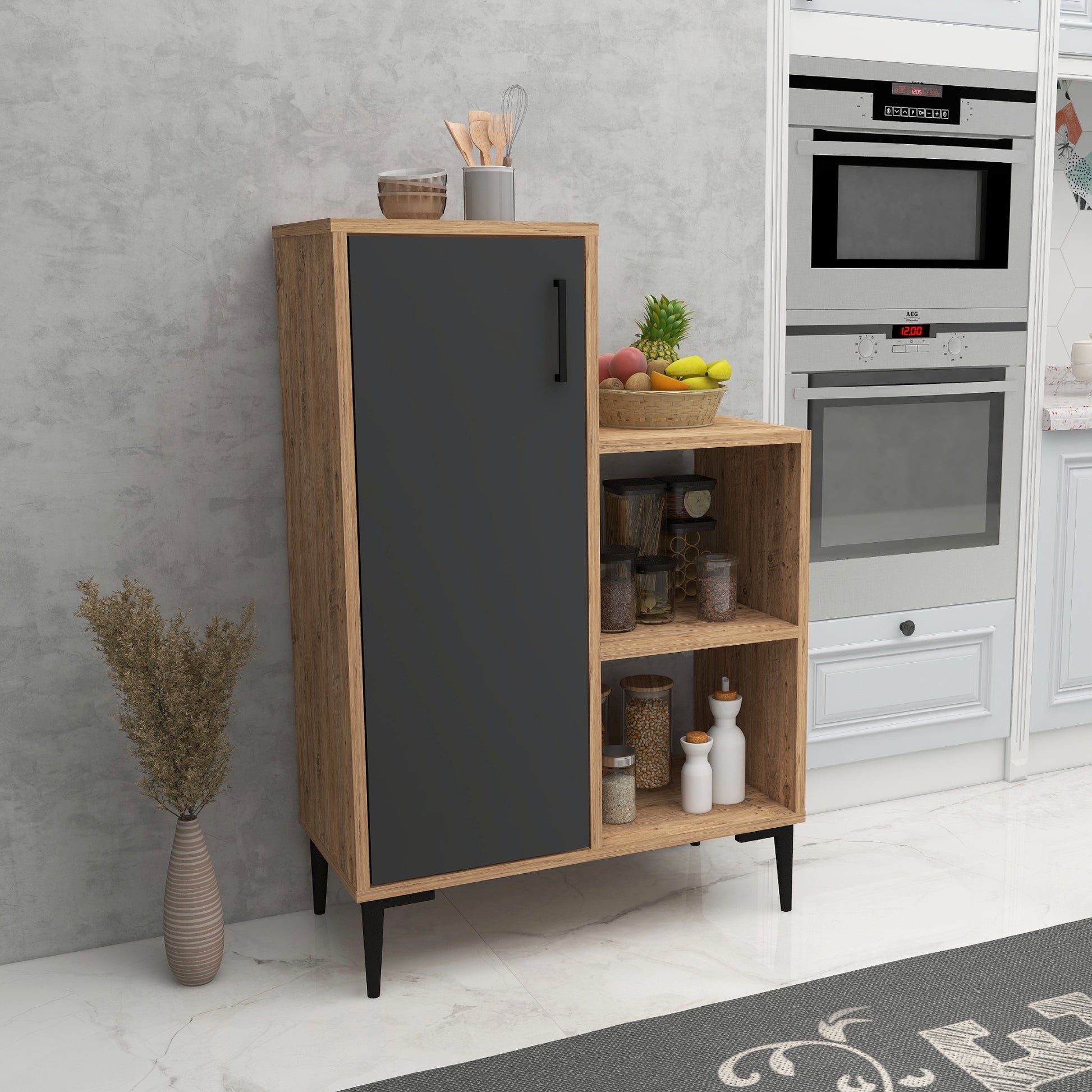 Ce meuble de cuisine contemporain est parfait pour tous les intérieurs. Il dispose de deux étagères de rangement ouvertes et d'un placard avec quatre étagères intérieures, offrant un espace généreux pour tous vos besoins. Fabriqué en panneaux de particules de 18 mm d'épaisseur et recouvert d'un placage mélaminé résistant, ce meuble est conçu pour durer. Ses quatre pieds en plastique de qualité offrent un support robuste, tandis que sa poignée de porte en plastique apporte une touche moderne. Modernisez votre cuisine avec le meuble de cuisine Beate avec étagères.