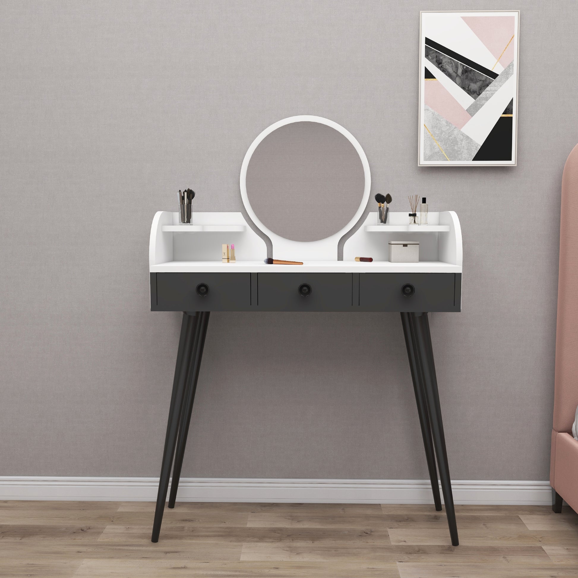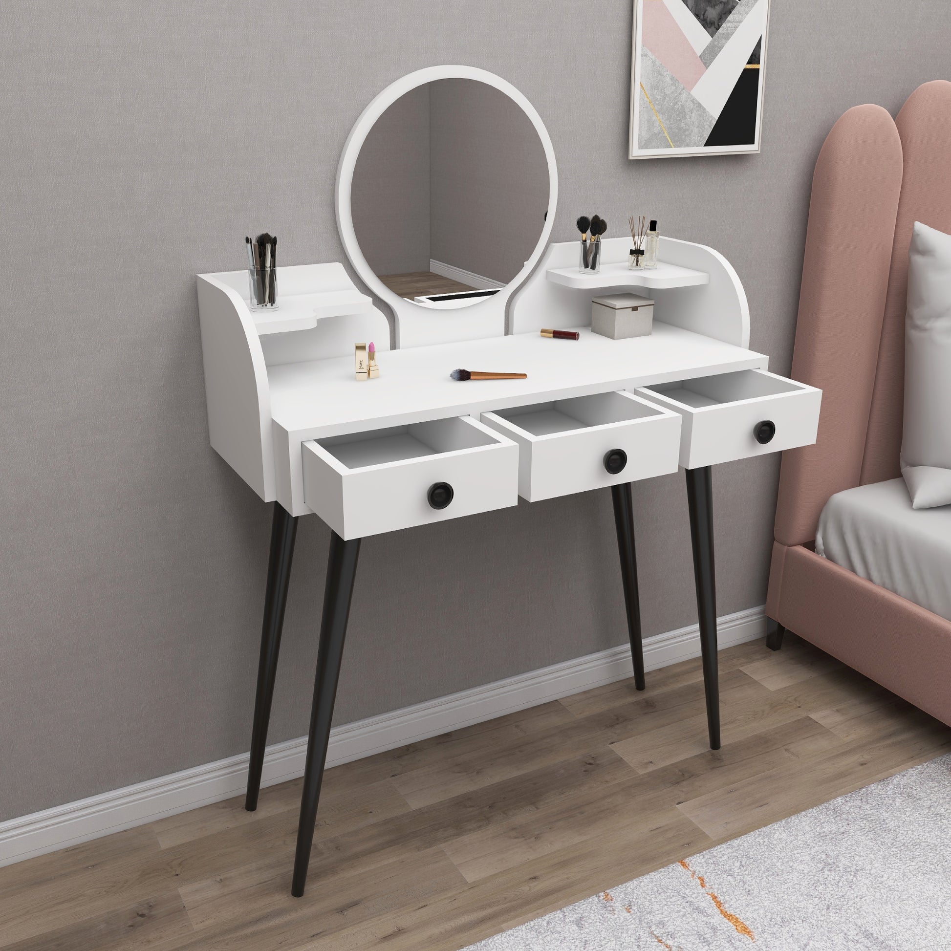 Découvrez l'accessoire idéal pour votre chambre : la coiffeuse Belem avec miroir. Elle est dotée de pieds en hêtre massif, de 3 tiroirs de rangement fermés et de 2 étagères ouvertes, le tout en panneaux de particules de 18 mm d'épaisseur, plaqués mélaminés et résistants à l'eau. Le miroir intégré apporte une touche d'élégance et de finition parfaite. Montage facile avec une perceuse et un tournevis.