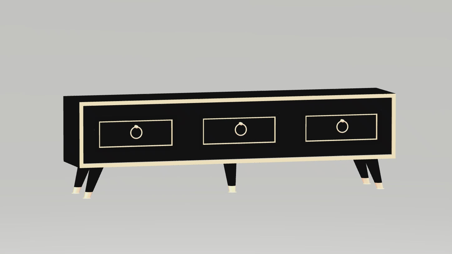 Meuble TV HAUTEUR : 17,5" / 44,6 cm | LARGEUR : 59" / 150 cm | PROFONDEUR : 11,6" / 29,6 cm.
