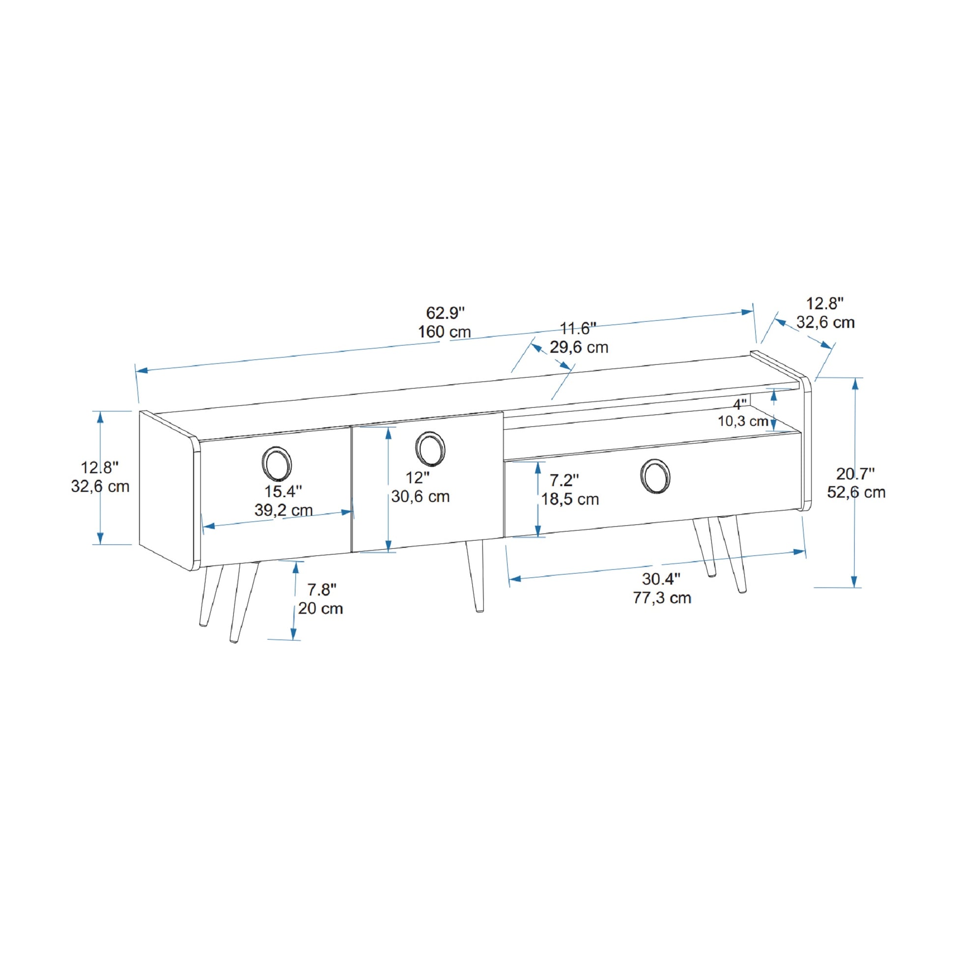HAUTEUR : 20,7" / 52,6 cm | LARGEUR : 62,9" / 160 cm | PROFONDEUR : 12,8" / 32,6 cm.