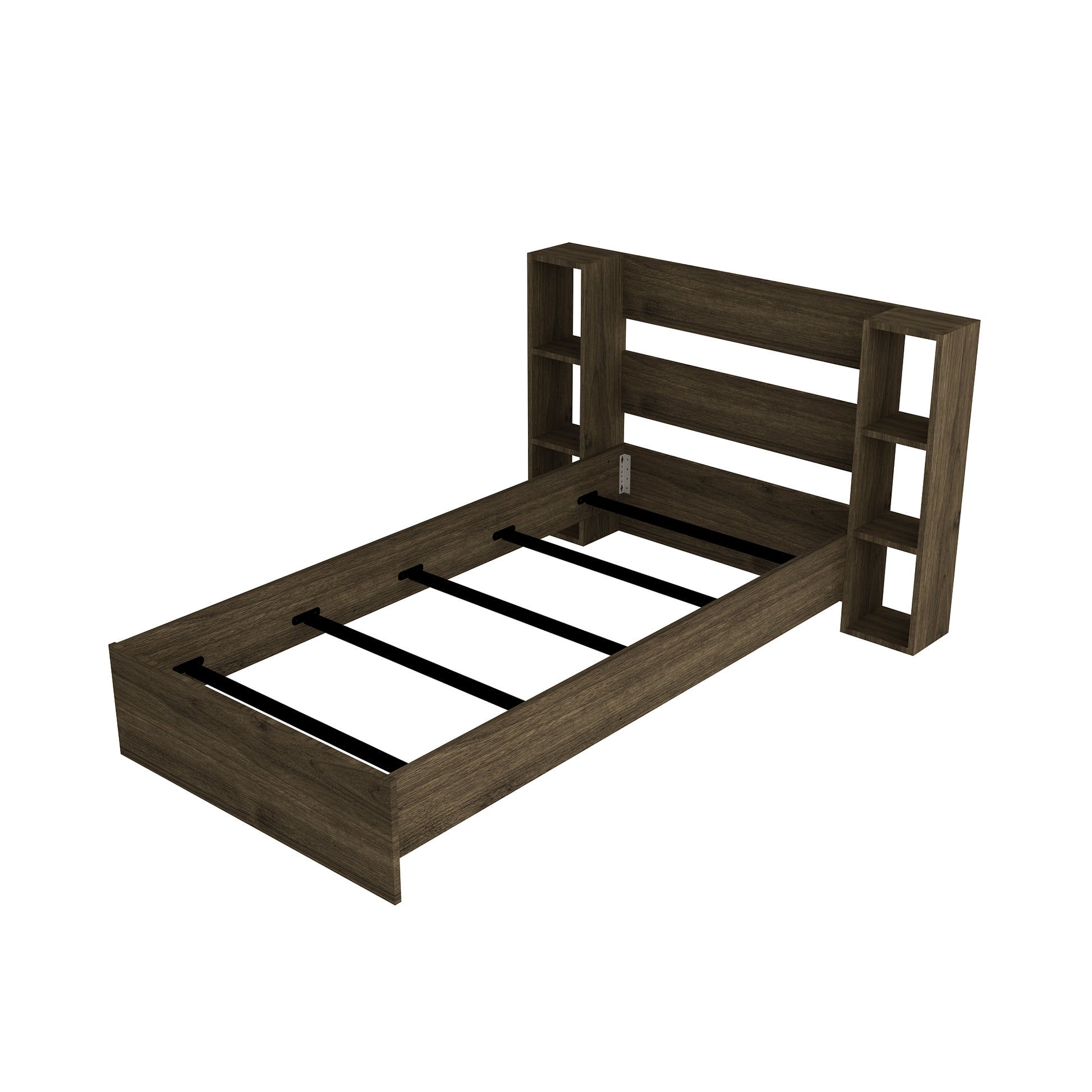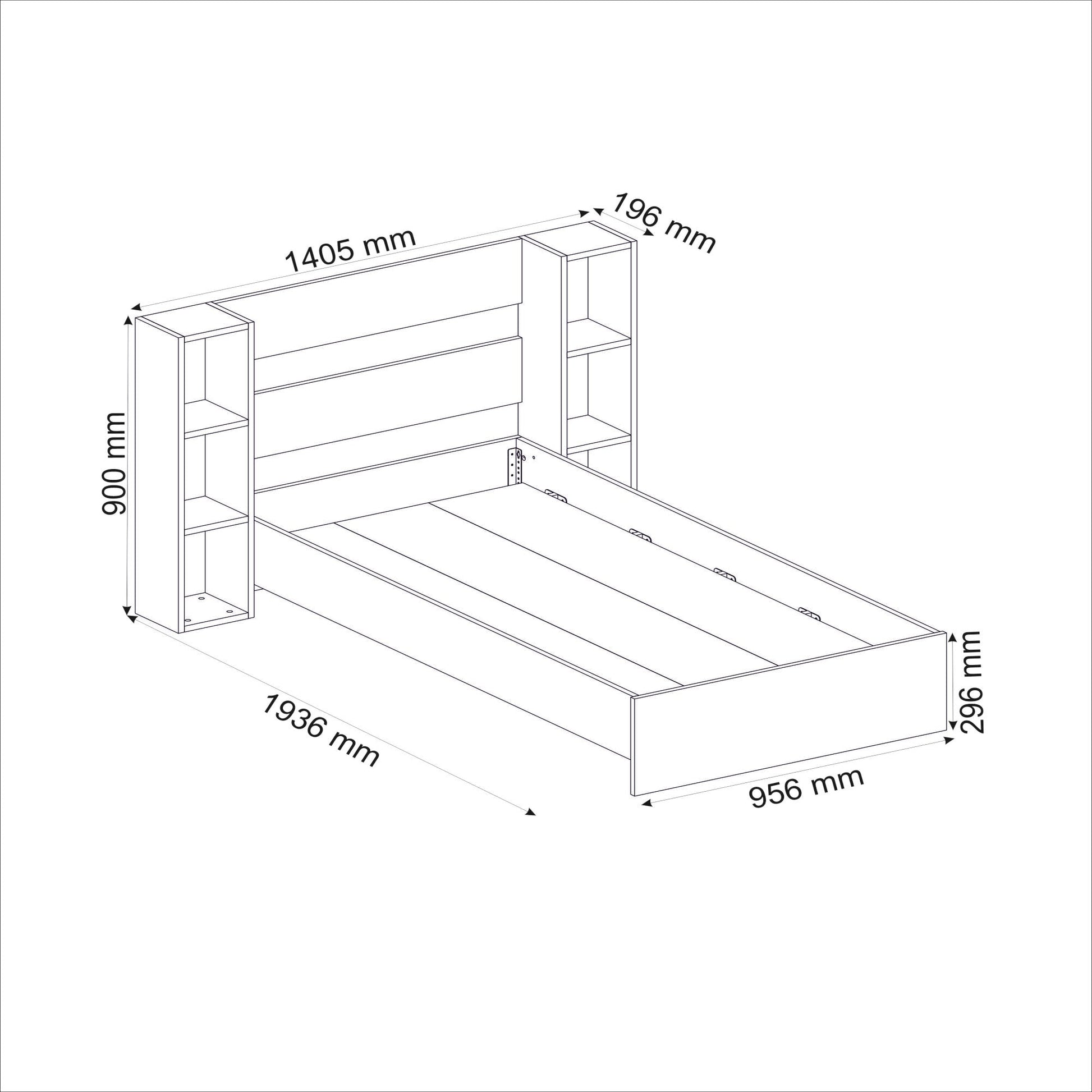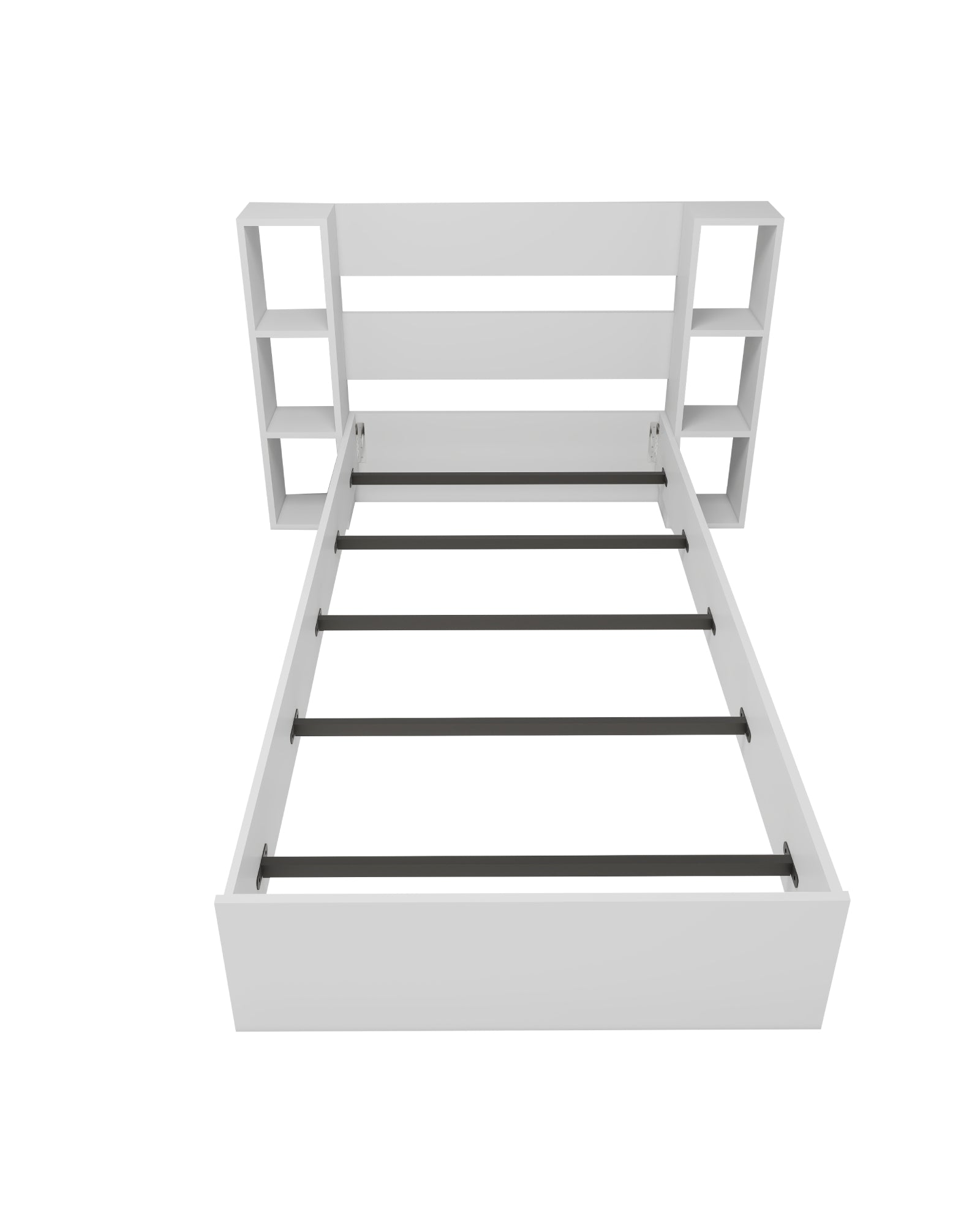 The bedstead bed frame with storage shelves is ideal for modern bedrooms. The frame is made of manufactured wood with metal slats to support a 190x90 cm mattress. It also has six shelves for storage designed on both sides of the bed, offering ample extra space in smaller rooms.