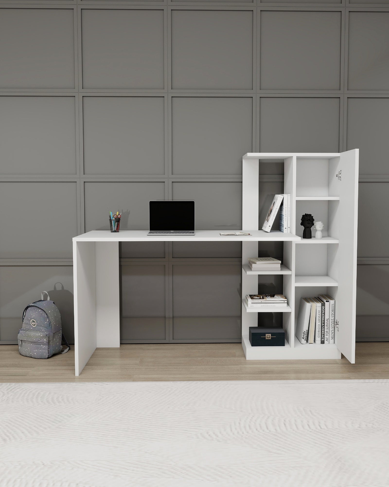 Upgrade your workspace with this modern computer desk featuring an integrated shelving unit. It includes three open shelves for easy access storage and a cabinet with four internal shelves to keep essentials organised. Crafted from durable 18mm particleboard with a water-resistant melamine finish, this desk combines functionality and contemporary style - perfect for home offices or study areas.