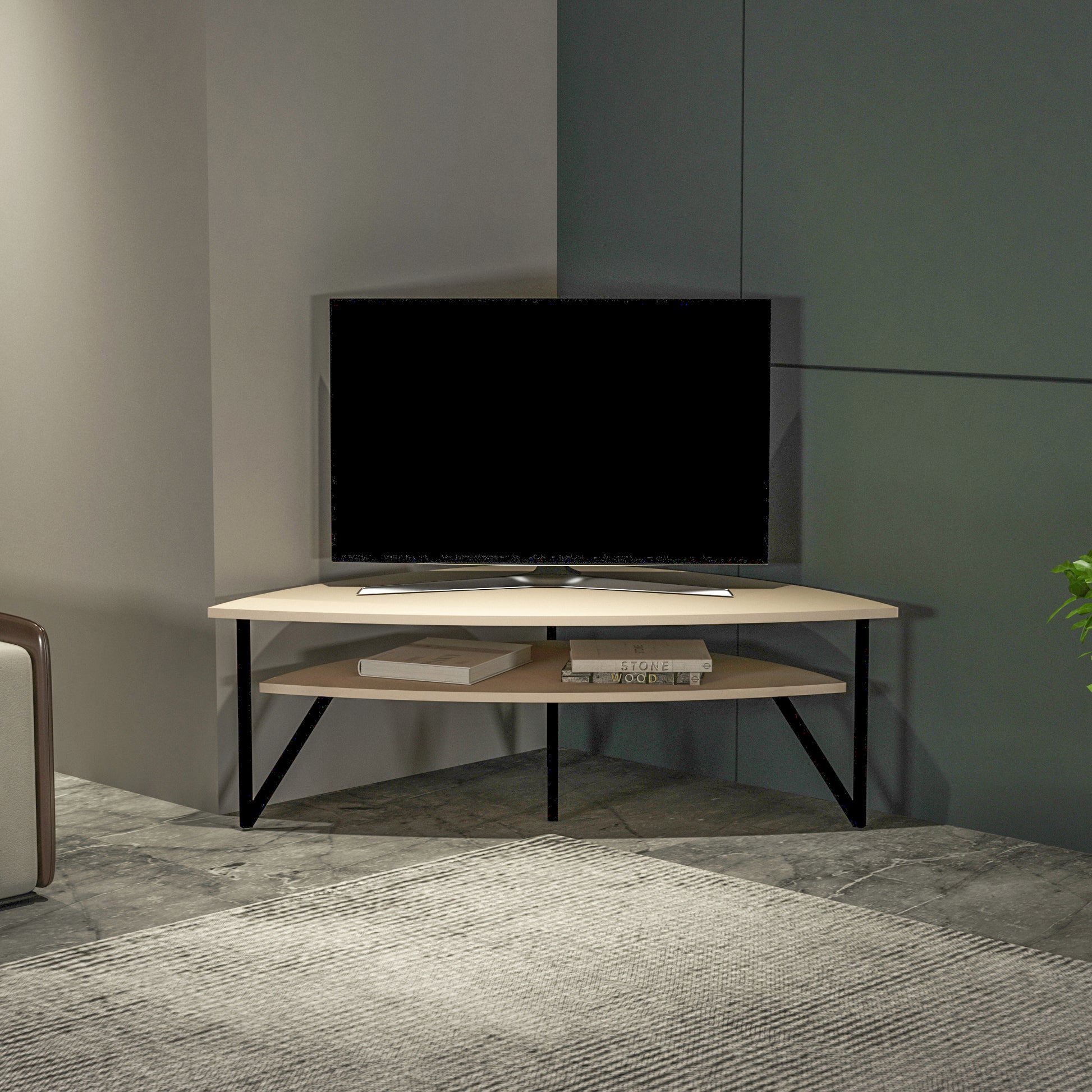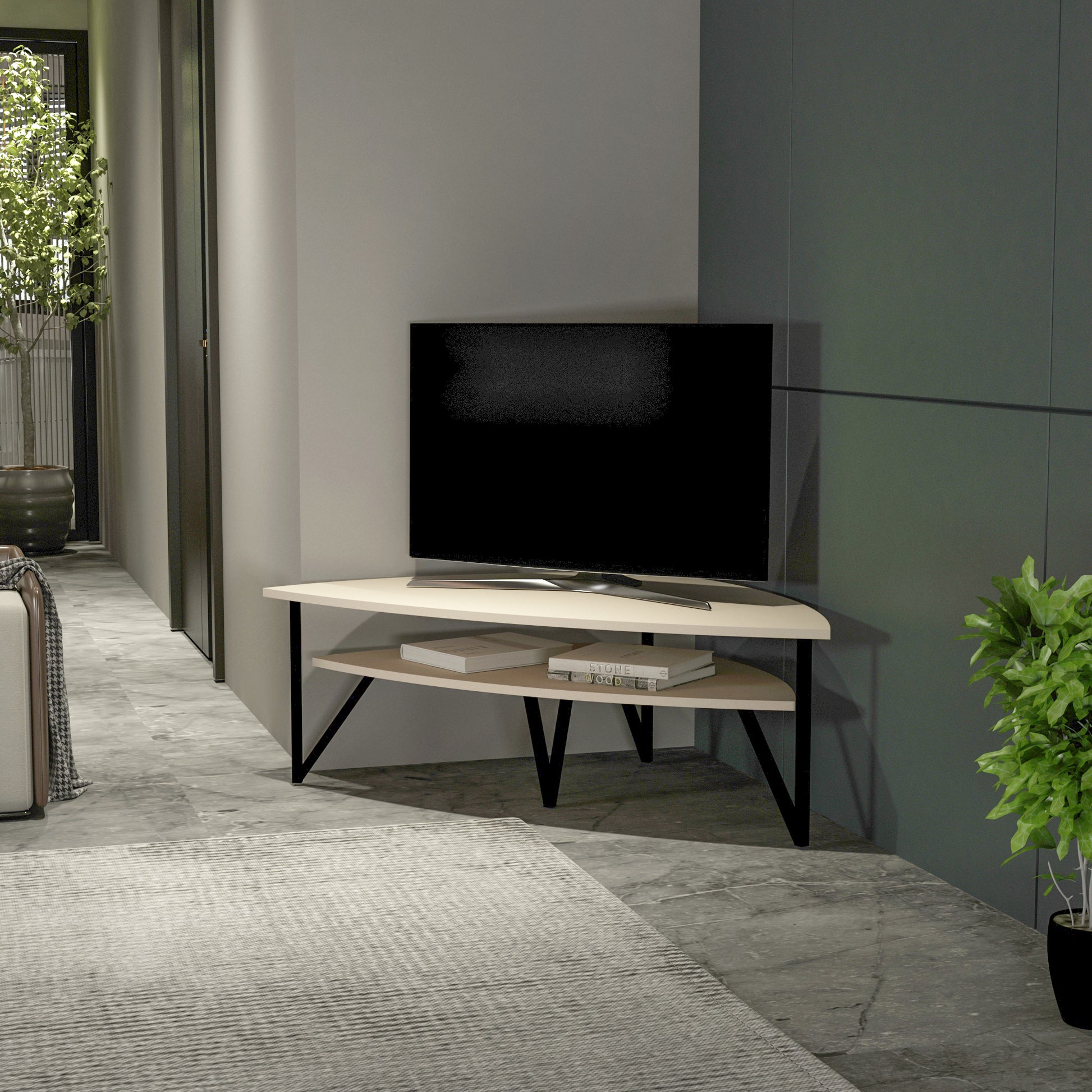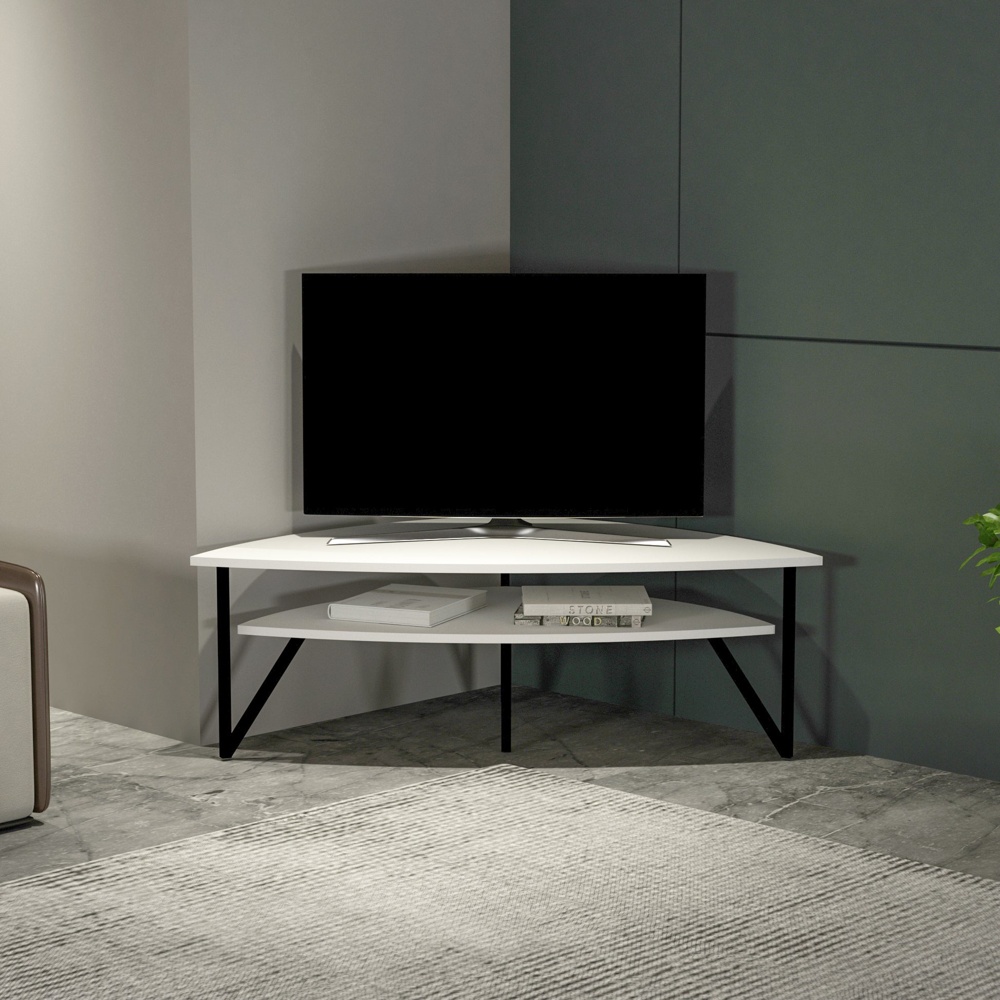 The Galen Corner TV Stand Entertainment Center is a modern and stylish addition to any living room. With specially designed 3 iron metal legs and a wide open shelf, this stand can accommodate flat-screen TVs up to 56 inches. Made of high-quality 18 mm thick particleboard with a water-resistant surface and PVC edges, it offers both durability and style. Perfect for corner use, it's a functional and elegant choice for any home.