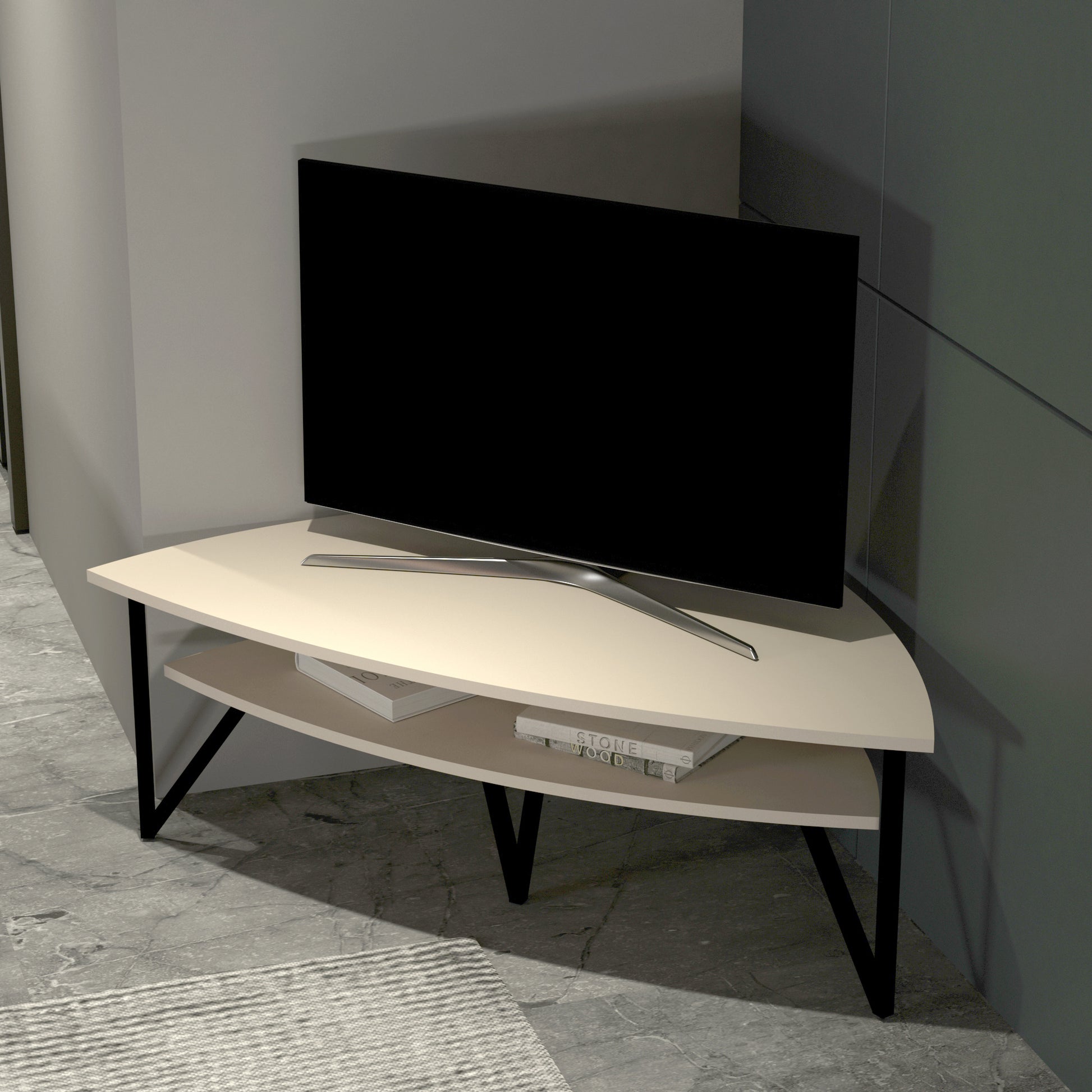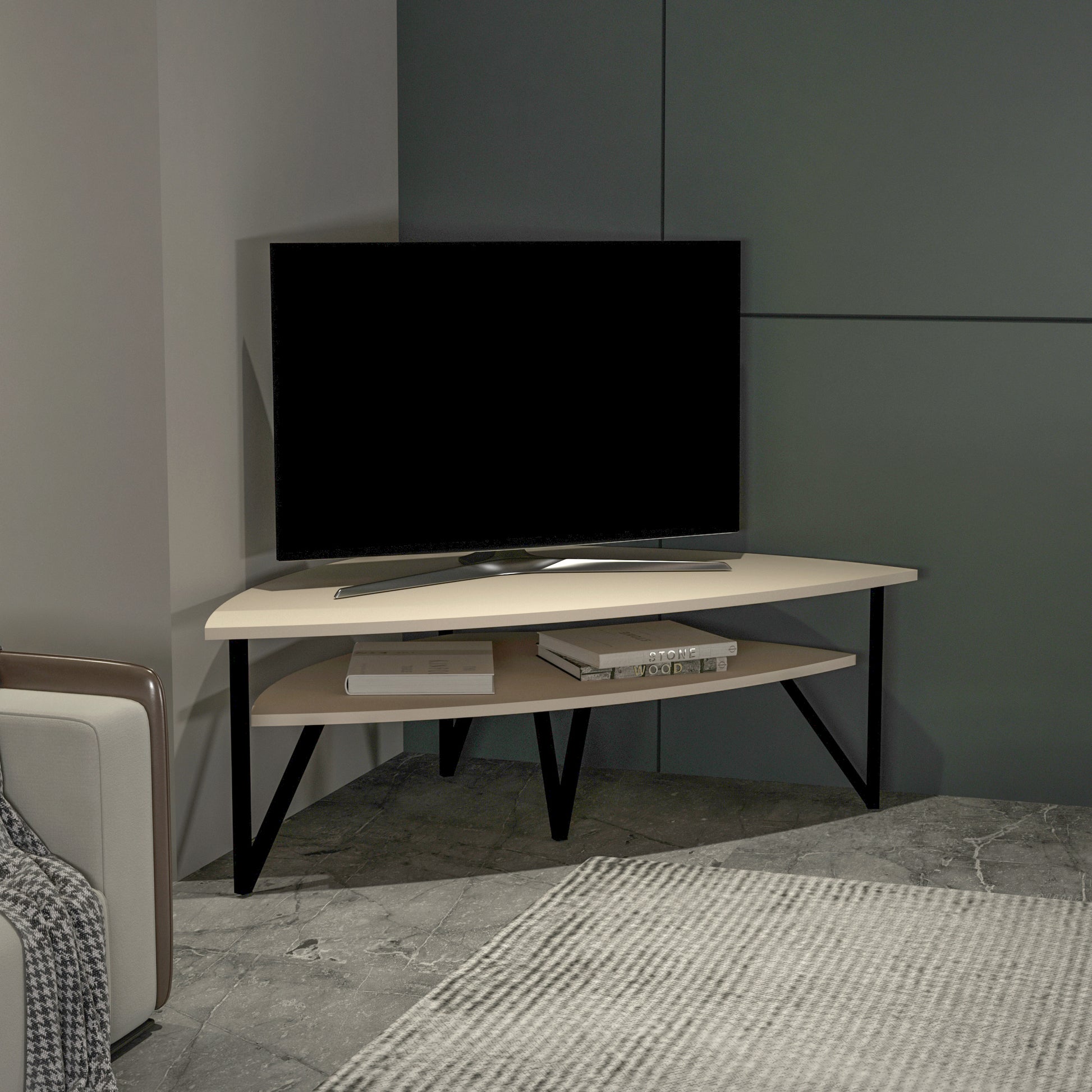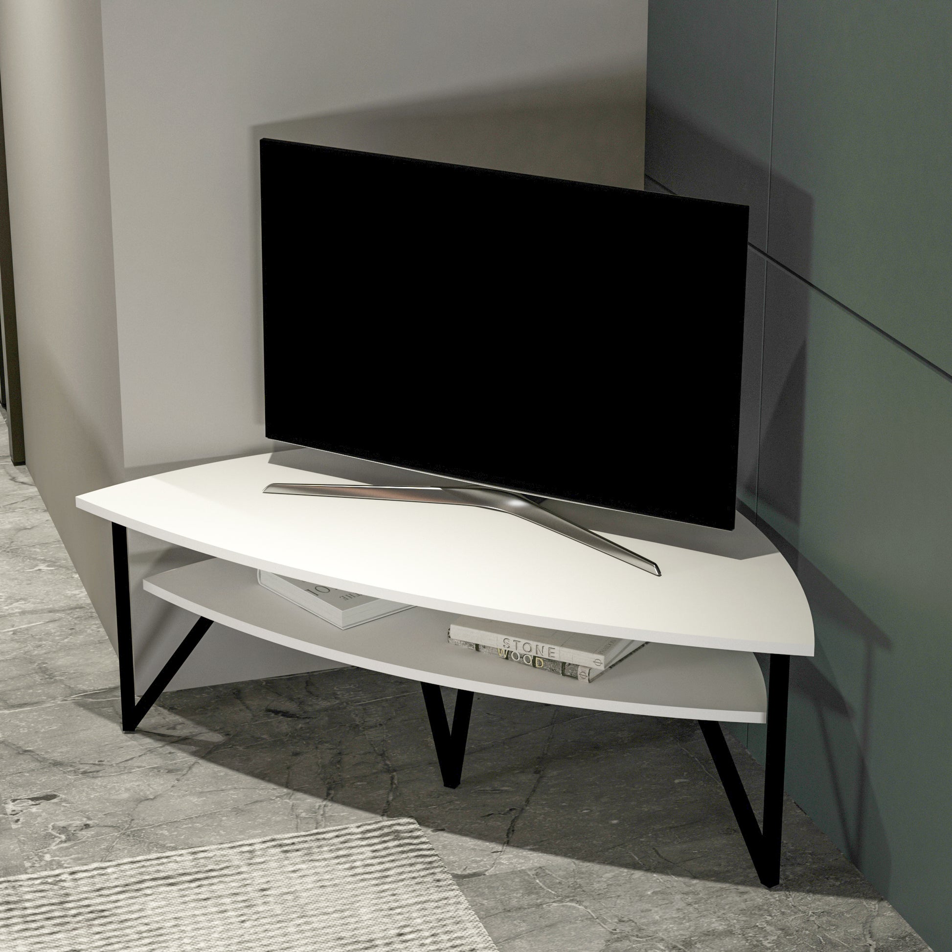 The Galen Corner TV Stand Entertainment Center is a modern and stylish addition to any living room. With specially designed 3 iron metal legs and a wide open shelf, this stand can accommodate flat-screen TVs up to 56 inches. Made of high-quality 18 mm thick particleboard with a water-resistant surface and PVC edges, it offers both durability and style. Perfect for corner use, it's a functional and elegant choice for any home.