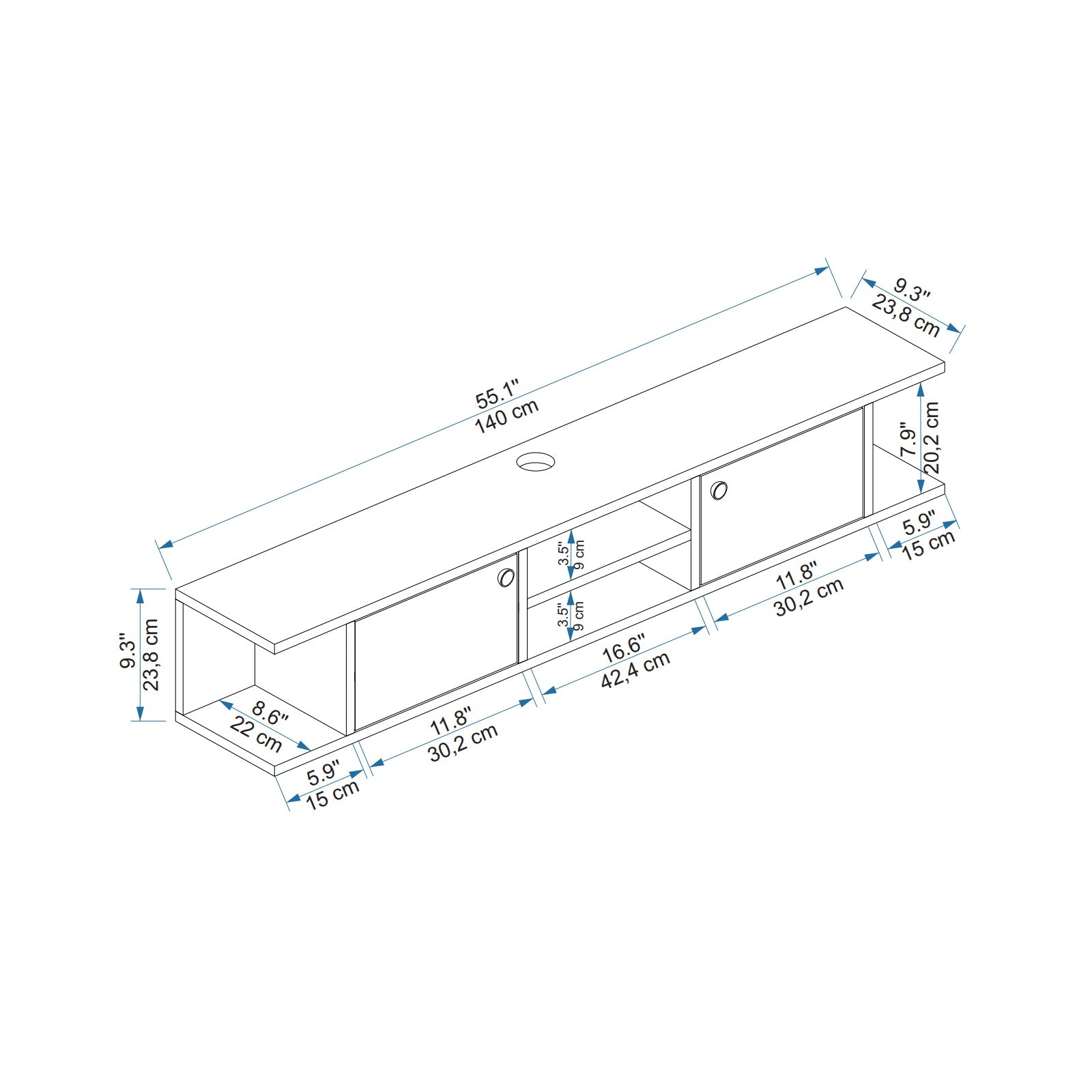 HEIGHT: 9.3" / 23.8 cm | WIDTH: 55.1" / 140 cm | DEPTH: 9.3" / 23.8 cm.