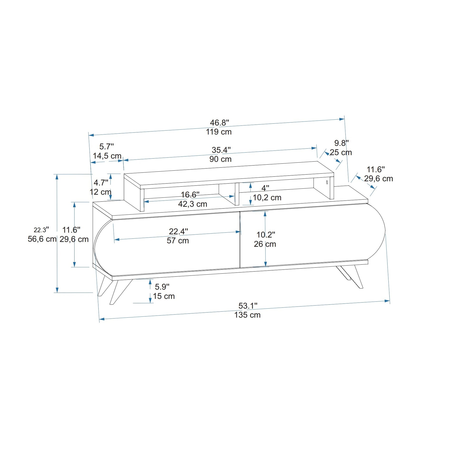 HEIGHT: 22.3" / 56.6 cm | WIDTH: 53.1" / 135 cm | DEPTH: 11.6" / 29.6 cm.