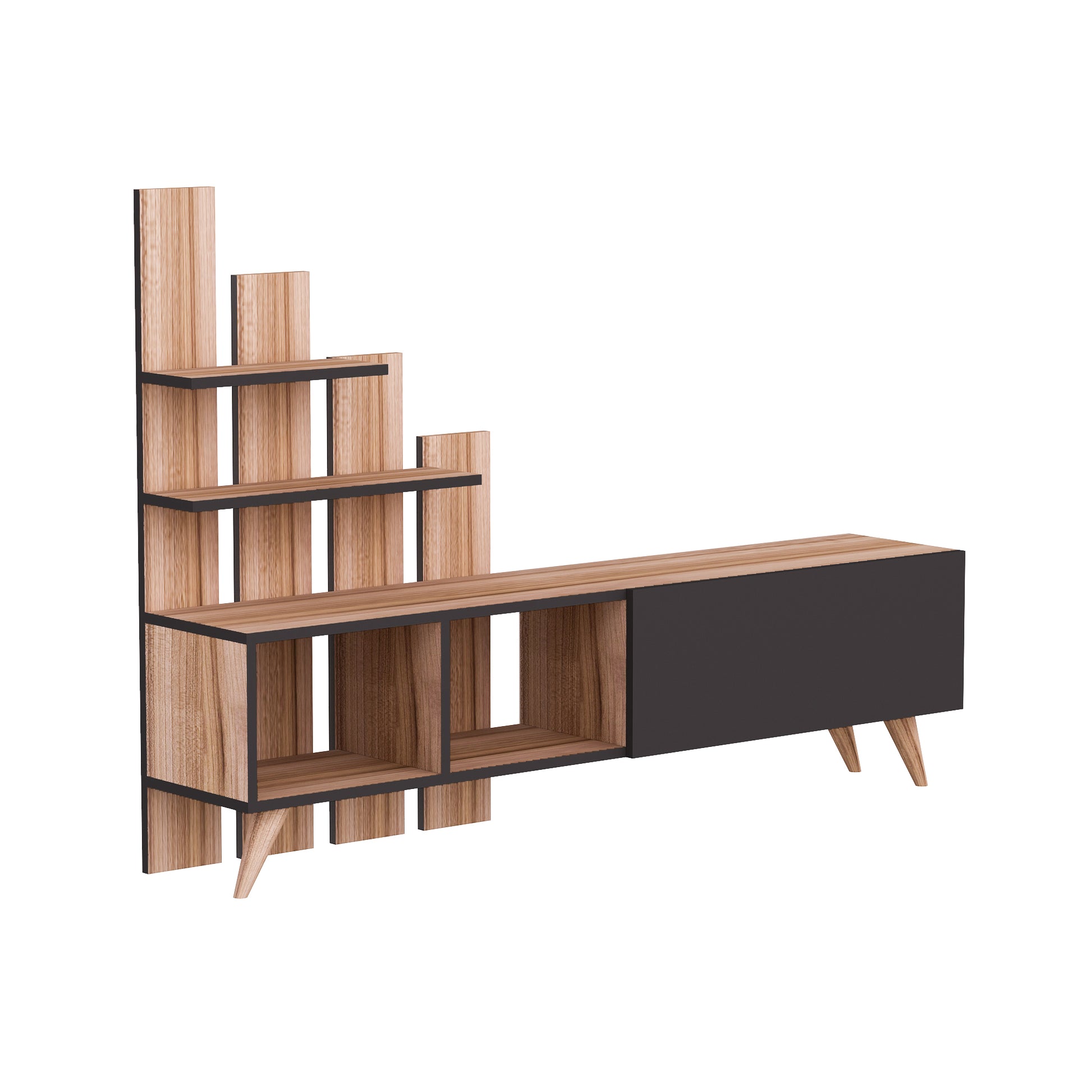 A mix of solid manufactured dark oak & anthracite, coated with melamine veneer furniture will provide you with a comfortable TV view or entertainment center. Mable has a side-shelving unit and it offers closed and open storage rooms for books, DVDs, or media.