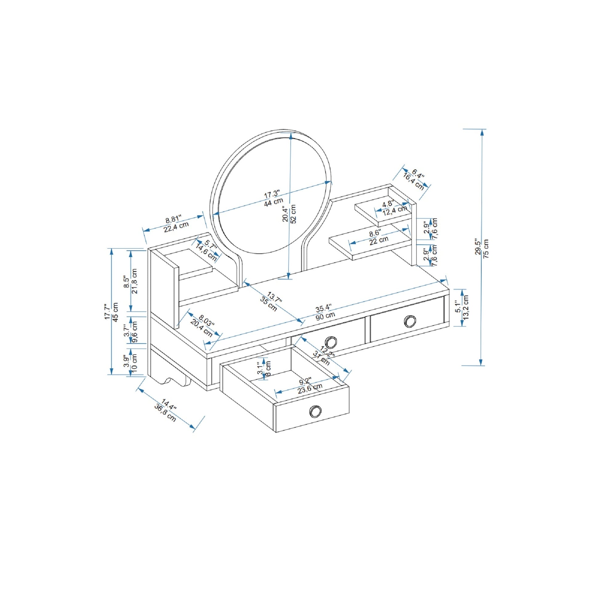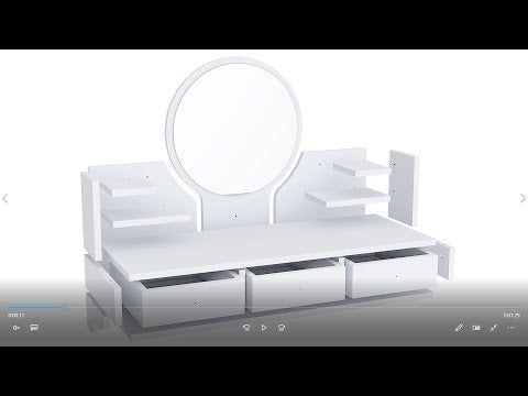 This brand-new makeup vanity table with a mirror is perfect for modern beauty enthusiasts. Wall-mounted for convenient use, it features a framed mirror, 4-tier open shelves, and 3 drawers for closed storage. Made of durable 18 mm thick particleboard with a water-resistant melamine veneer finish and banded edges, it comes with wall mounting hardware and assembly instructions for easy setup. Expertly crafted in Türkiye with a sleek and functional design.
