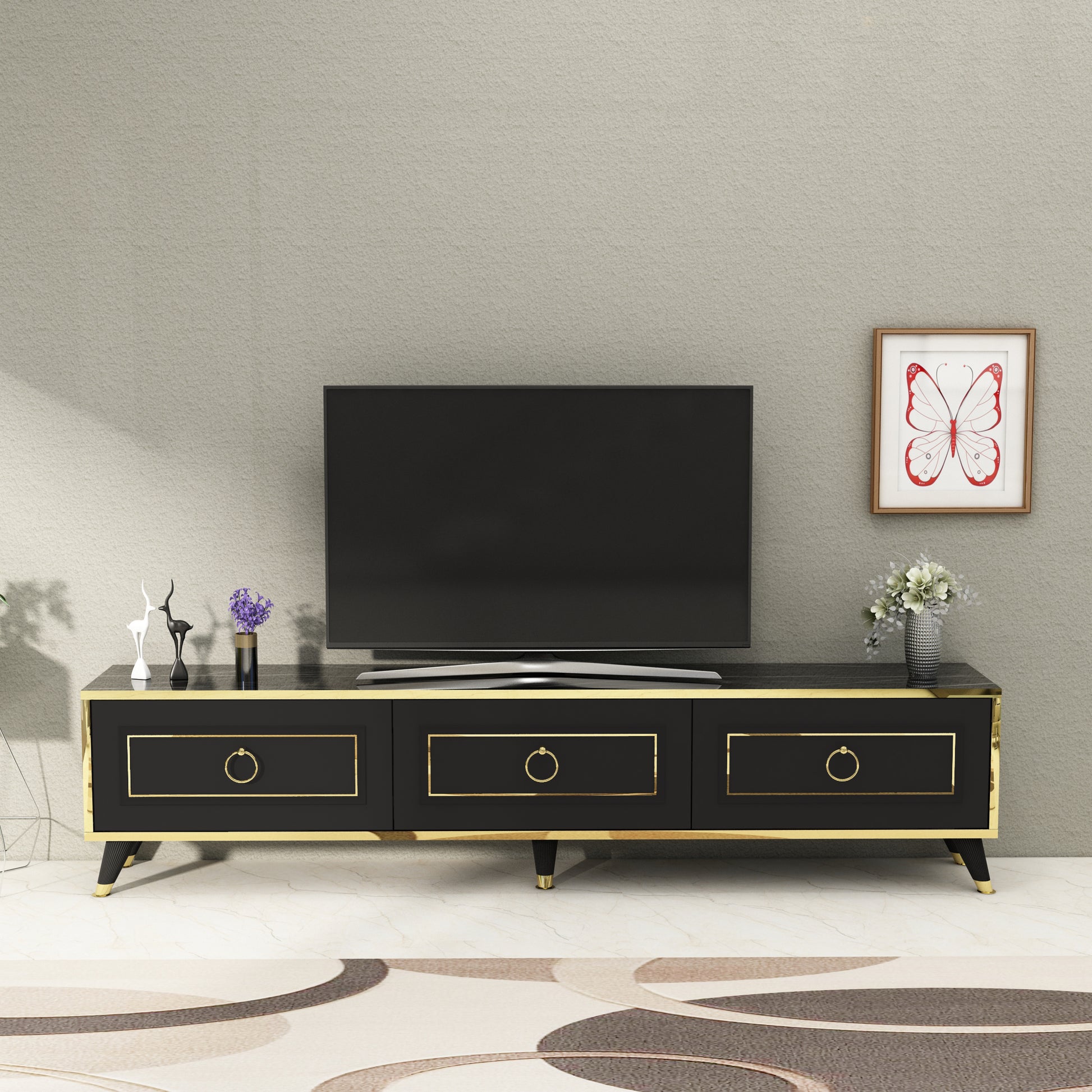 Make your living room the envy of the neighbourhood with this 180 cm wide TV stand with storage cabinets. The entertainment centre accommodates flat-screen TVs up to 78 inches and boasts three closed cabinets and a water-resistant surface. Made with an 18 mm thick particleboard and finished with a melamine veneer, its stability is ensured with quality round iron metal handles, PVC edge banding, and solid plastic legs.