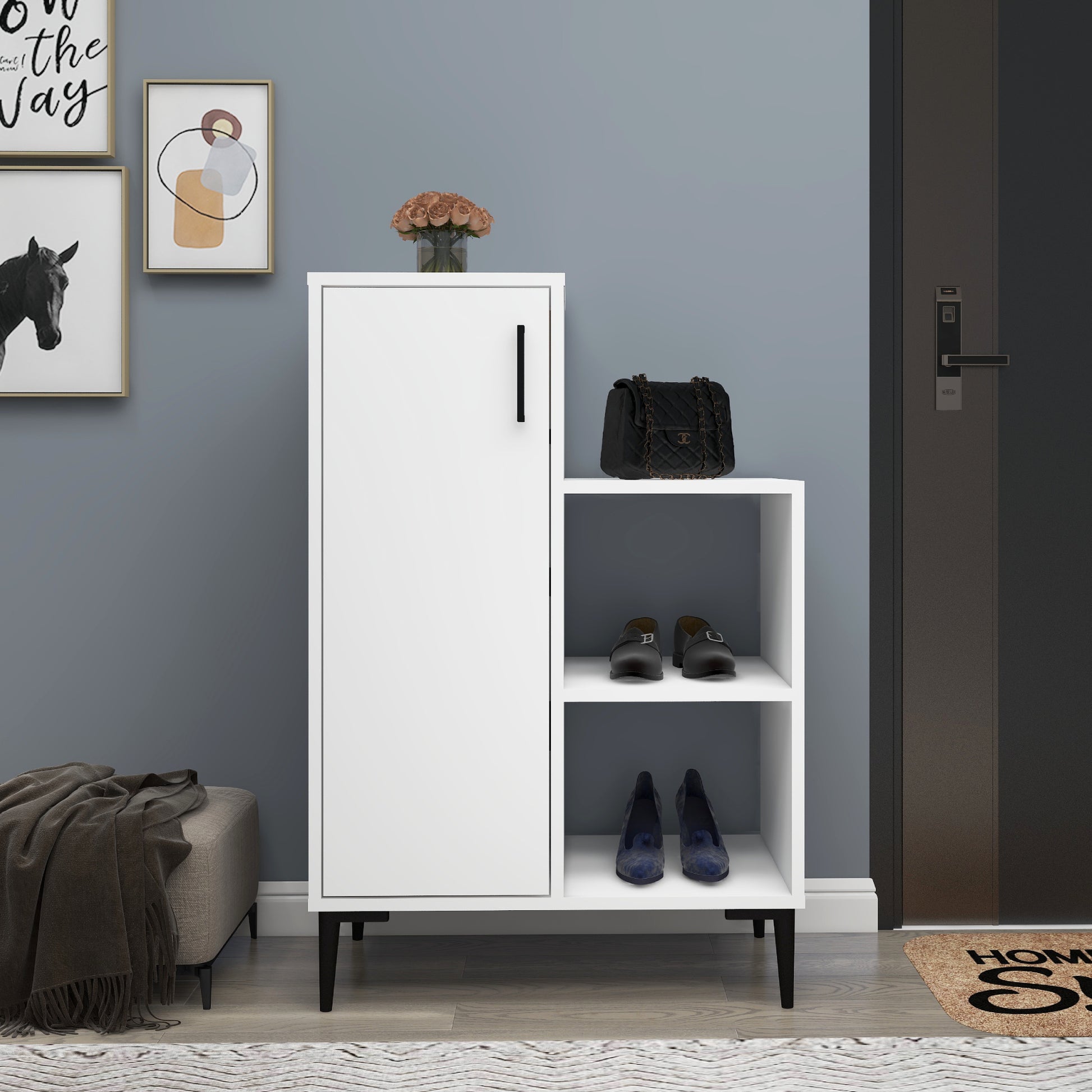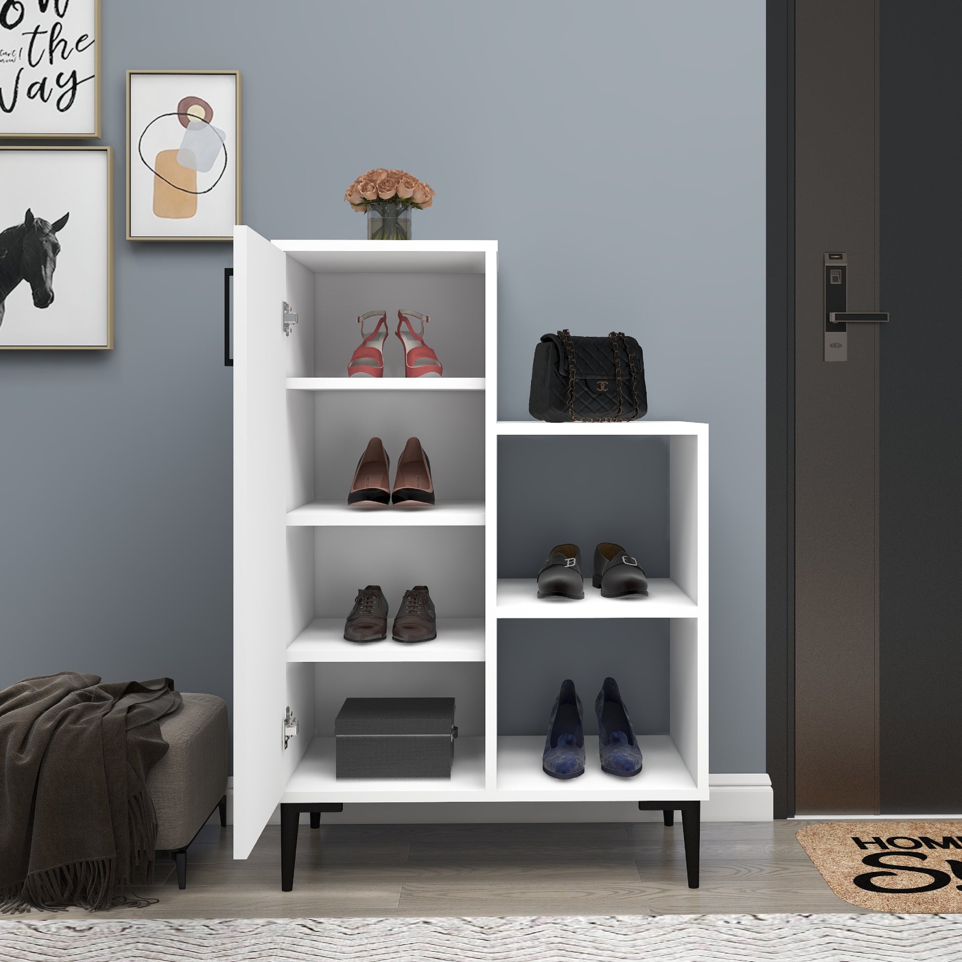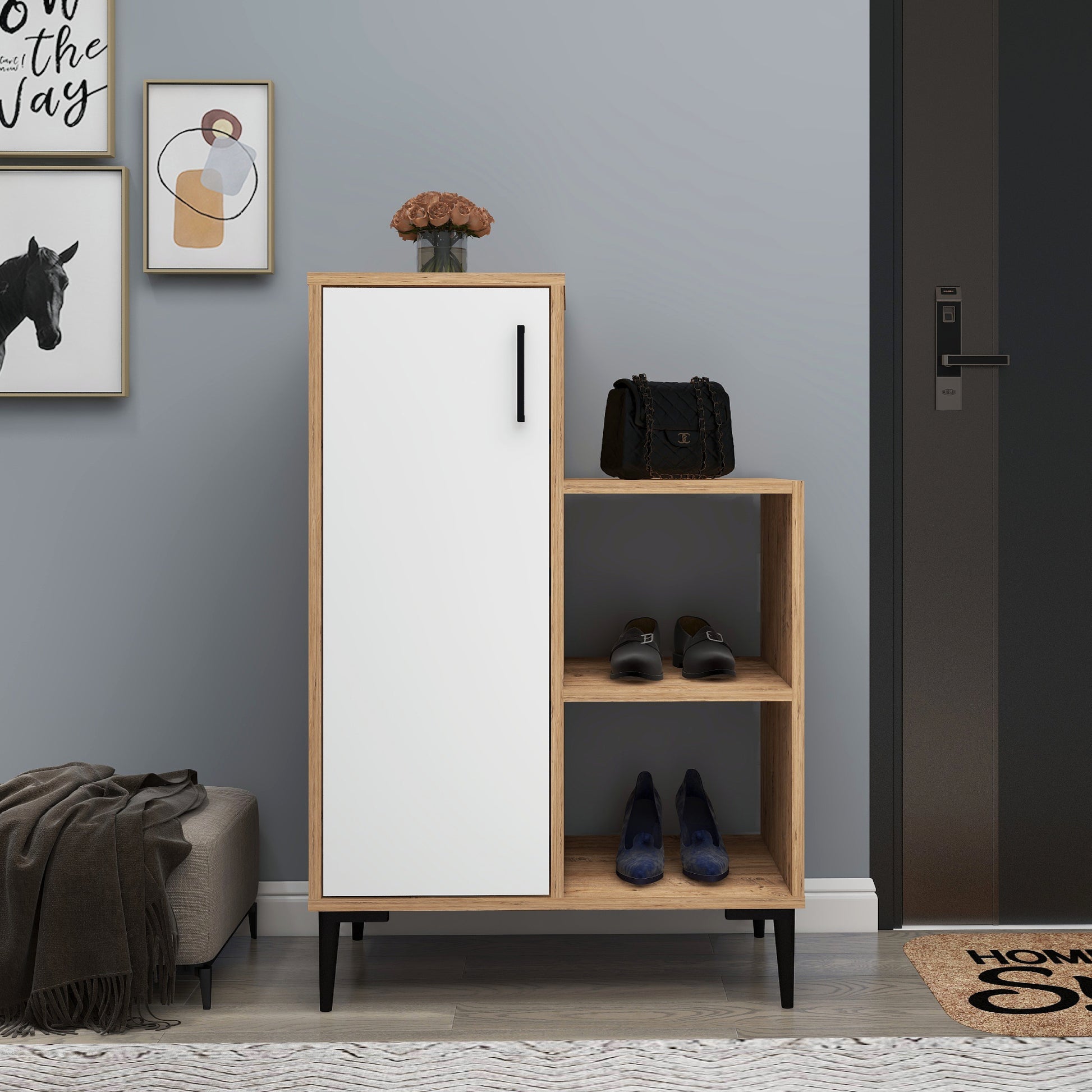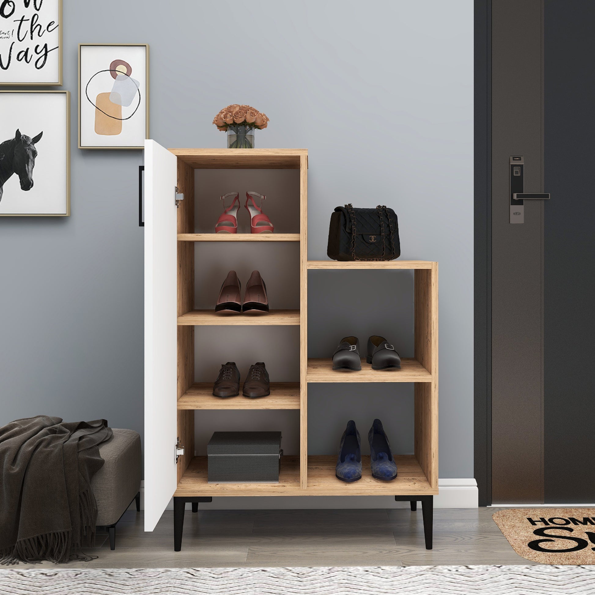 Expertly store your shoes and keep your home clutter-free with the Beate Shoe Storage Shelf with Cabinet. This contemporary storage unit features 2 open shelves and a cabinet with 4 interior shelves, providing ample space for all your footwear needs. Made of durable 18 mm thick particleboard with a melamine veneer finish and PVC edge banding, this shoe shelf is built to last. Plus, with 4 quality plastic legs and a plastic door handle, it's both sturdy and stylish.