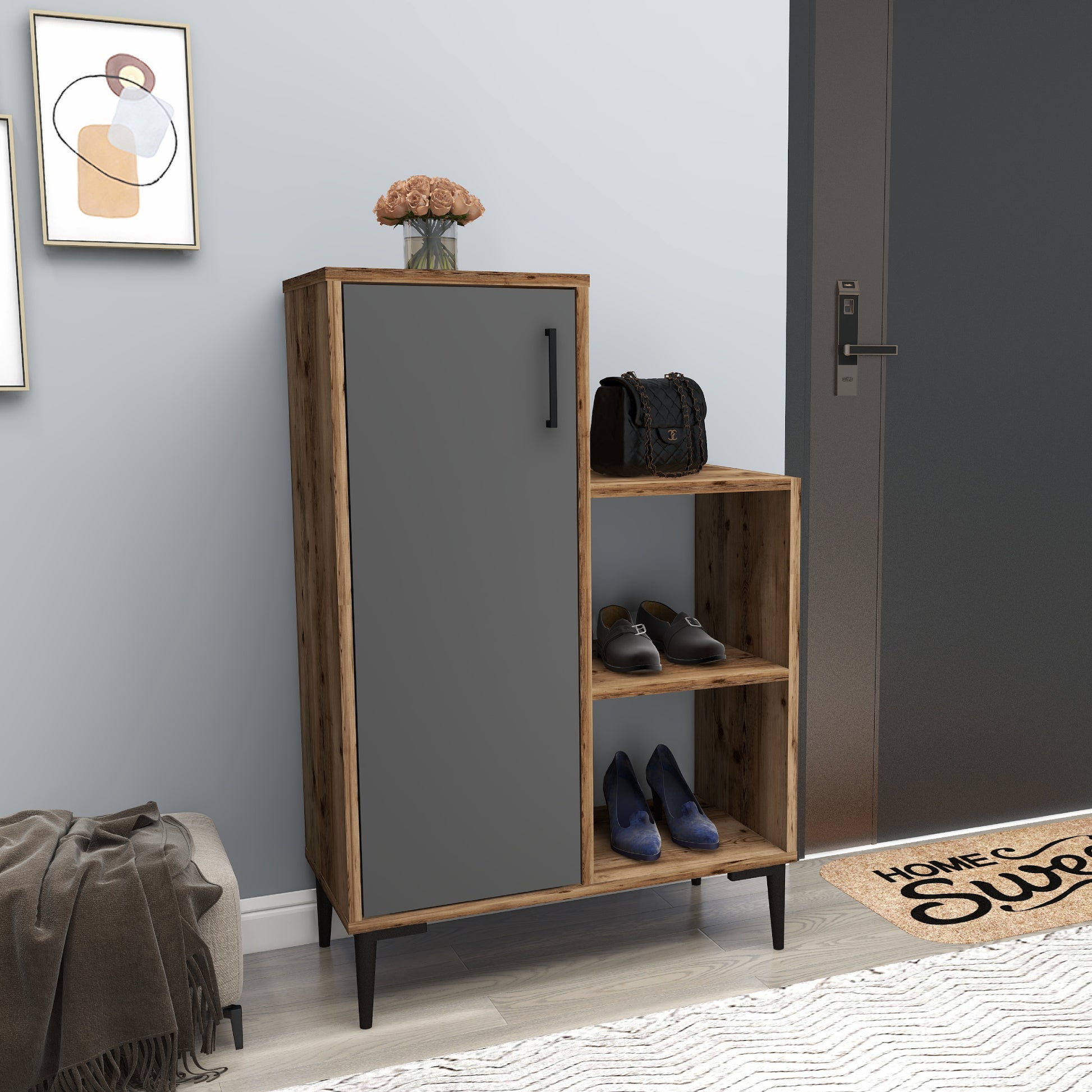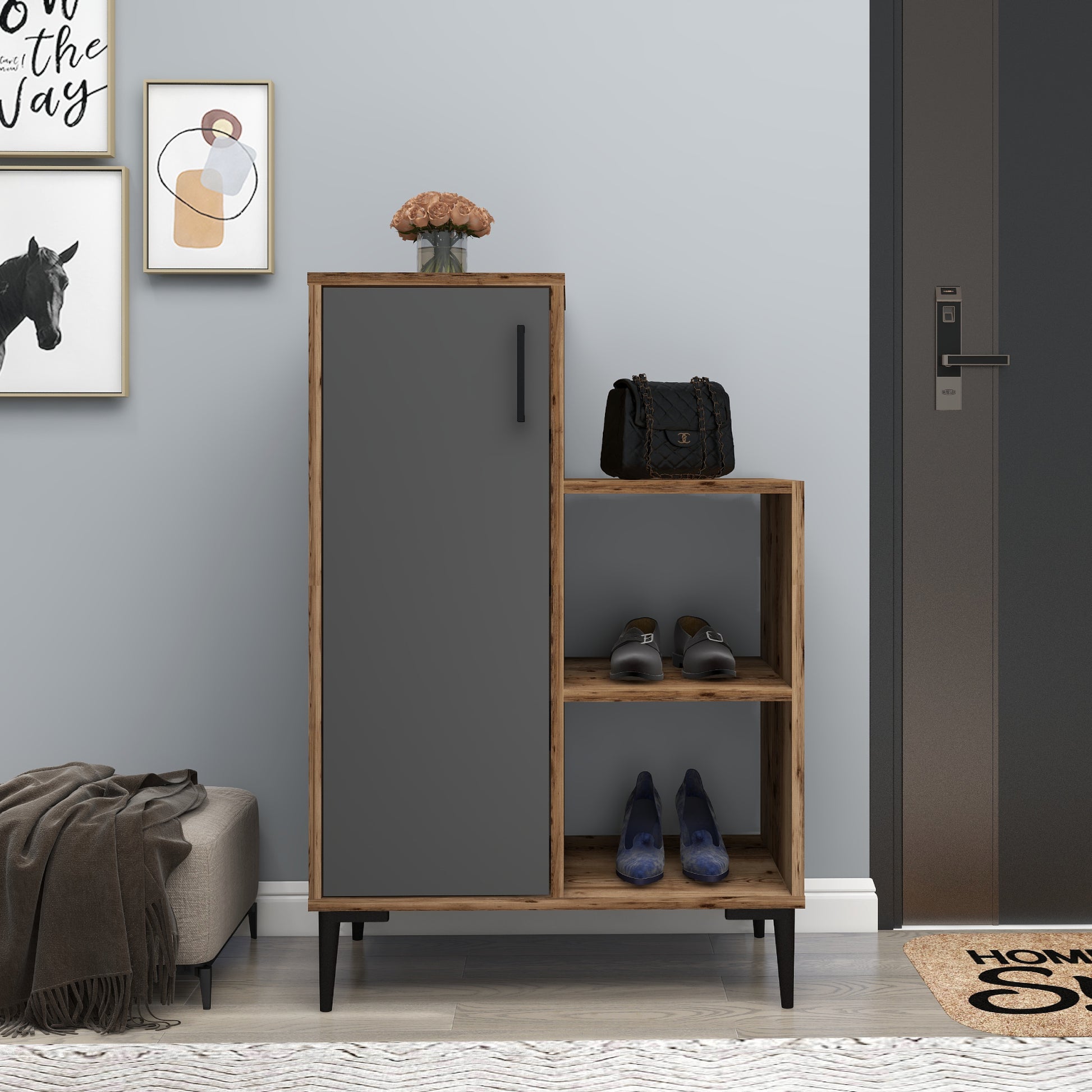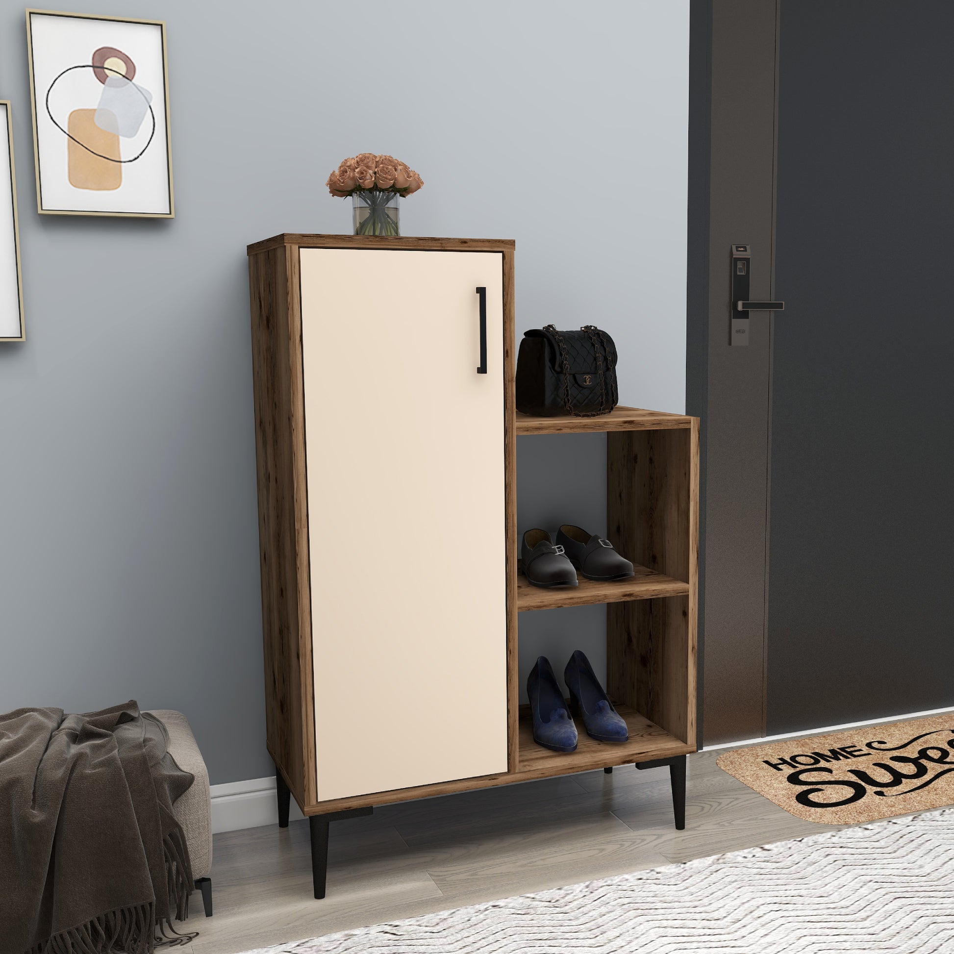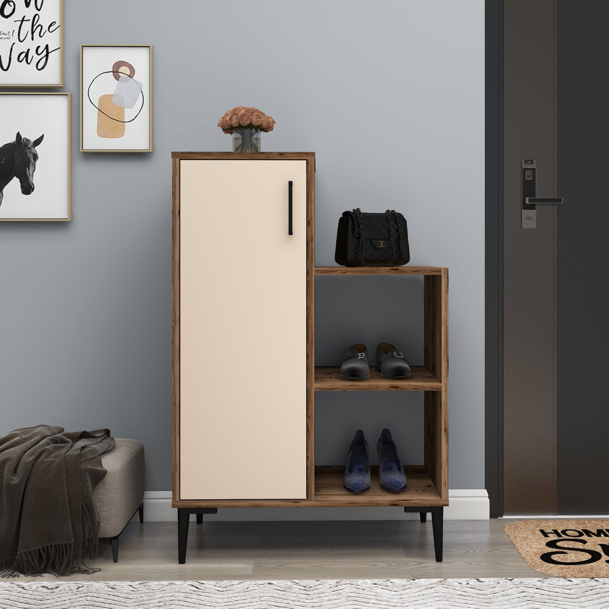 Expertly store your shoes and keep your home clutter-free with the Beate Shoe Storage Shelf with Cabinet. This contemporary storage unit features 2 open shelves and a cabinet with 4 interior shelves, providing ample space for all your footwear needs. Made of durable 18 mm thick particleboard with a melamine veneer finish and PVC edge banding, this shoe shelf is built to last. Plus, with 4 quality plastic legs and a plastic door handle, it's both sturdy and stylish.