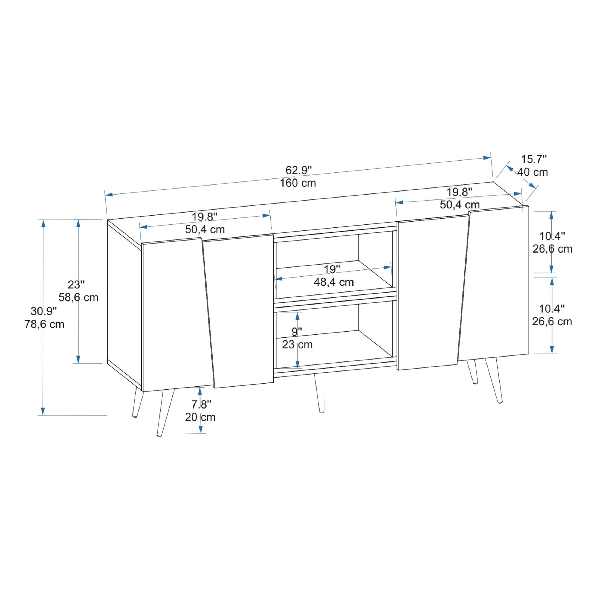 Modern style and functionality to your living space with the Curve Sideboard with Cabinets. This versatile piece can serve as a TV stand while offering ample storage with four cabinets and two open shelves. Crafted with 18 mm thick particleboard and a Melamine veneer finish, this sideboard is both durable and stylish.