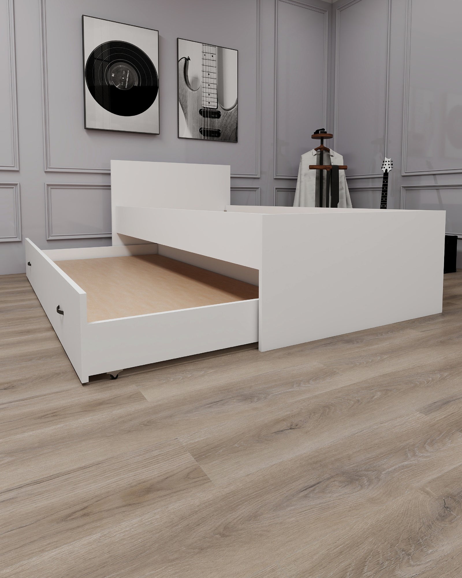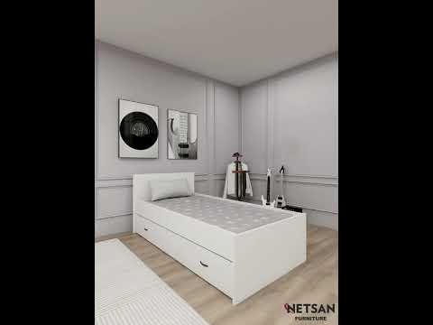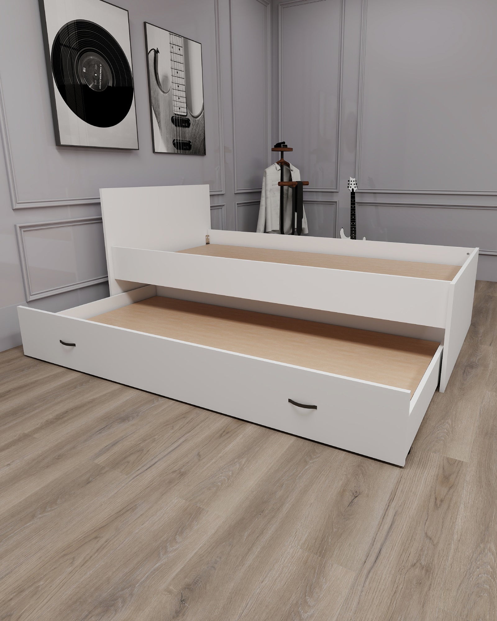 Modern bed frame with integrated bedhead and pull-out guest bed for practical space-saving comfort. The sturdy design includes metal slats, MDF mattress support, metal frame bars, and smooth rolling wheels for easy use. Built from durable 18 mm particleboard with a water-resistant melamine finish and PVC edge banding, it offers strength, style, and everyday functionality. Designed to fit a 90x190 cm top mattress and a 90x180 cm guest mattress. Ideal for guest rooms or compact living spaces.