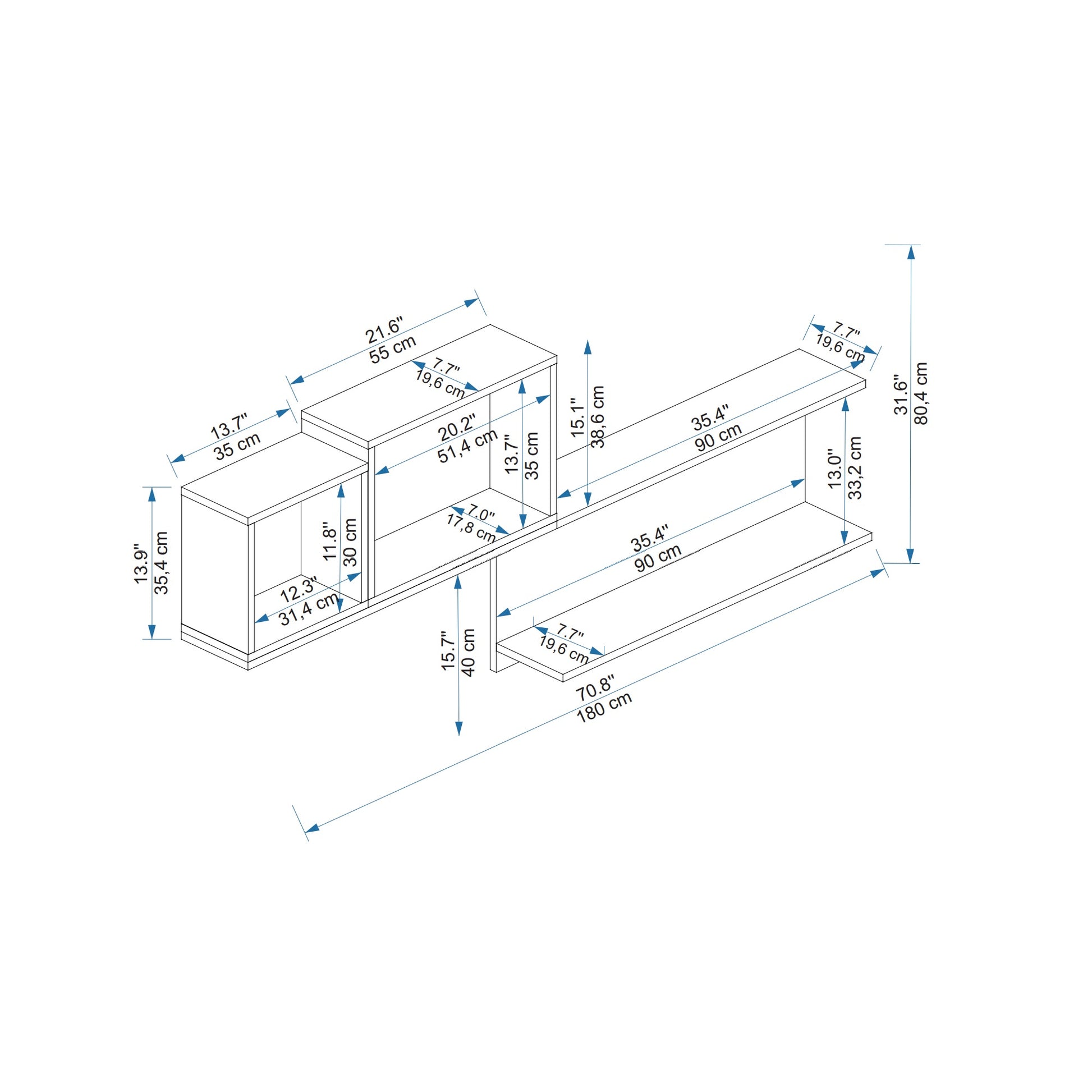 HEIGHT: 31.6" / 80.4 cm | WIDTH: 70.8" / 180 cm | DEPTH: 7.7" / 19.6 cm.